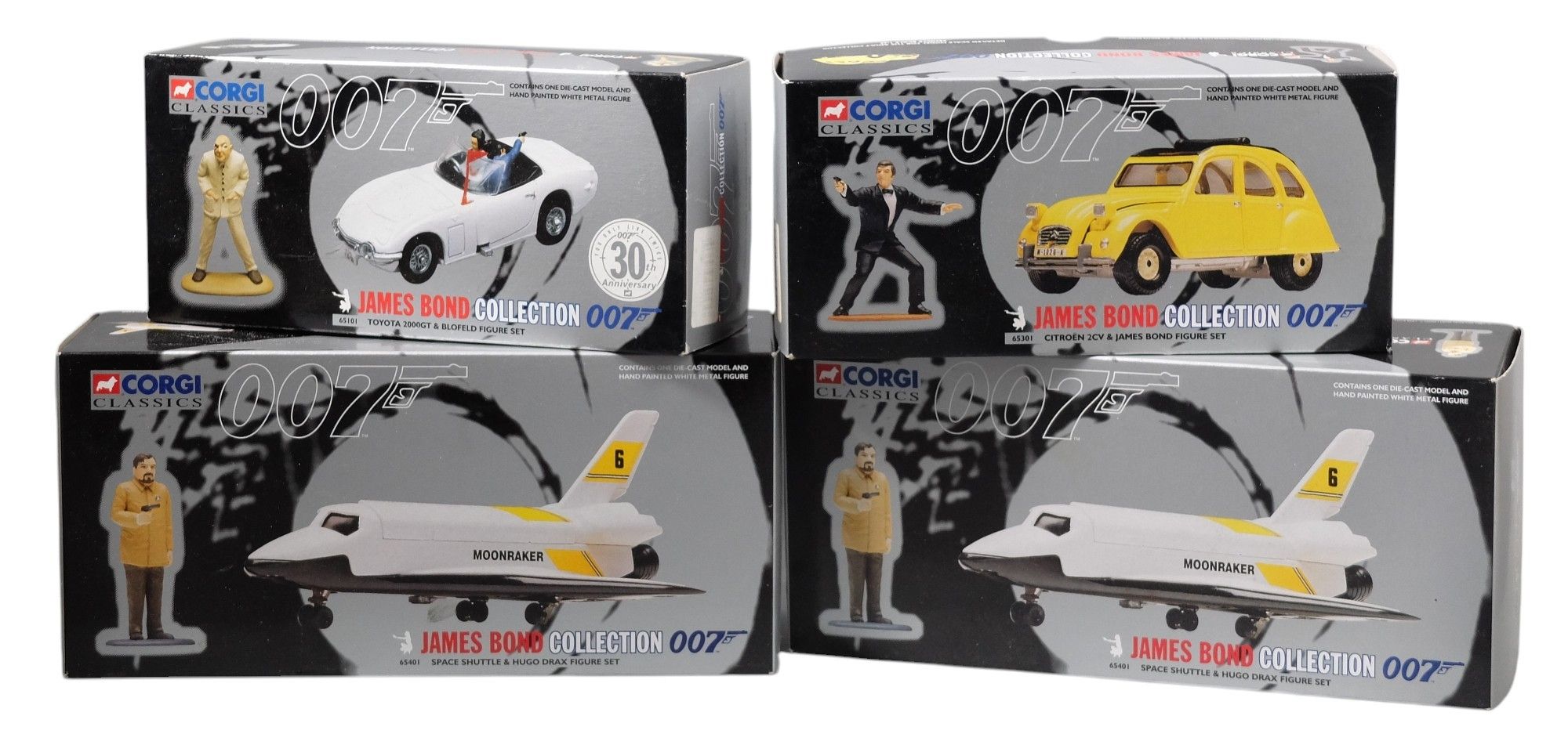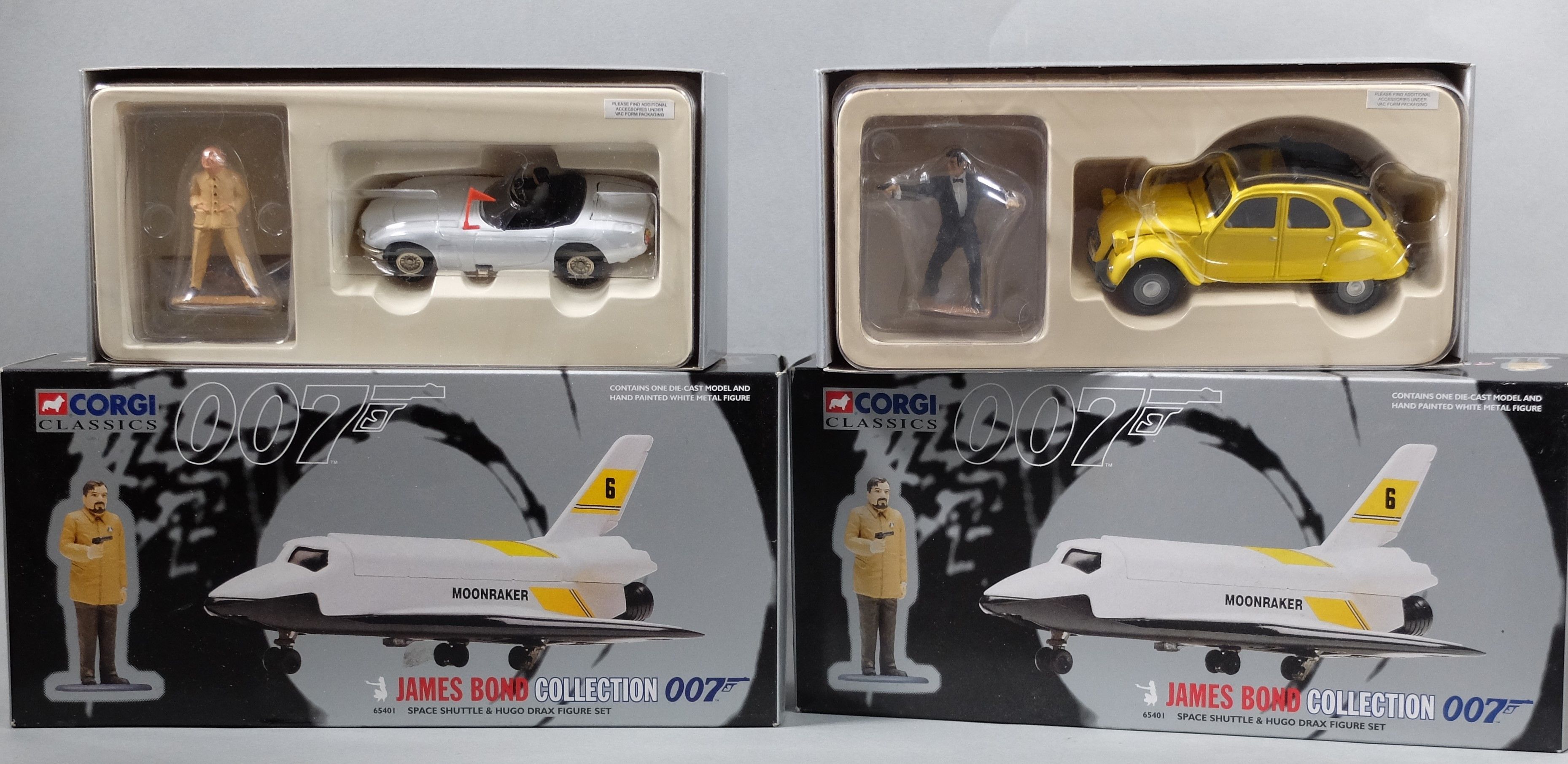 CORGI TOYS CLASSICS - 007 - Set including 2 SPACE SHUTTLE & HUGO DRAX FIGURE SET, CITROEN 2CV & JAMES BOND FIGURE SET and TOYOTA 2000GT & BLOFELD FIGURE SET, BOXES.