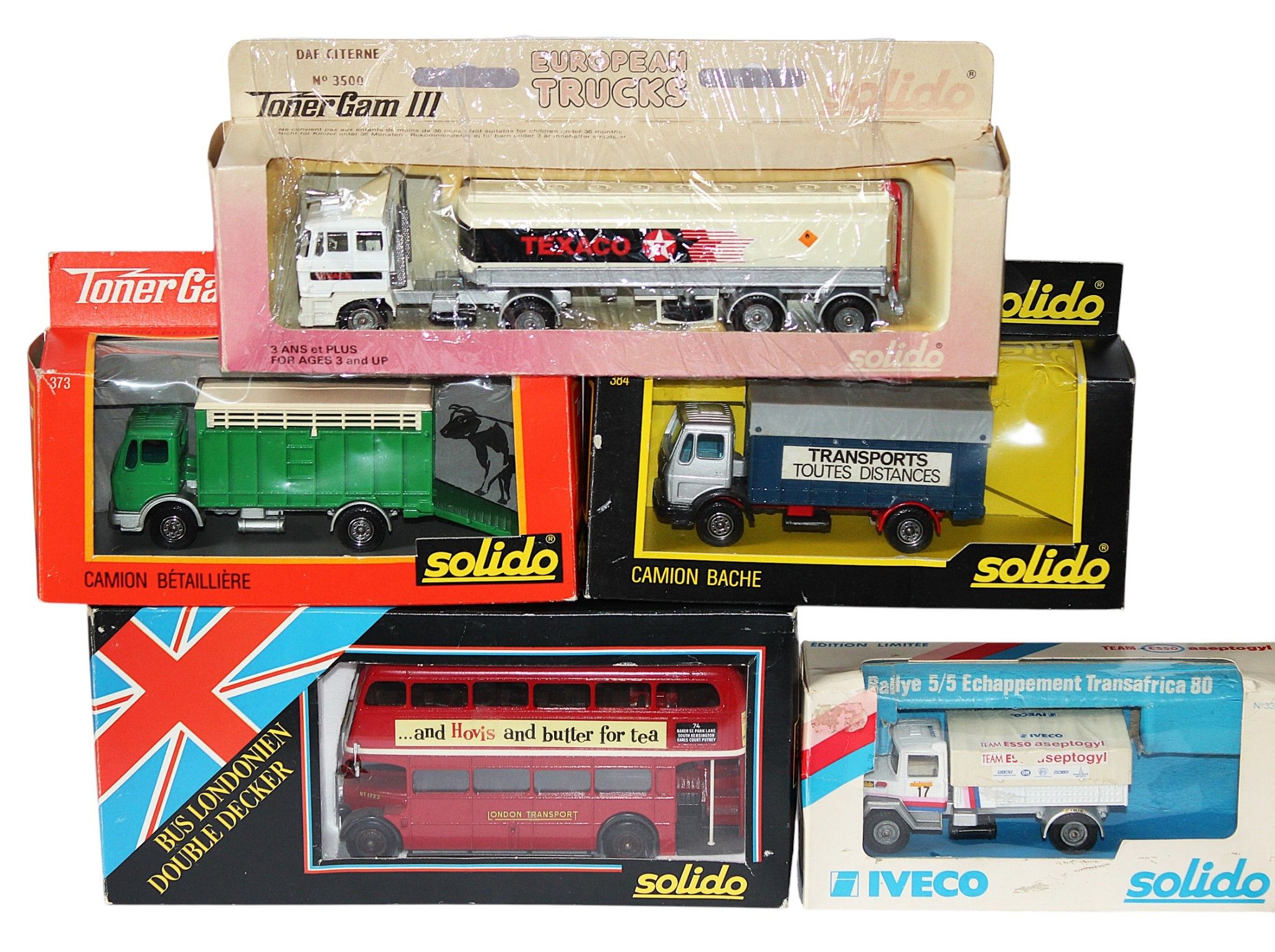 SOLIDO - 1/43 - 5 LONDON GOODS TRUCKS and BUSES, ref: 373, 384, 3307, 3500 and 4402, BOXES (worn and one in poor condition).