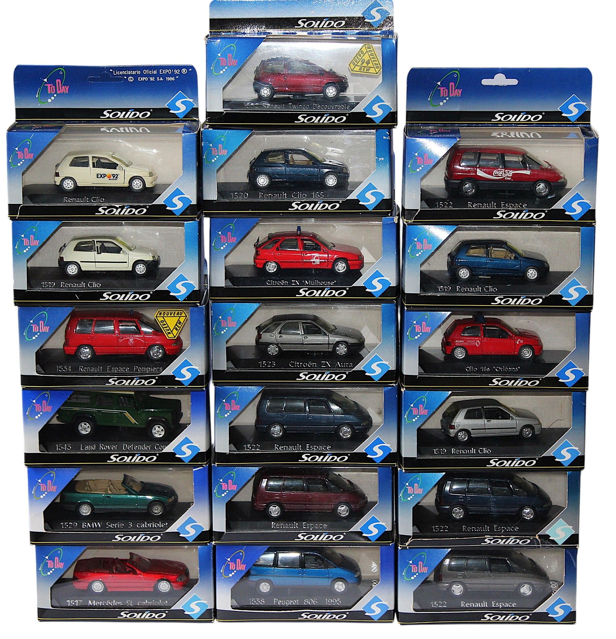 SOLIDO S series TO DAY - 1/43 - Set comprising 16 CARS of various makes including RENAULT & CITROEN, mainly CLIO & ESPACE models, crystal BOXES and cardboard OVERBOOKS (tears). Joint of the same model: 3 CARS BMW, MERCEDES & LAND ROVER, BOXES.