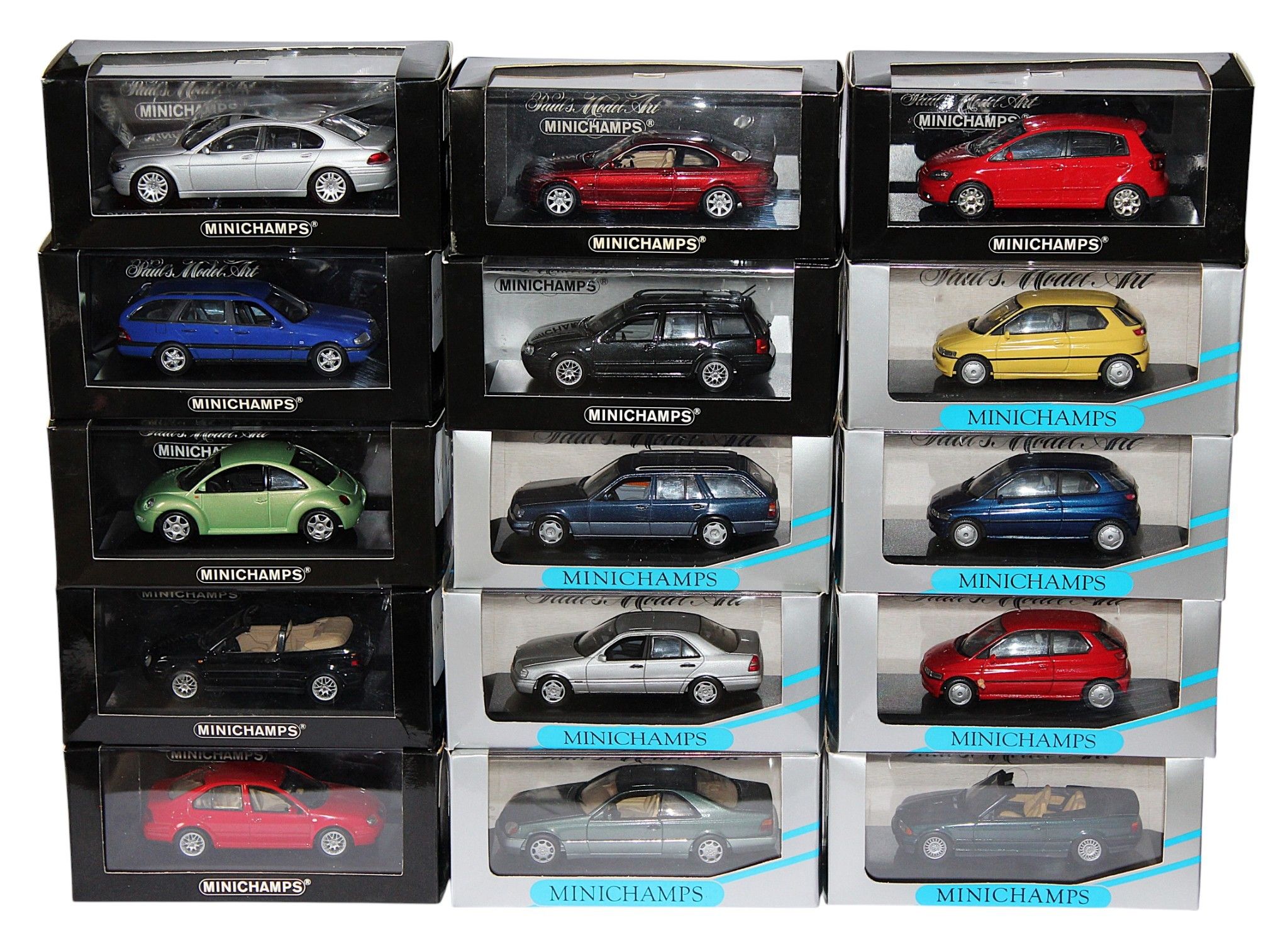 MINICHAMPS series PAUL'S MODEL ART - 1/43 - Set including 15 CARS from BMW, MERCEDES & VOLKSWAGEN including models GOLF, 318CI, 600SEC & C280, crystal BOXES and cardboard OVERBOARDS.
