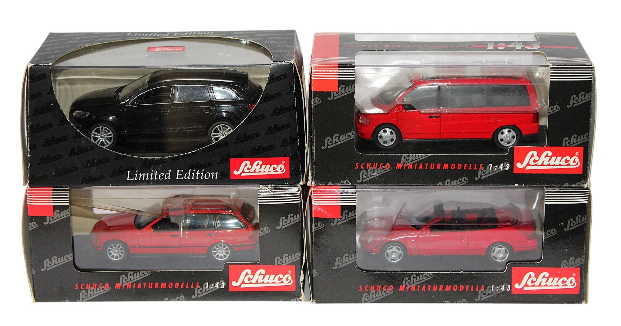 SCHUCO - 1/43 - Set of 4 AUDI, BMW & MERCEDES BENZ CARS including models : Q7, 328I TOURING, CLK CABRIOLET and V230, crystal BOXES and cardboard BOXES...