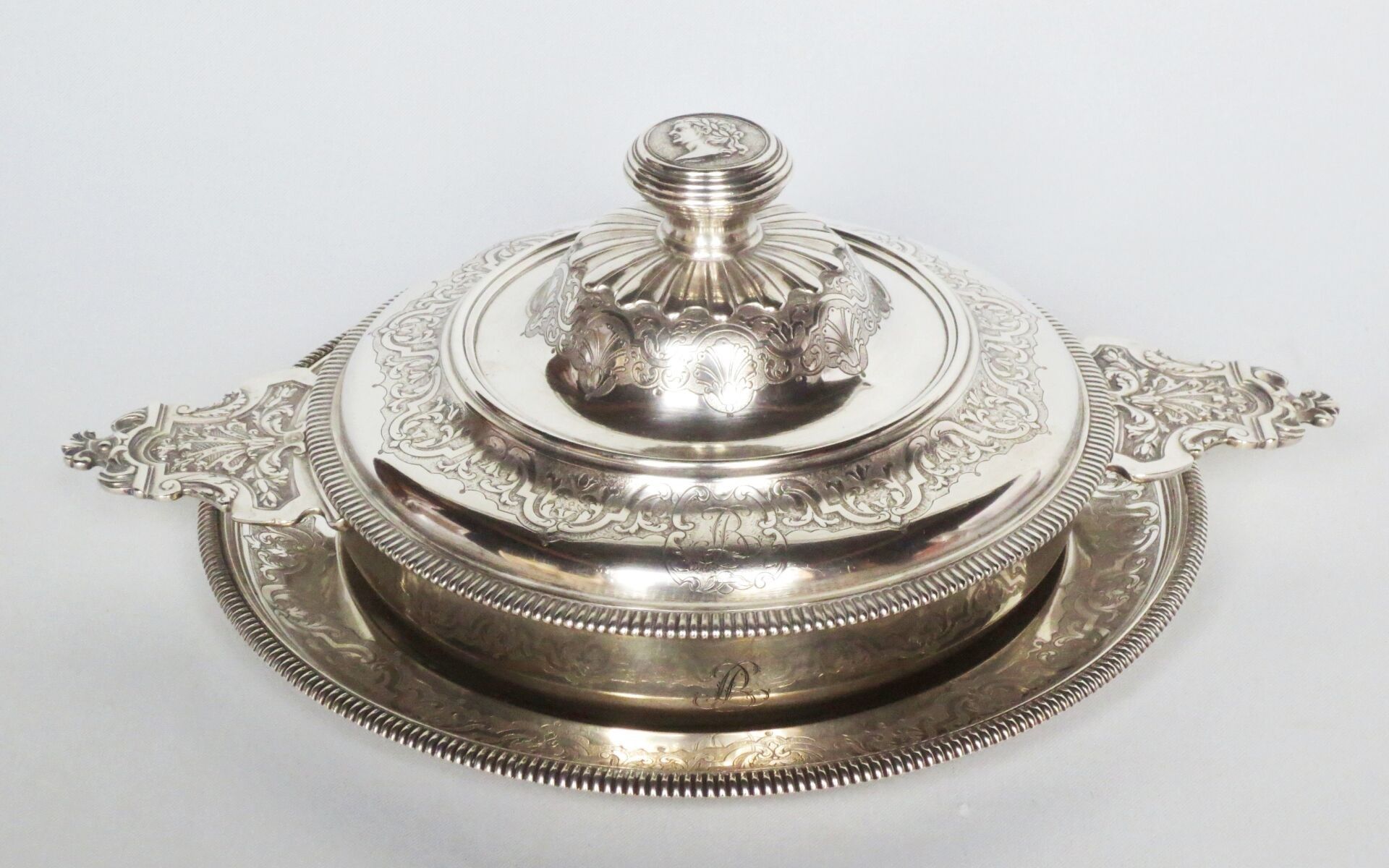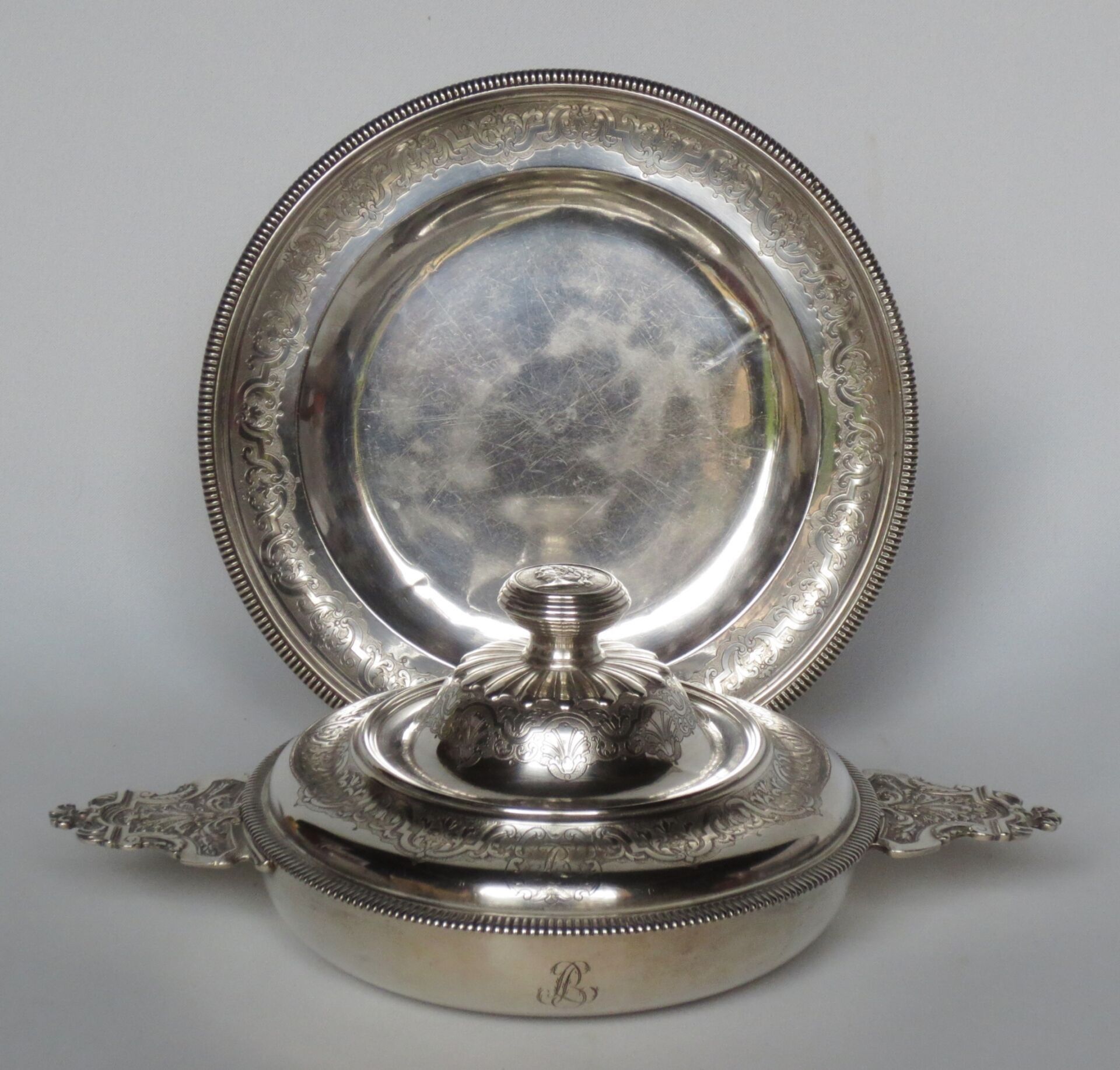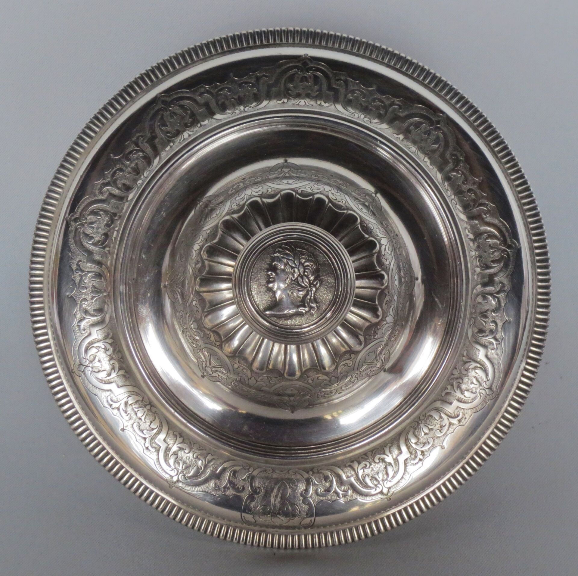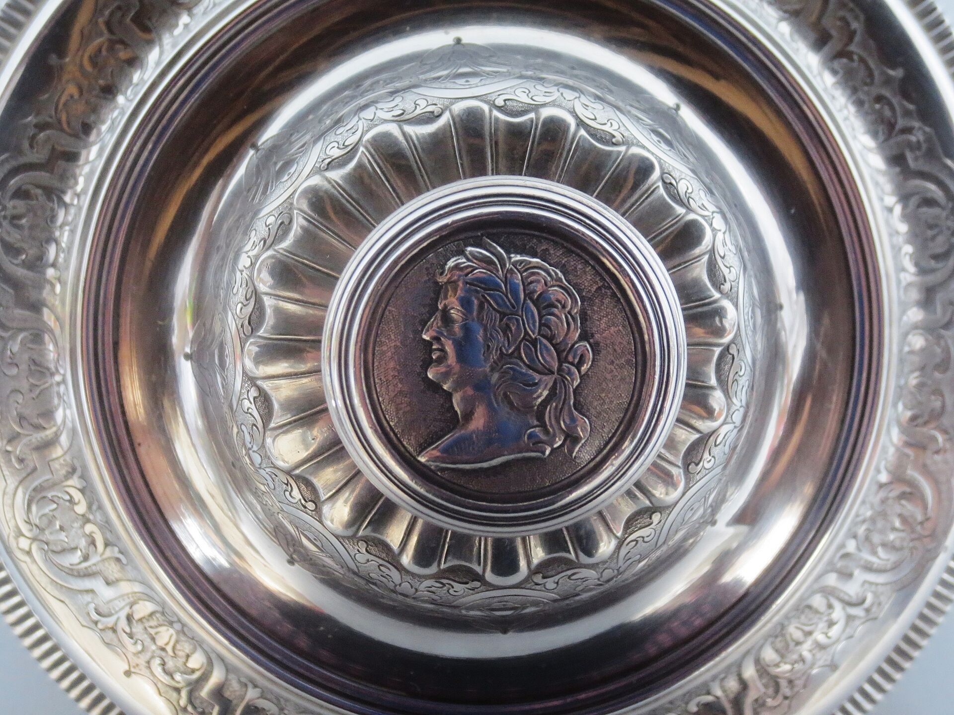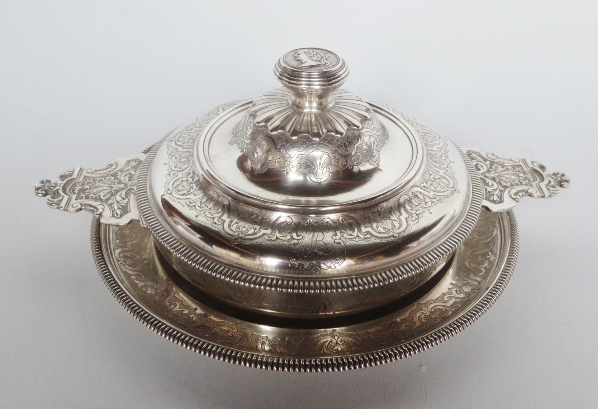 A Régence style silver bowl, hallmarked Minerve, richly decorated with friezes of foliate scrolls and palmettes on an amati background. The rim of the bowl is decorated with large shells and accolades ending in a fleuron. The lid is crowned with a moulded knob engraved with an antique profile. The whole is underlined by a frieze of gadroons.