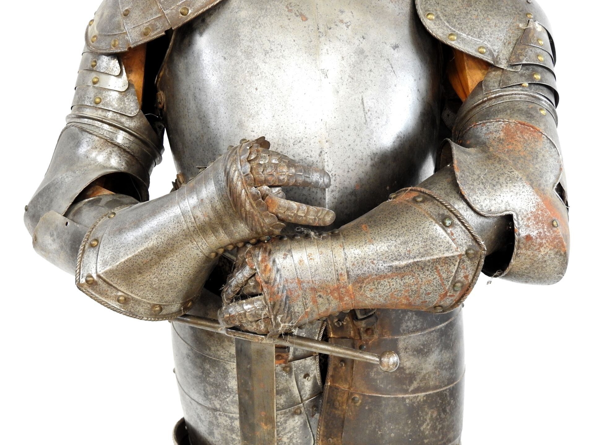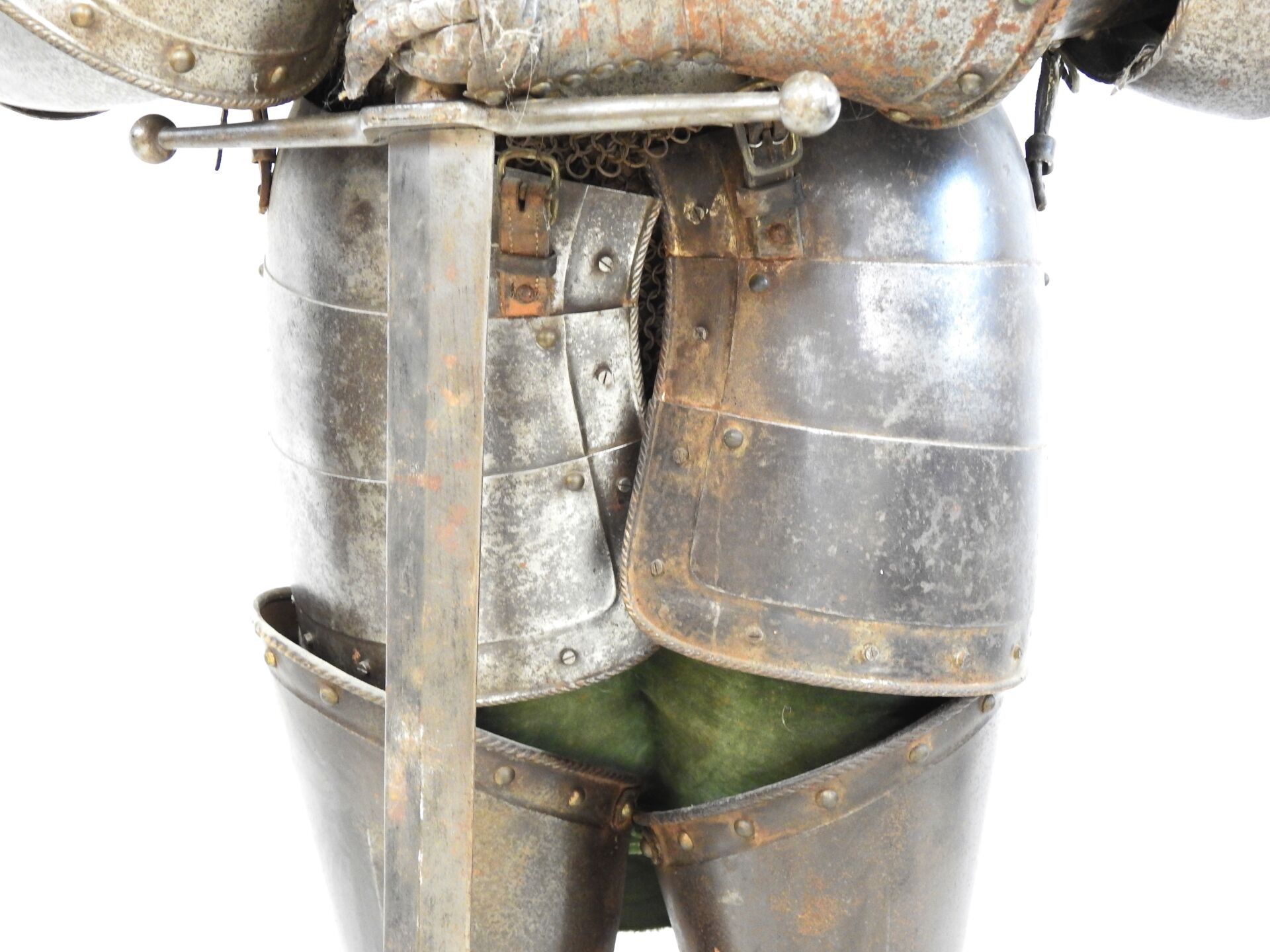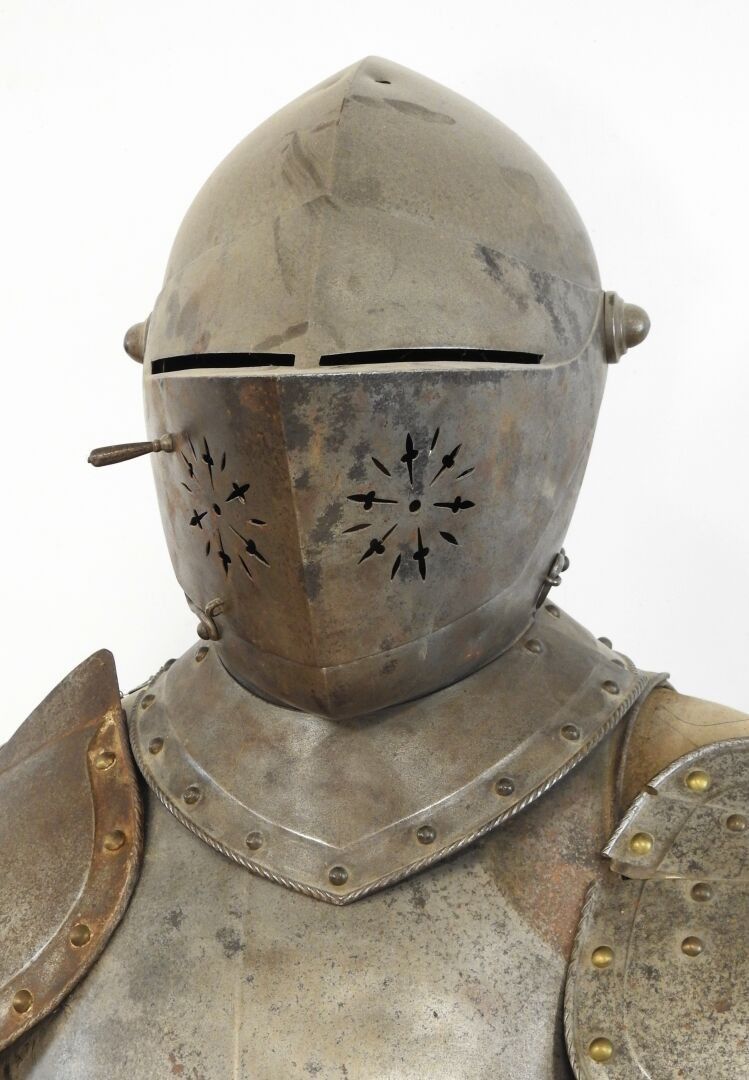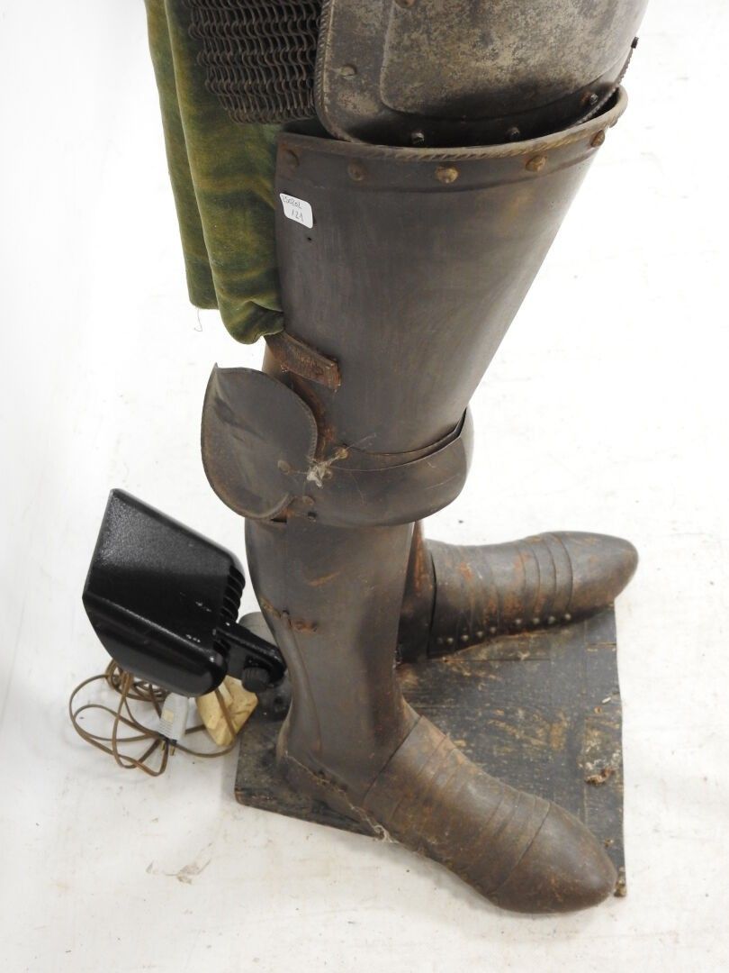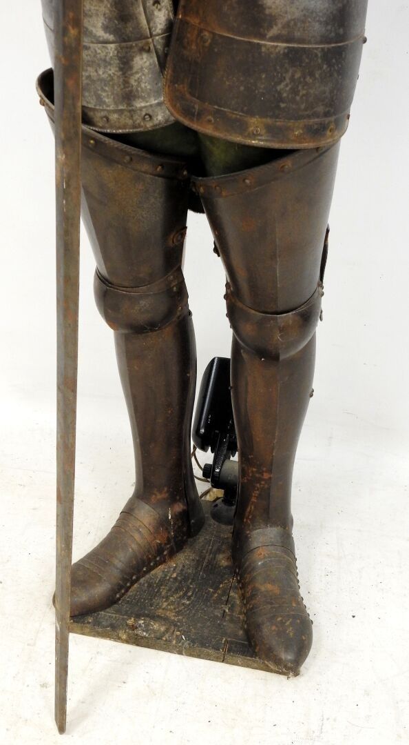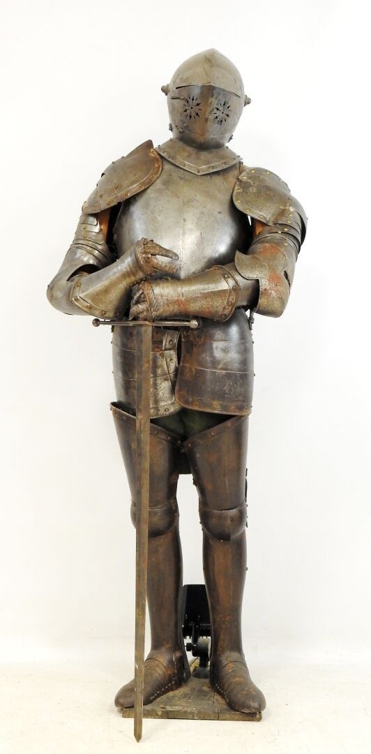 Medieval style knight's armour, helmet with visor, gauntlets, leggings, sword and other items. Late 19th-early 20th century, in the style of Viollet-le-Duc. Mounted on an electrified base. Total height: 175 cm. Damage, rust, parts to be refixed.