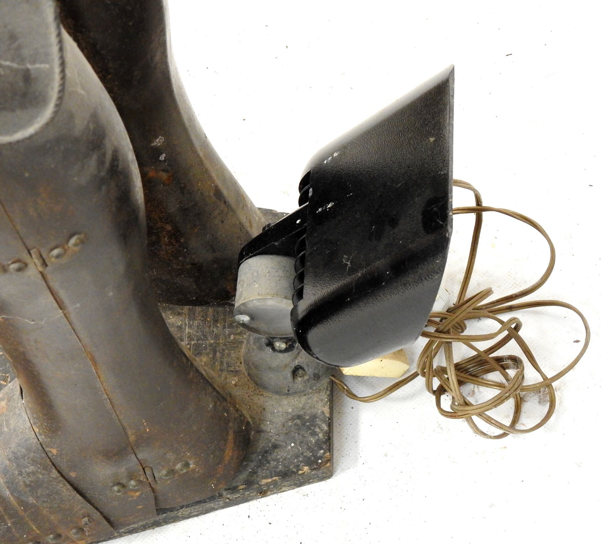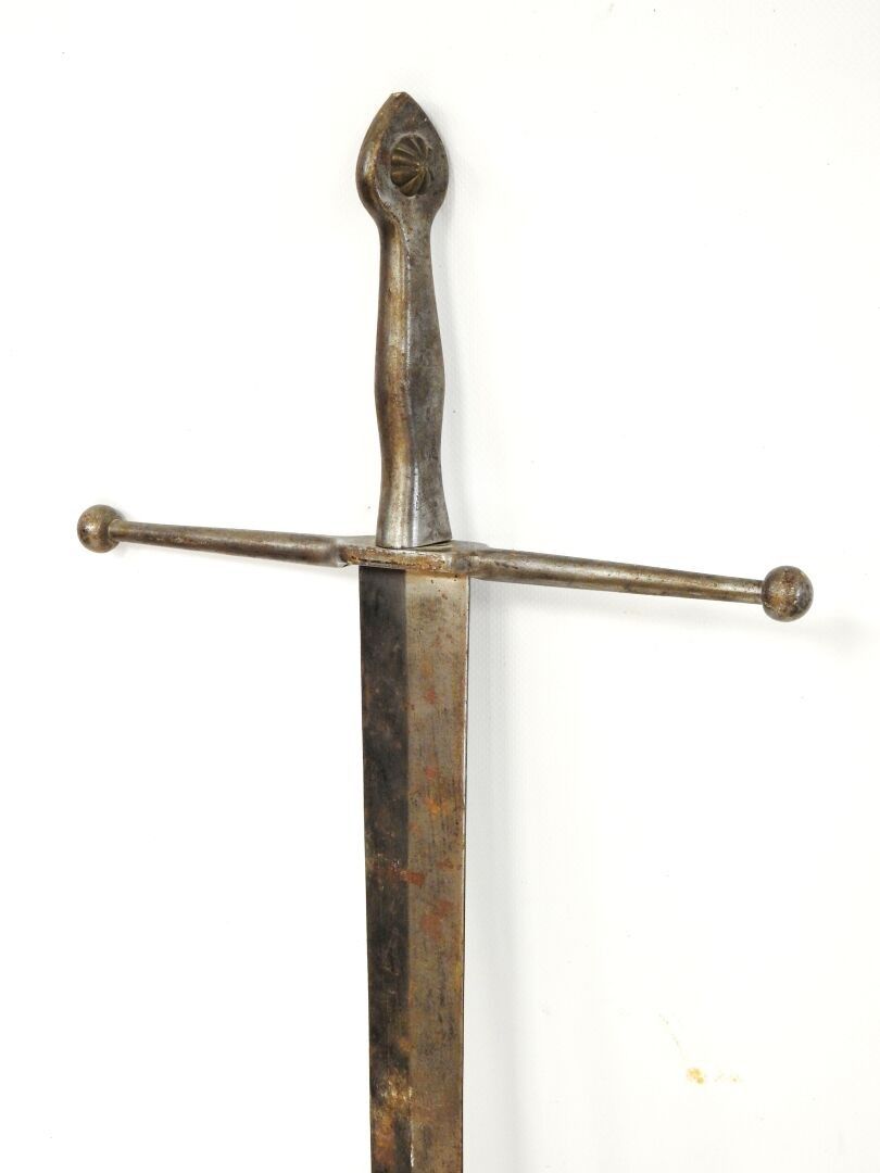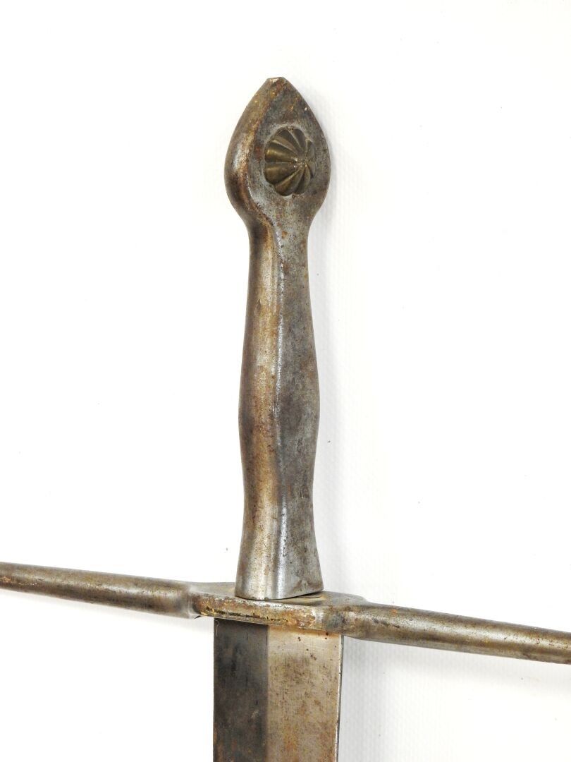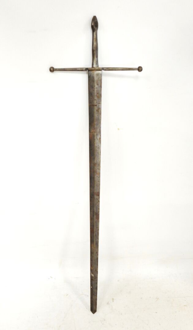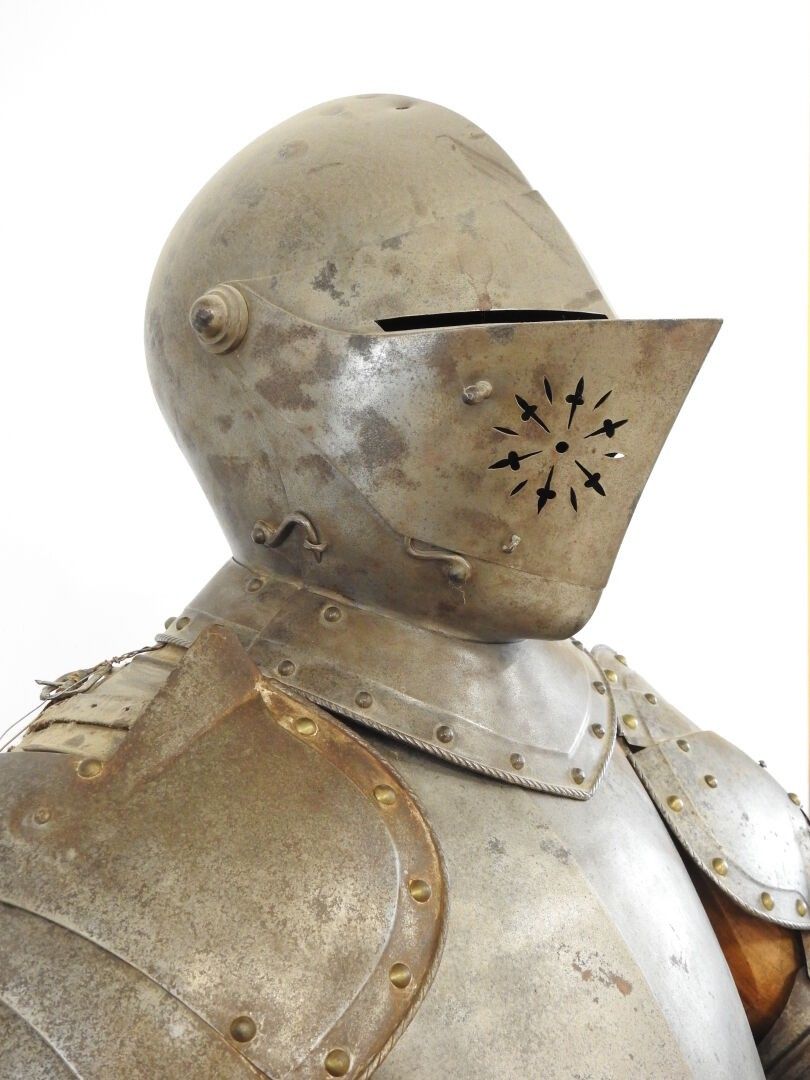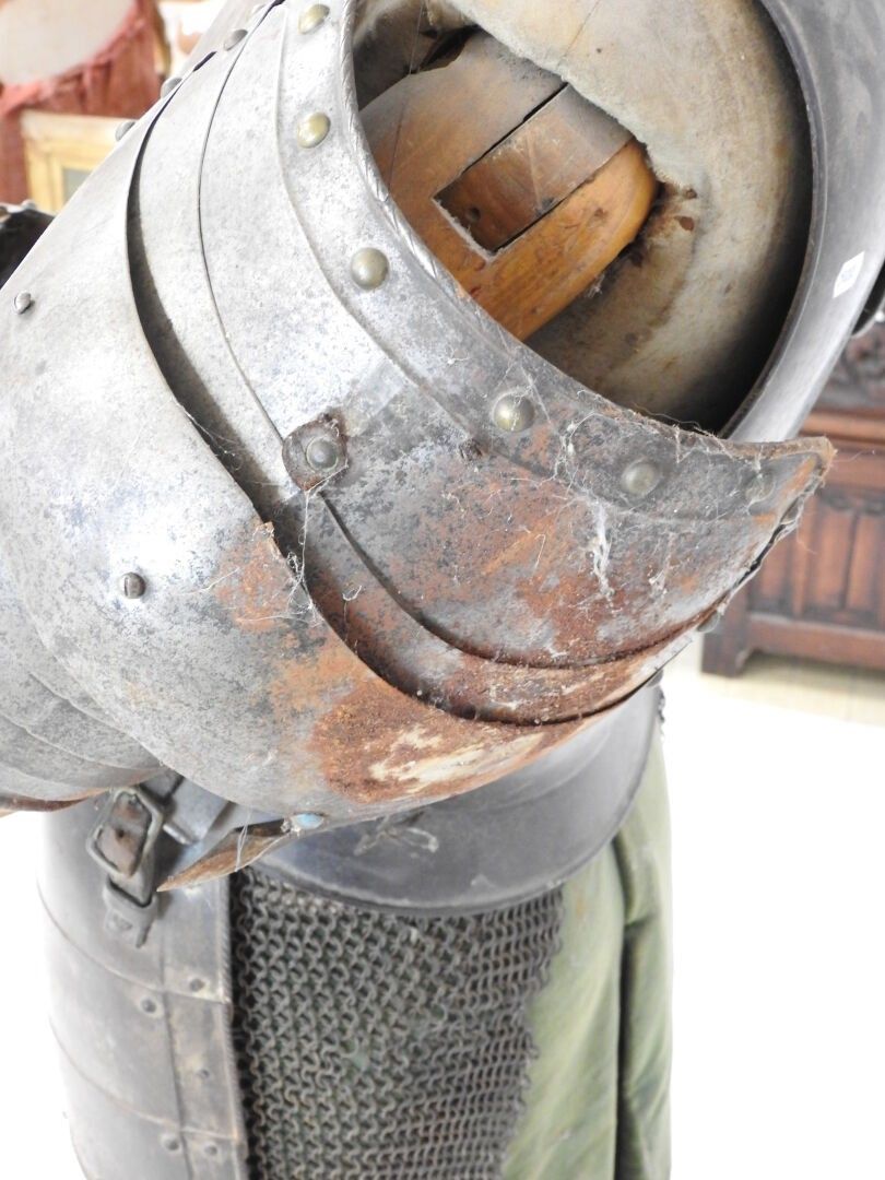 Medieval style knight's armour, helmet with visor, gauntlets, leggings, sword and other items. Late 19th-early 20th century, in the style of Viollet-le-Duc. Mounted on an electrified base. Total height: 175 cm. Damage, rust, parts to be refixed.
