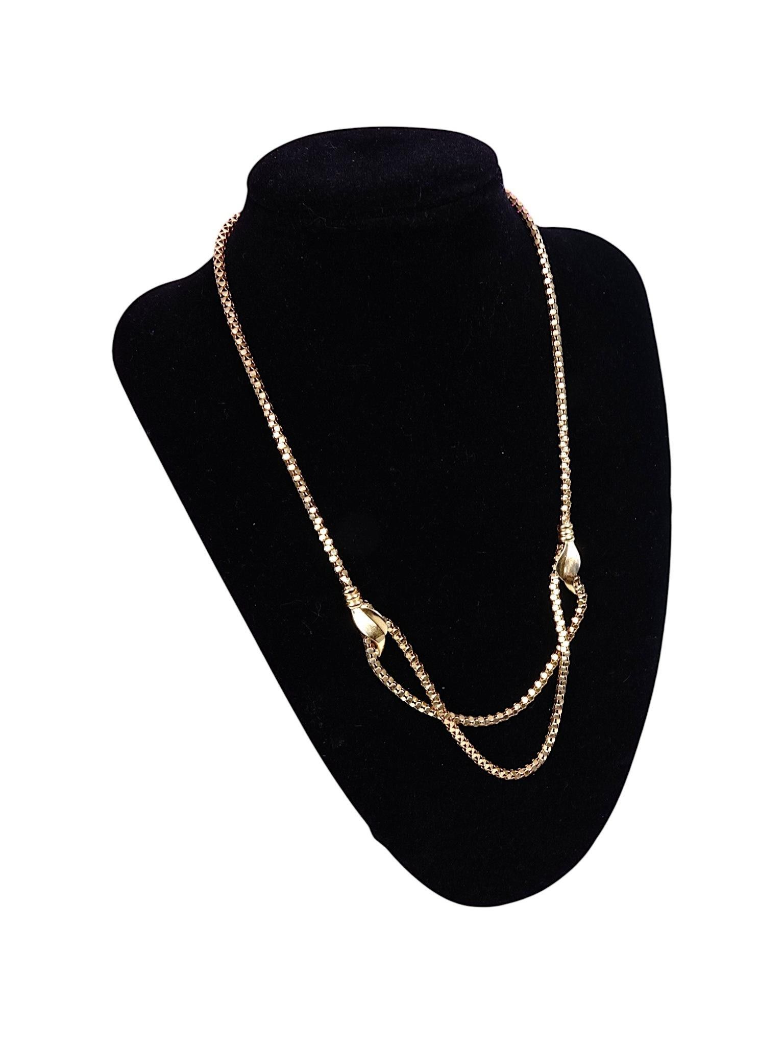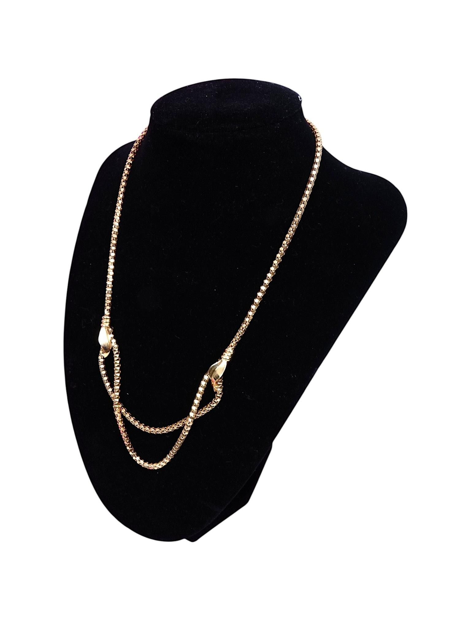 Necklace in 18K (750 thousandths) yellow gold, with flexible faceted mesh, forming two rows joined at the front by two smooth leaves or shuttles