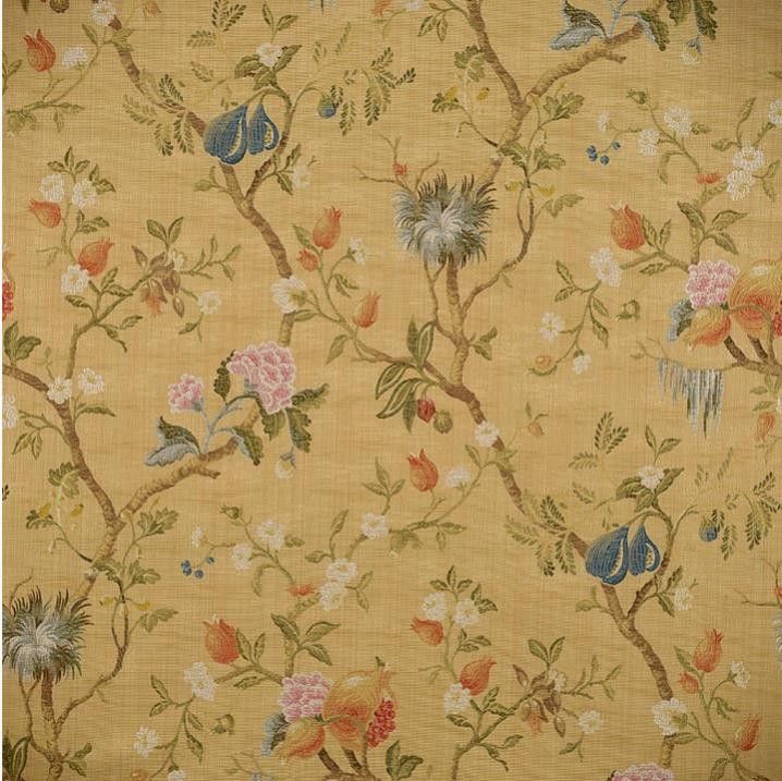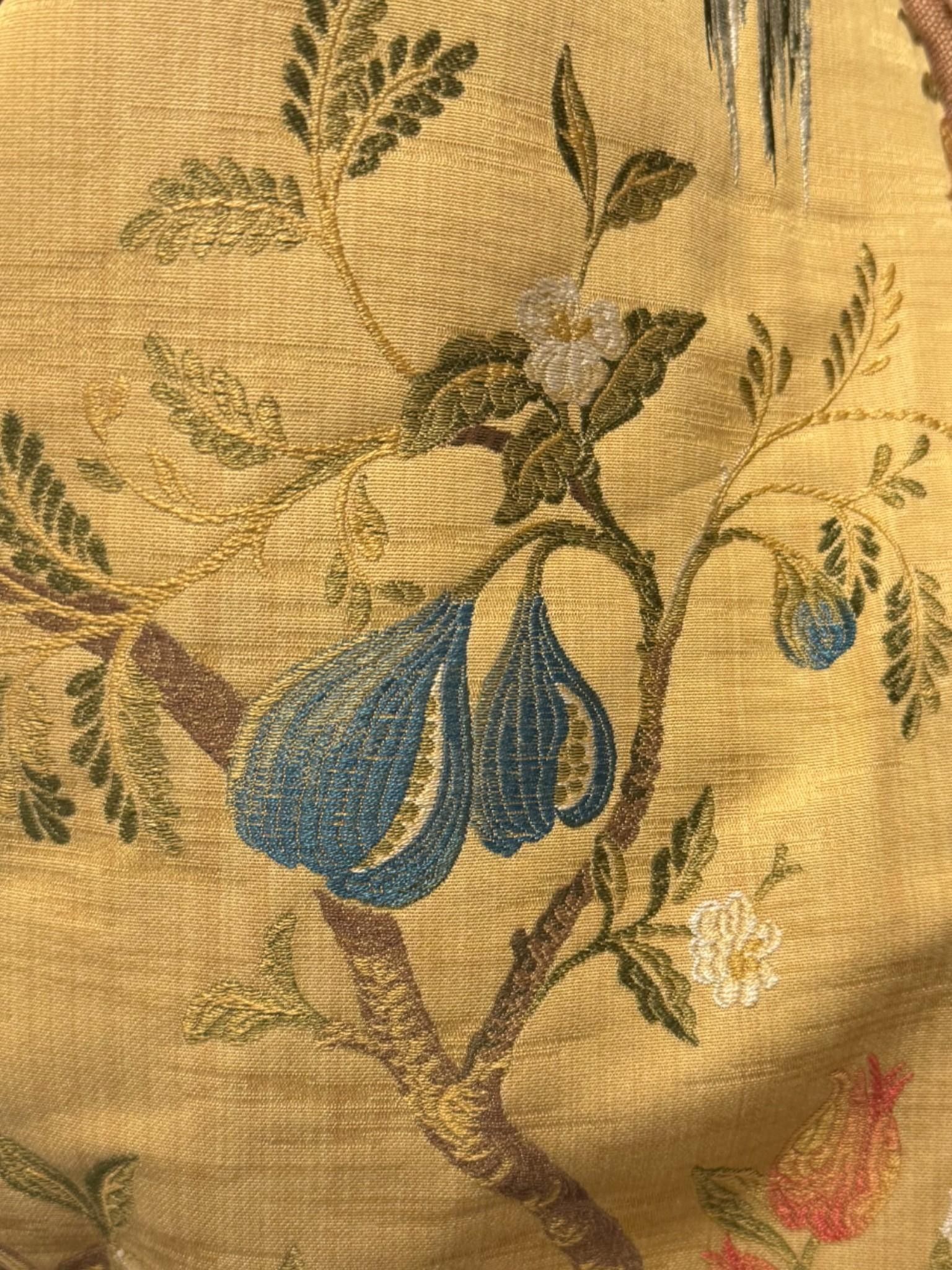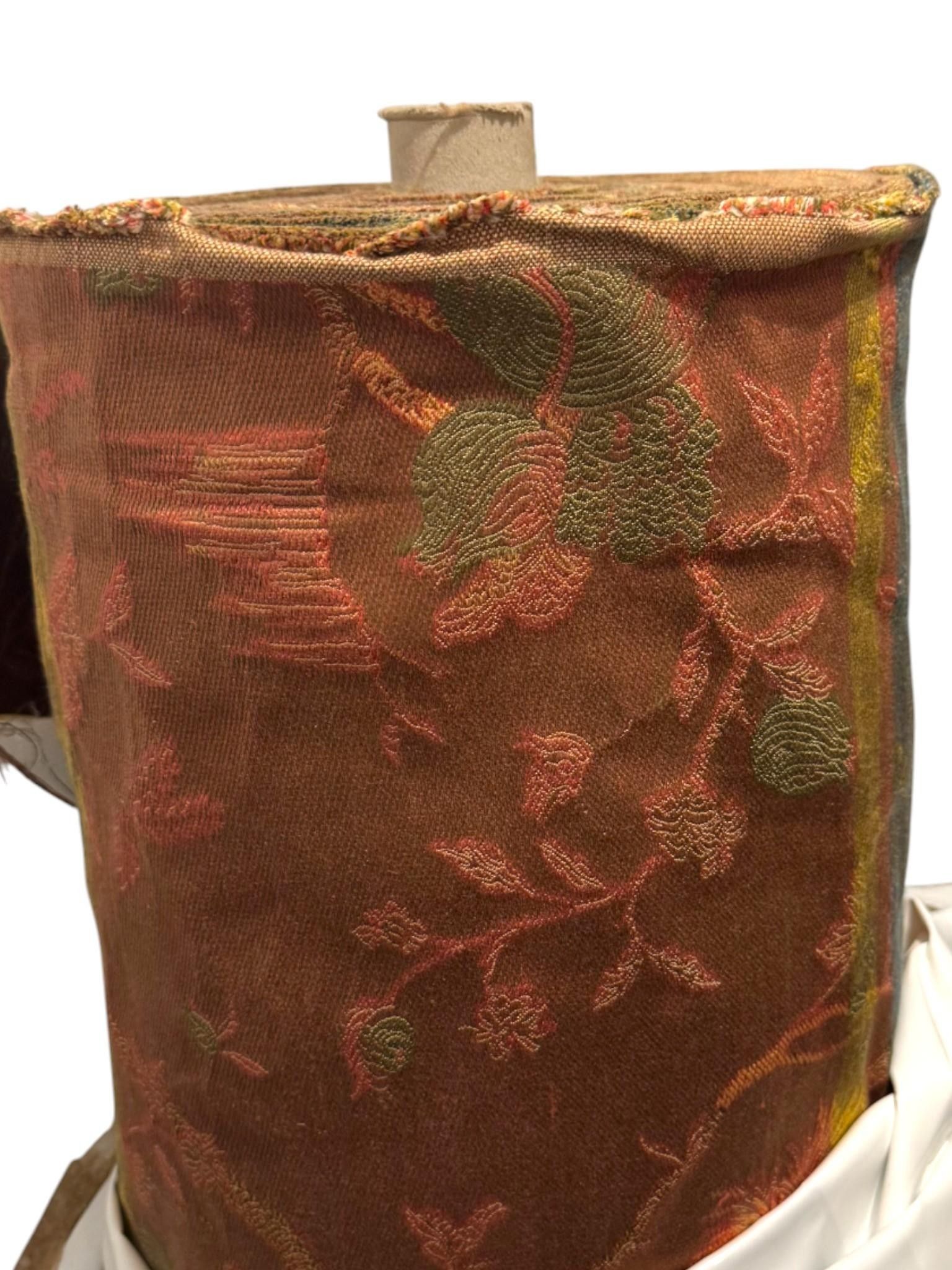 Large roll of upholstery fabric, lampas with floral motifs in red and green tones on a champagne background, in cotton, viscose and silk
