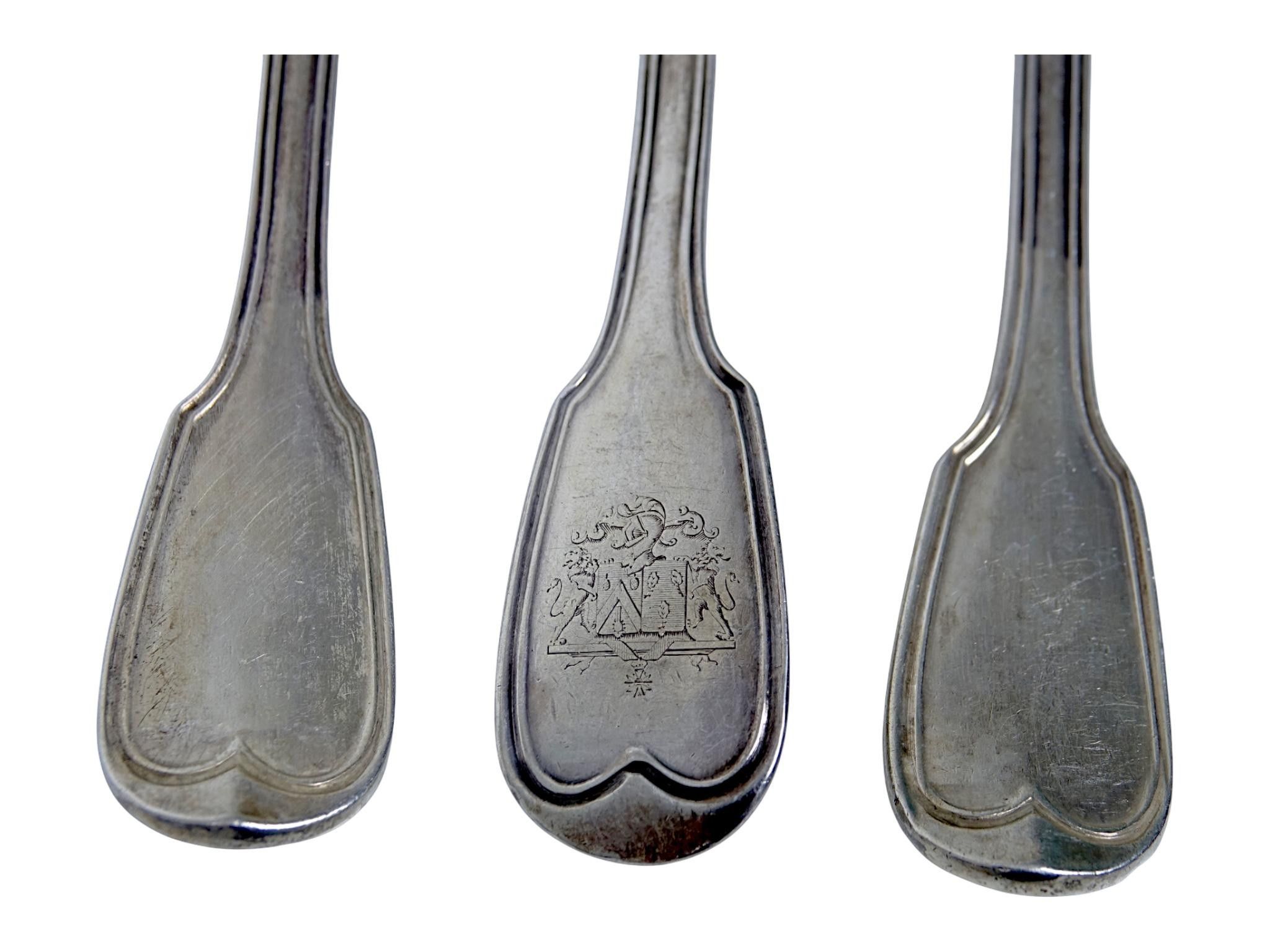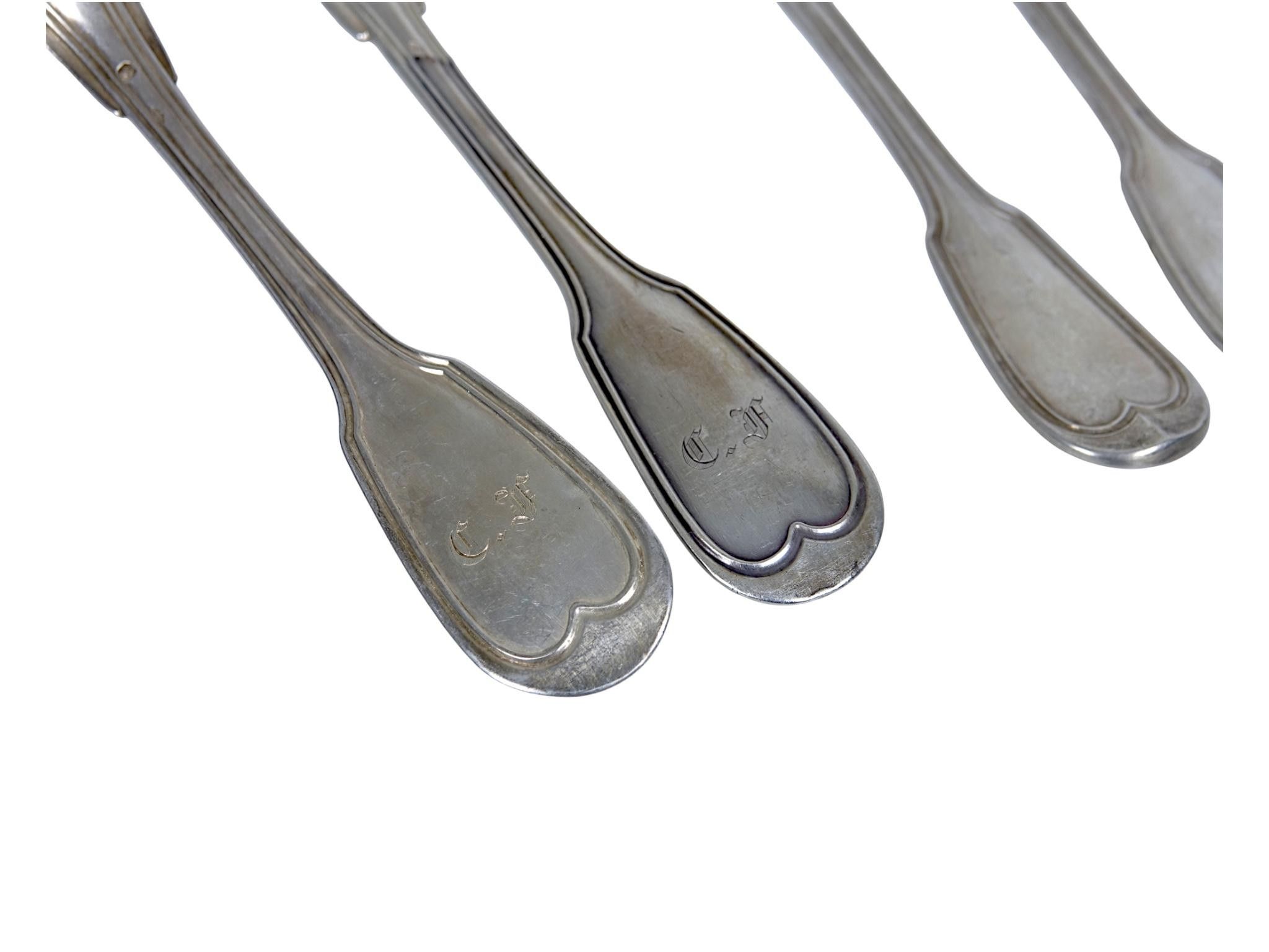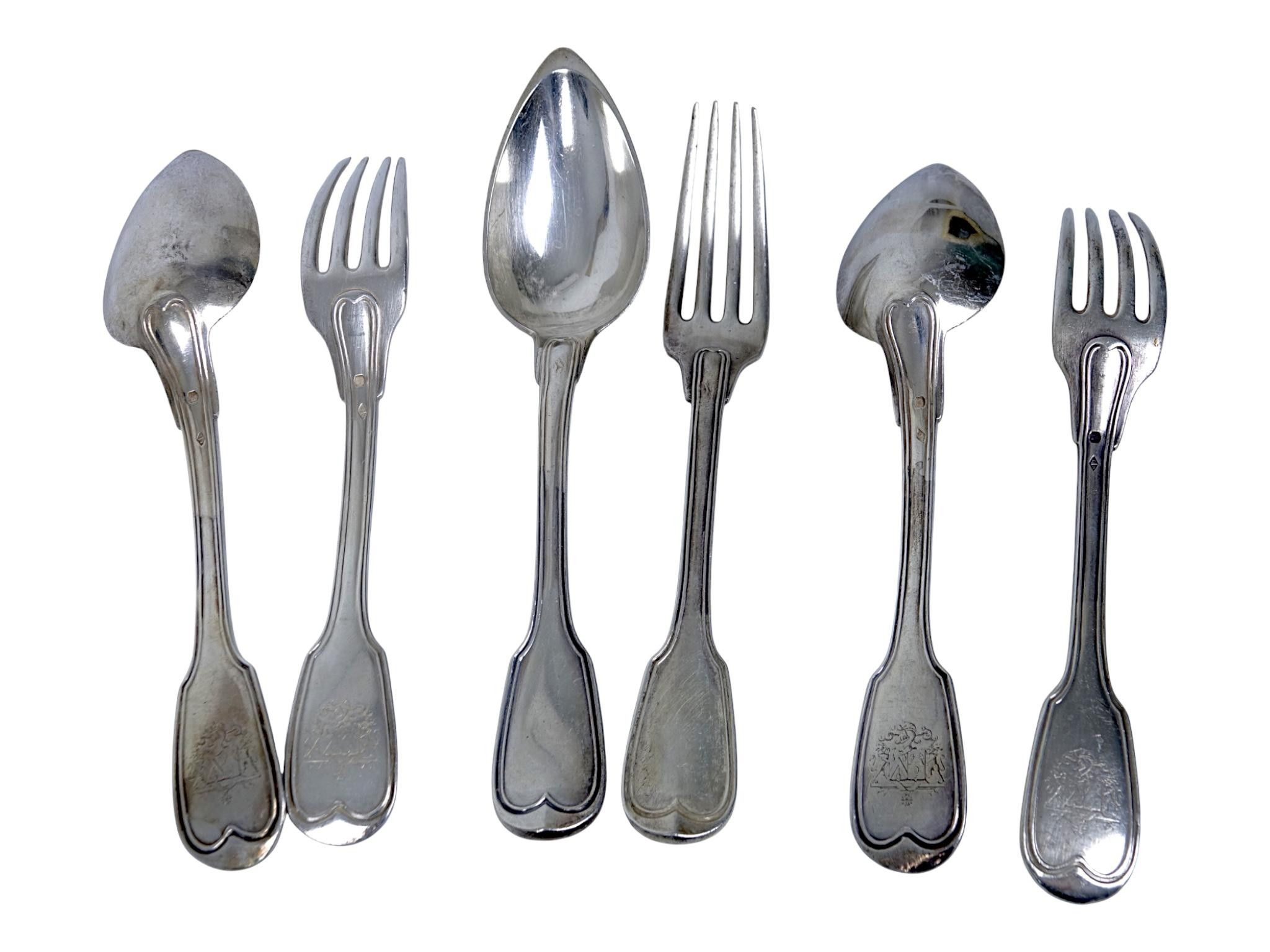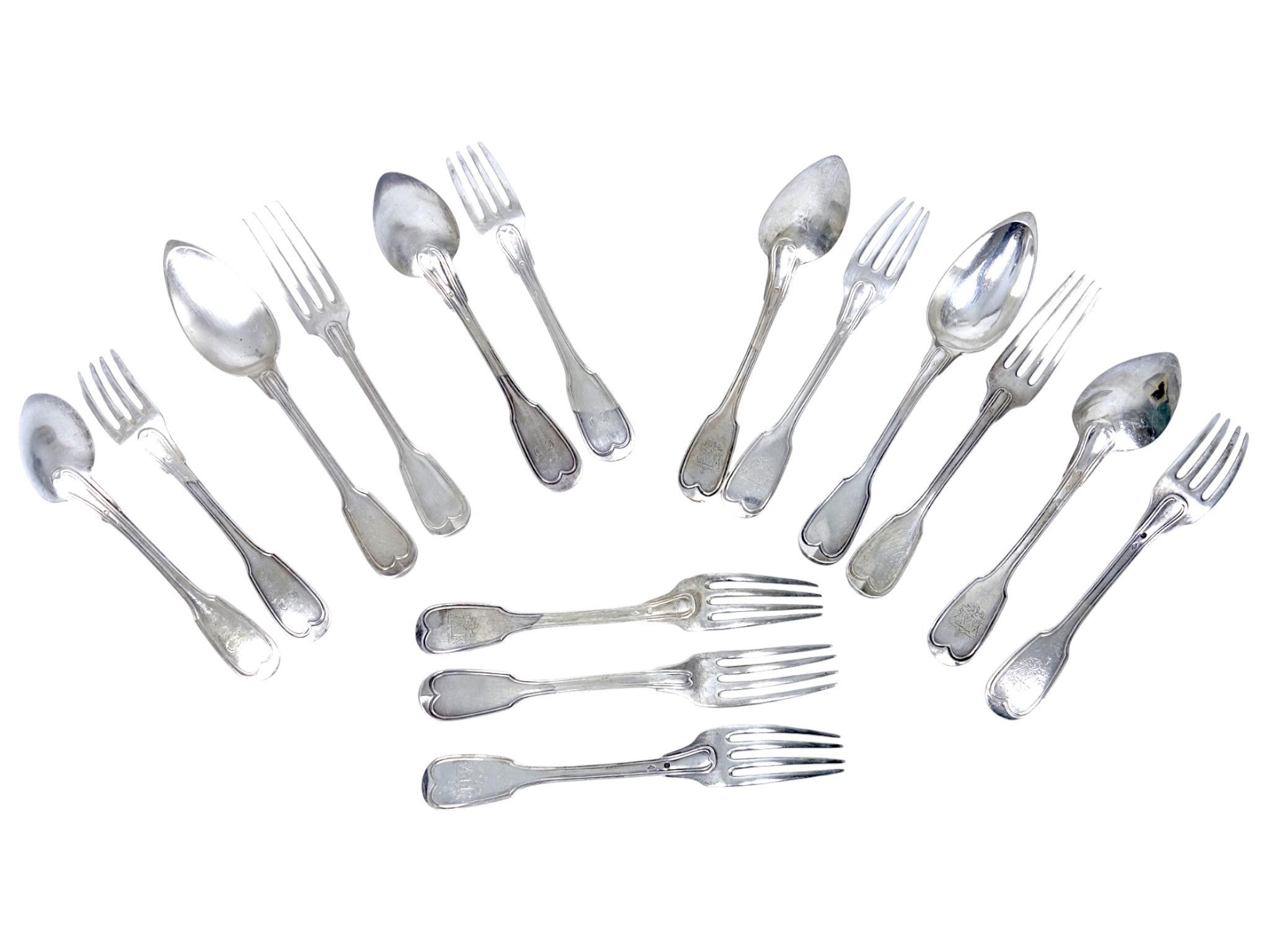 Set of 950 thousandths silver spoons and forks, Minerve hallmark, filet pattern, comprising :