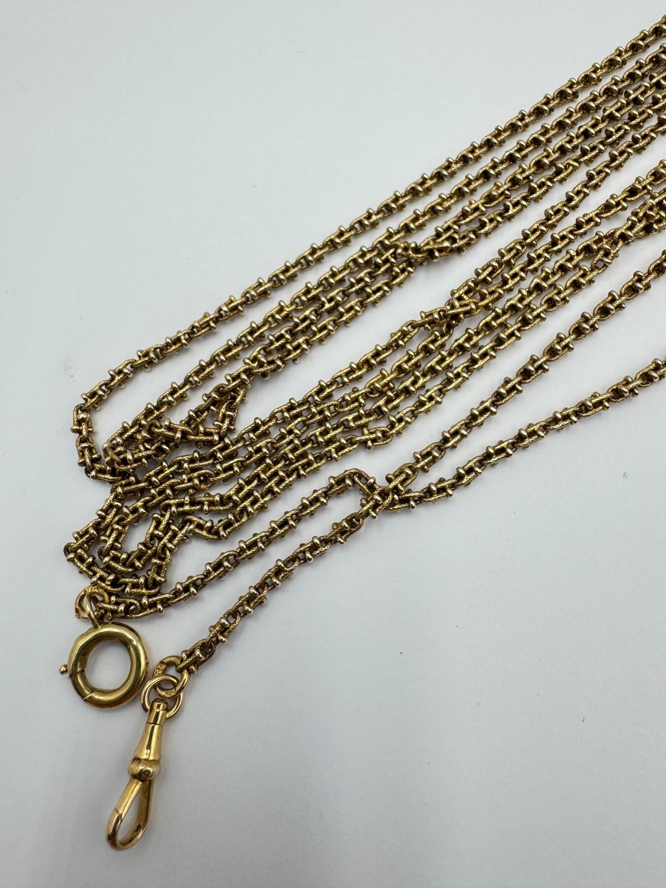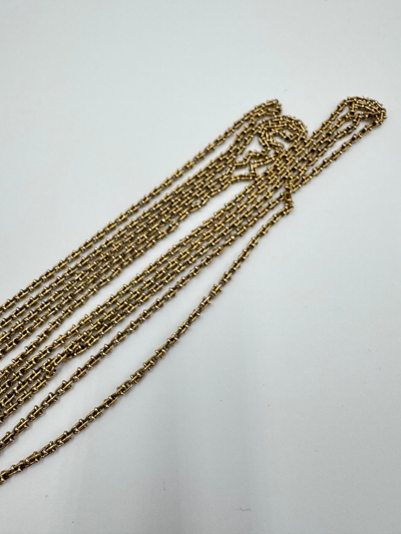 Waistcoat chain in 750 thousandths yellow gold with interlaced U-shapes 69.4 g. Length 200 cm.