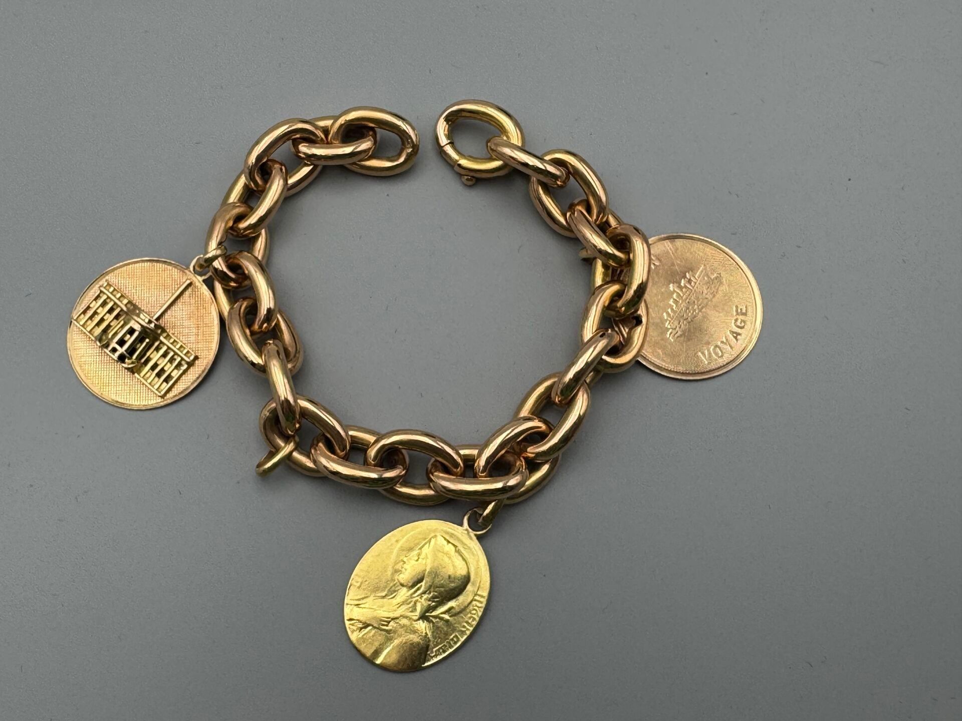 two round medals in 585 thousandths gold: one with the white house in relief, and the other guilloché with an ocean liner and the inscription Bon voyage, first names and a date on the back