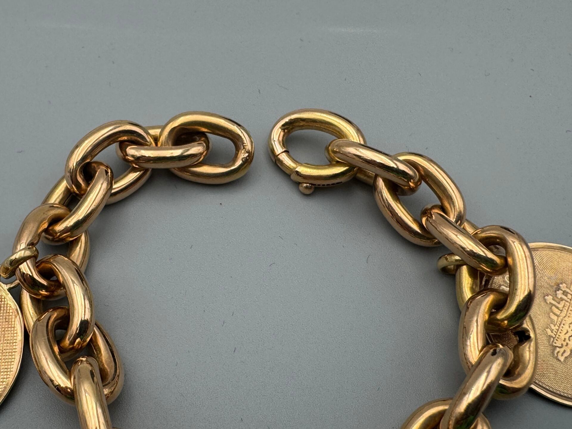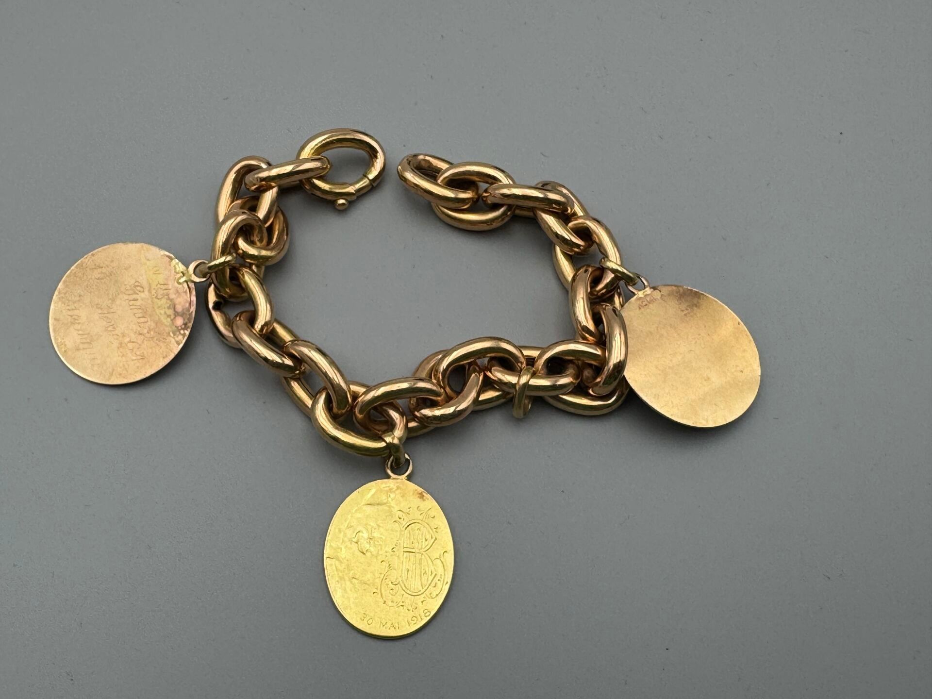 Flexible bracelet in 750 thousandths pink gold with three gold medals: