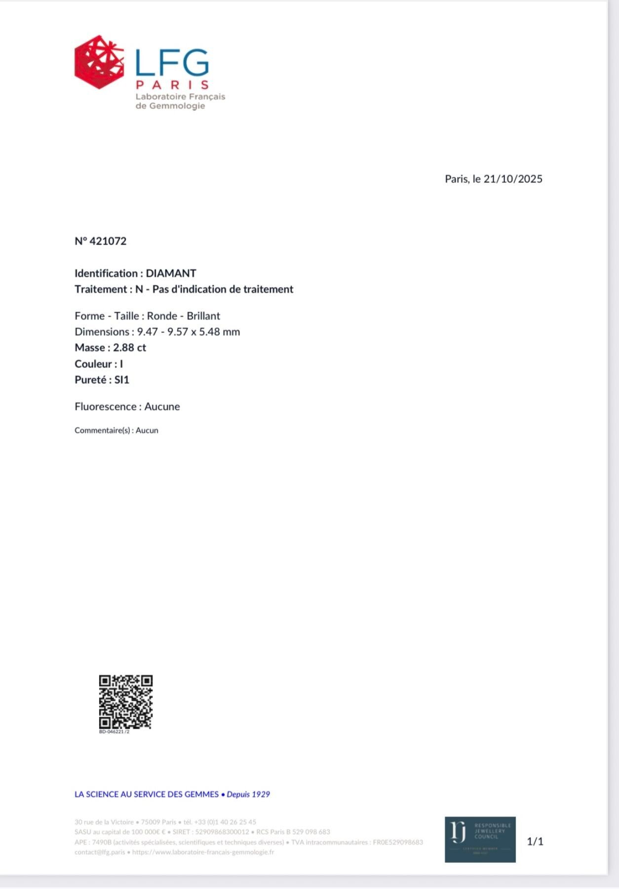 With its preliminary report from the French gemmological laboratory dated 21 October 2025 specifying colour I, clarity si1, no fluorescence.
