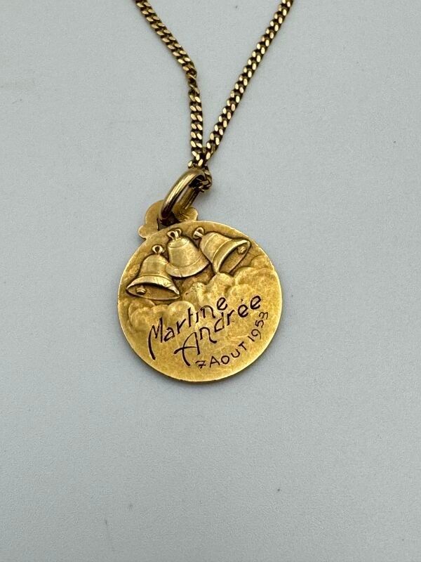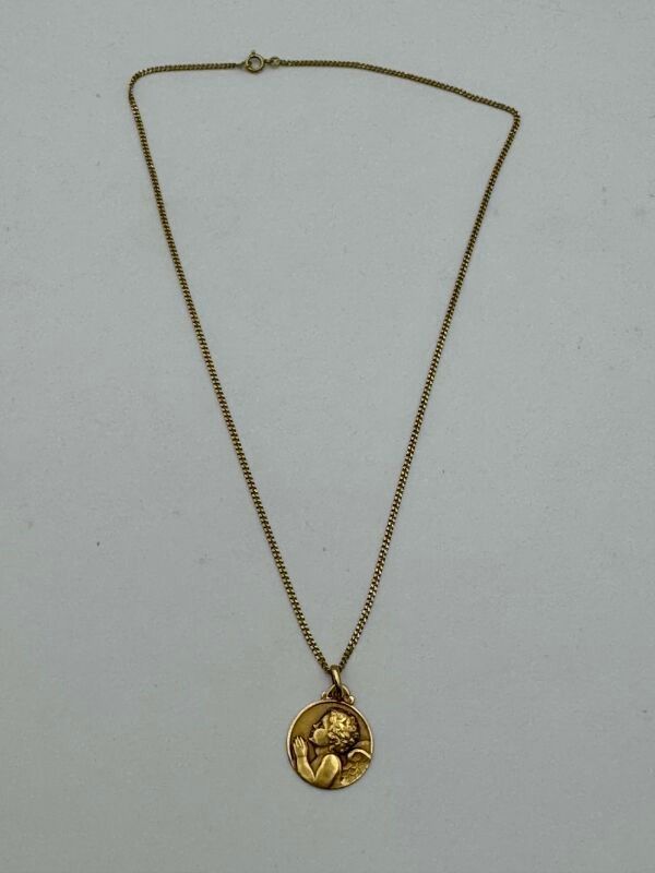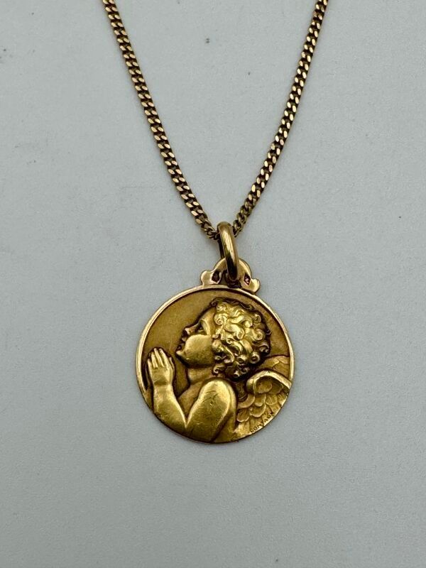 A curb chain and a round medal Angel in Prayer, back engrave…