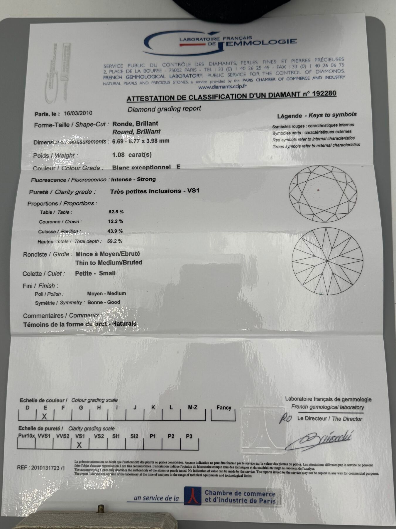 Diamond on paper 1.08 carat with certificate from the French Gemmological Laboratory dated 16 March 2010 specifying E colour exceptional white and clarity vs1.