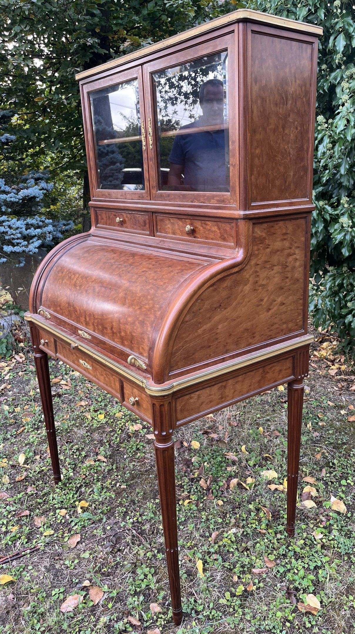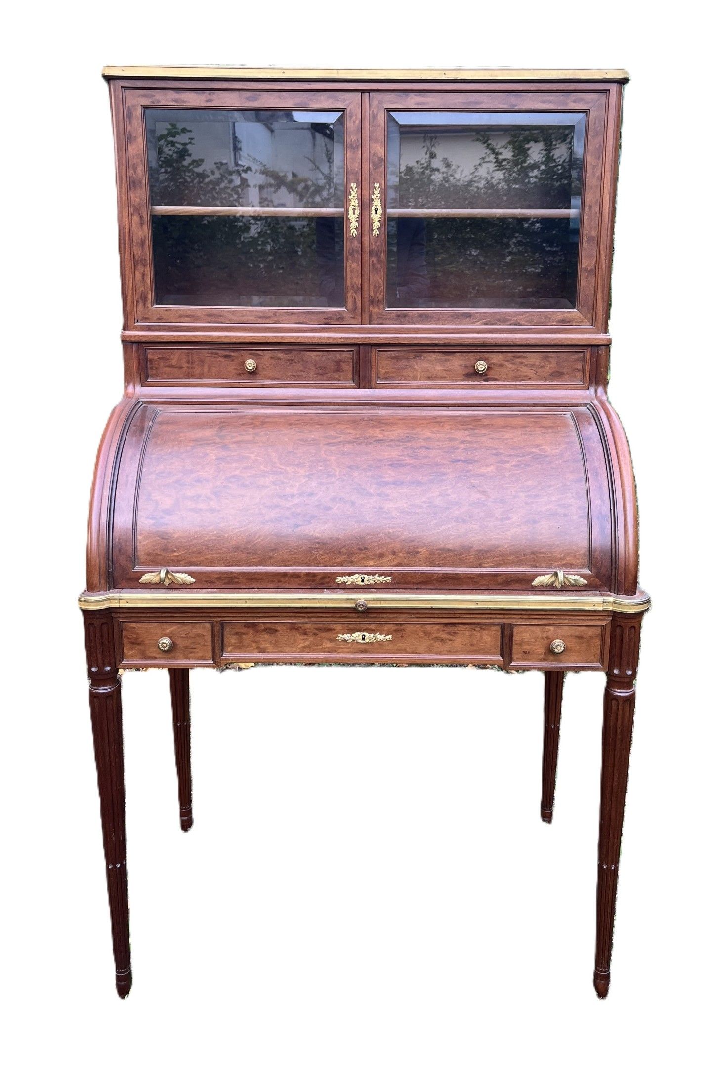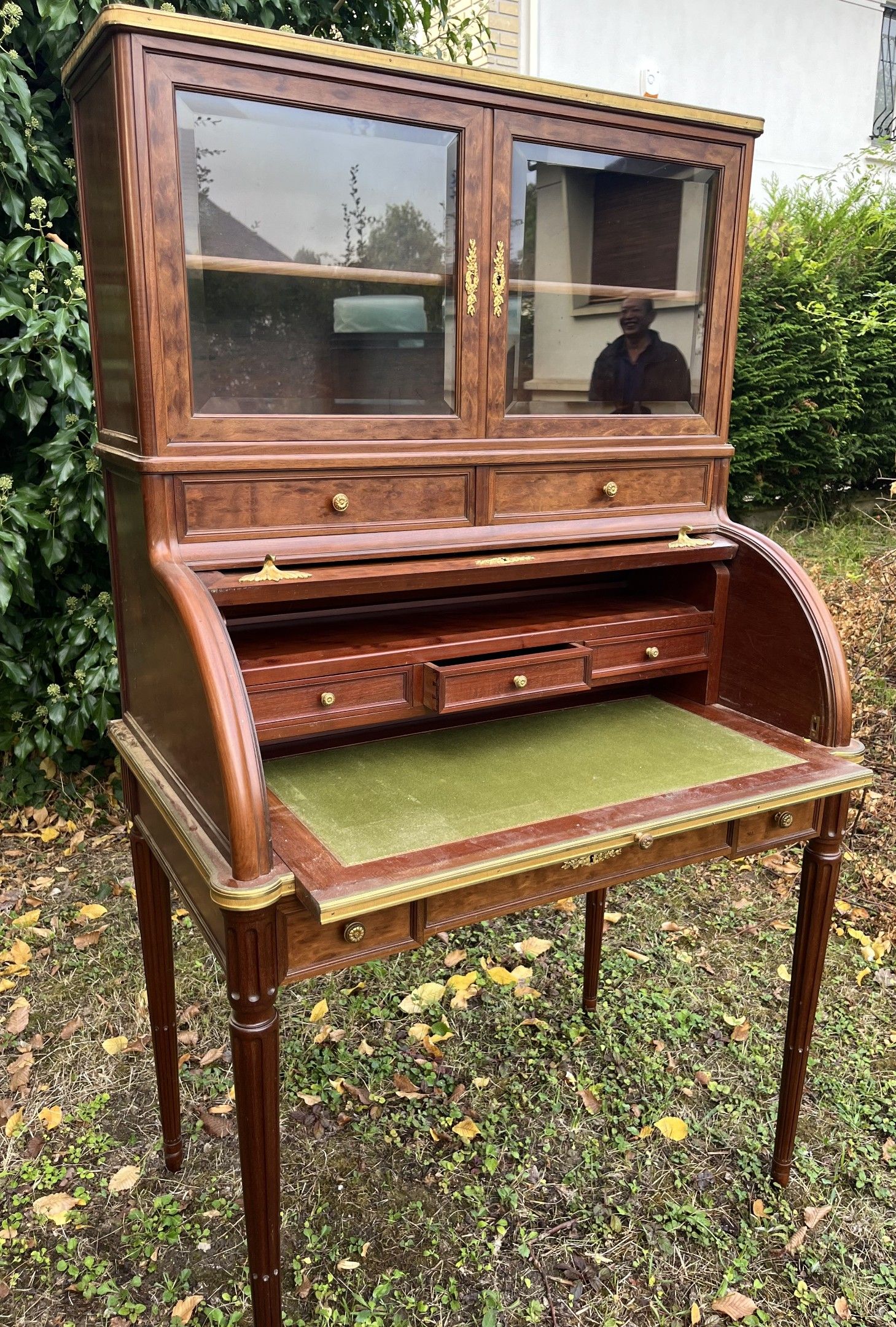 Cylinder desk in speckled mahogany veneer, the cylinder reveals a writing tablet and three drawers, it is topped by two drawers and two glazed panels. Three drawers in the waistband. Work in the Louis XVI style, late 19th century, early 20th century (scratches, small accidents).on the back in ink, the mark HAENTGES Frères, manufacturer 6 rue Titon PARIS. Height: 155.5 cm - Width: 90 cm - Depth: 57 cm