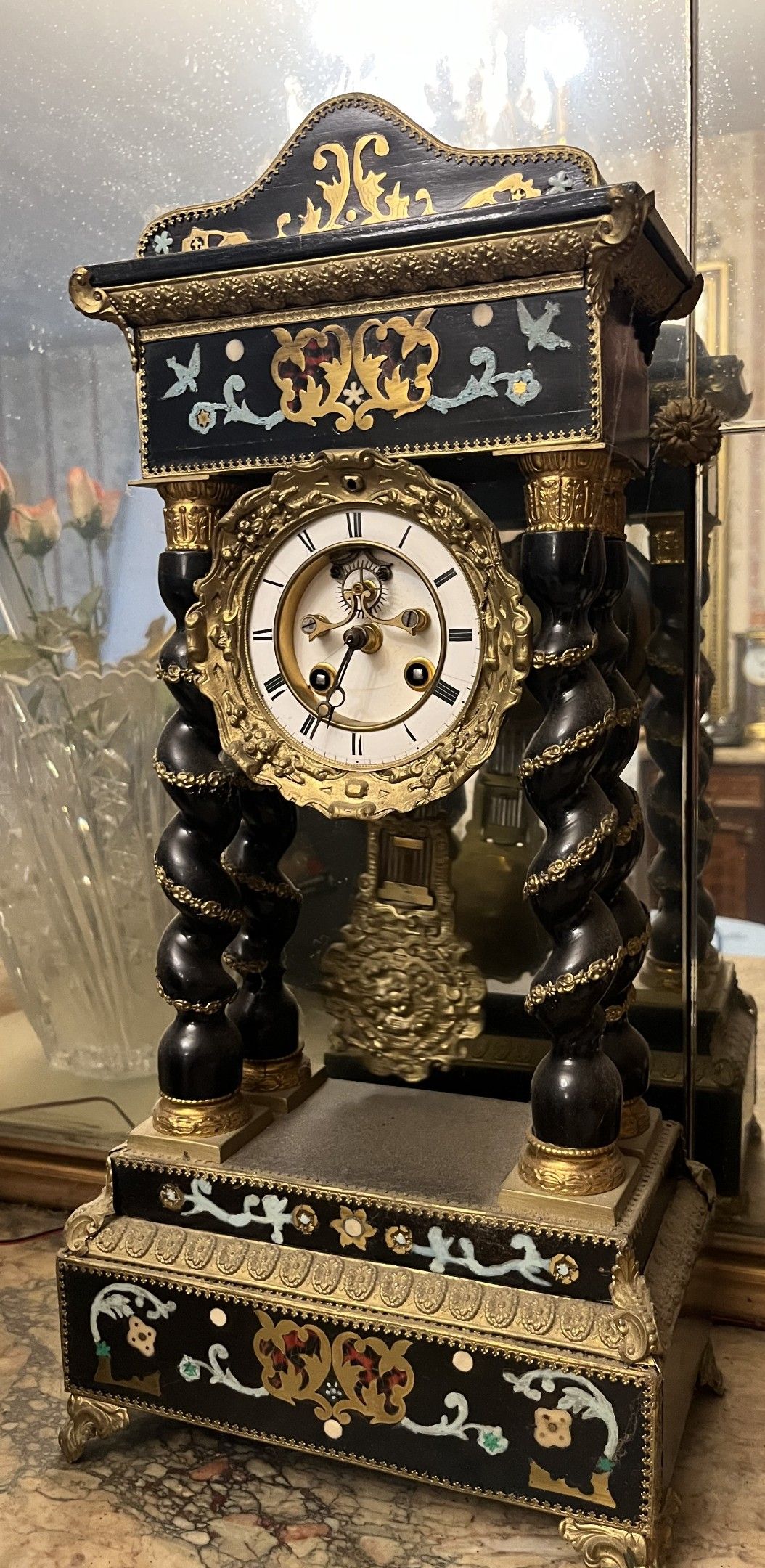 Portico clock in blackened wood and gilded brass, the dial set between two twisted columns, decorated with polychrome motifs.Napoleon III style (accidents and missing parts).Height: 48 cm - Width: 23 cm - Depth: 13 cm