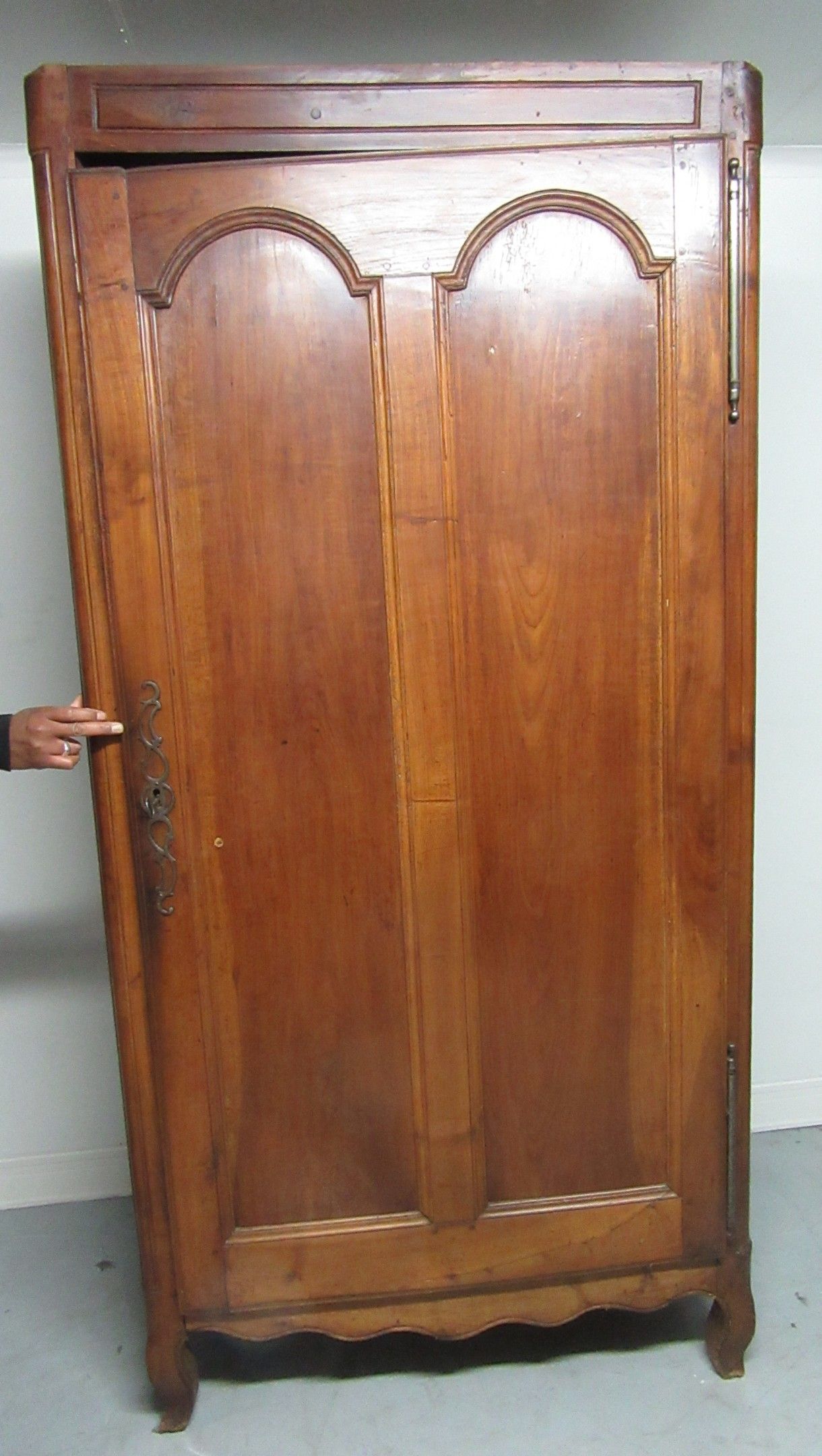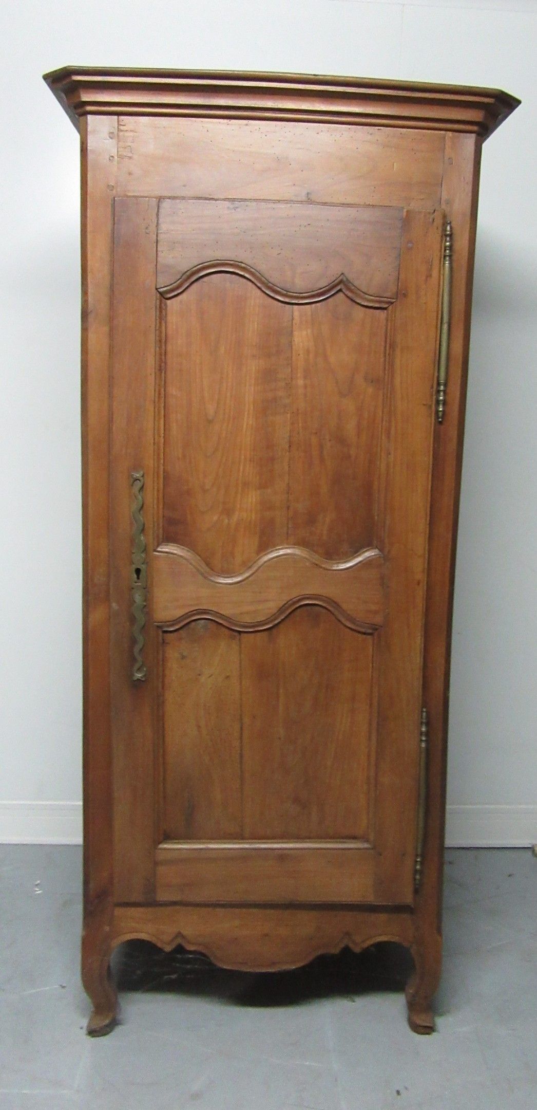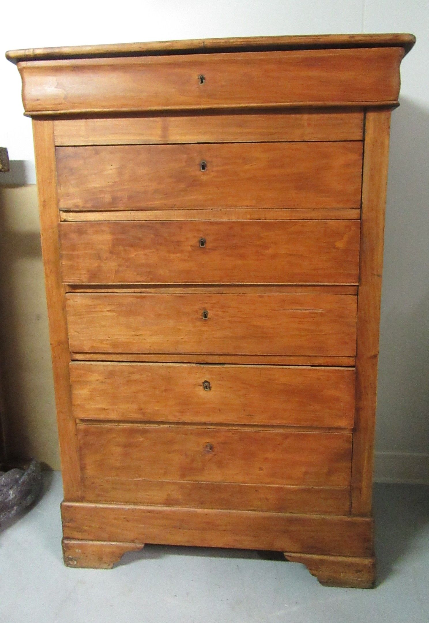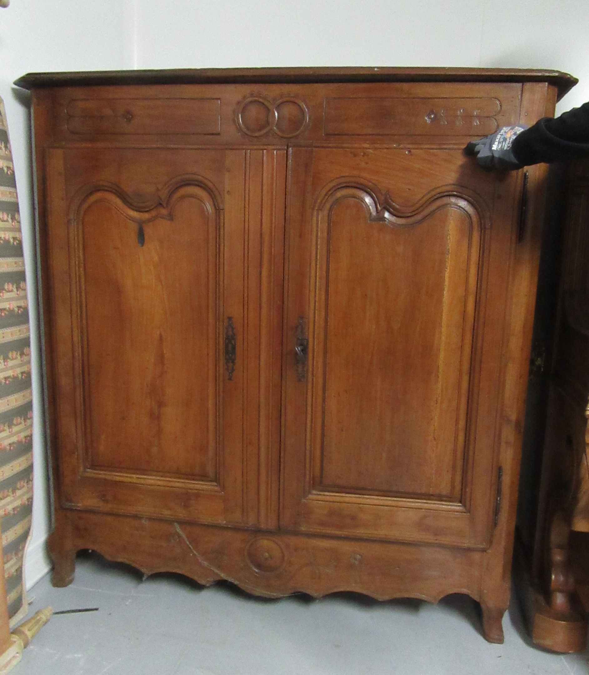 Set comprising a rustic piece of furniture opening with two doors. Decorative belt. Cambered legs. Work of Causse Corézien or Lot (accidents and misses) - A comtoise and its movement. The dial decorated with a bouquet of flowers. Rustic work. - Two Lorraine chairs. The front legs are turned. H-shaped braces. 19th century - Two rustic maidstands. Moving belt. Cambered front legs (accidents and missing parts). A walnut display cabinet - A wooden box with fittings. The front has two panels (the lock is missing) - A Louis-Philippe natural wood weekly chest (accidents and missing pieces).