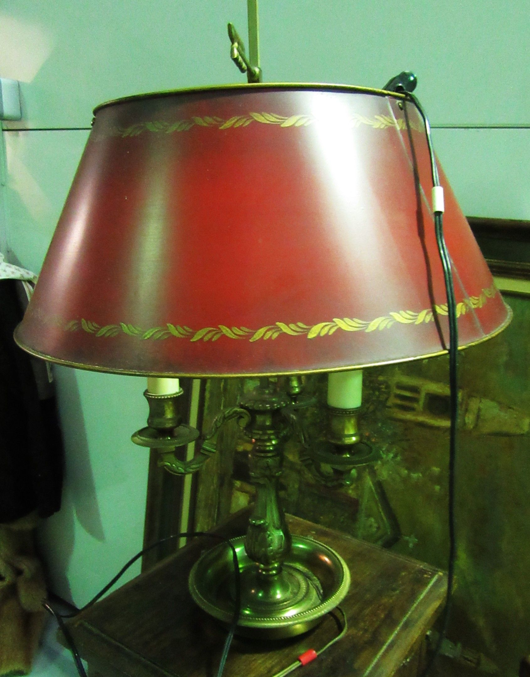 Hot-water bottle lamp in silver-plated metal. Shade in painted sheet metal with red background. Louis XVI style (wear).