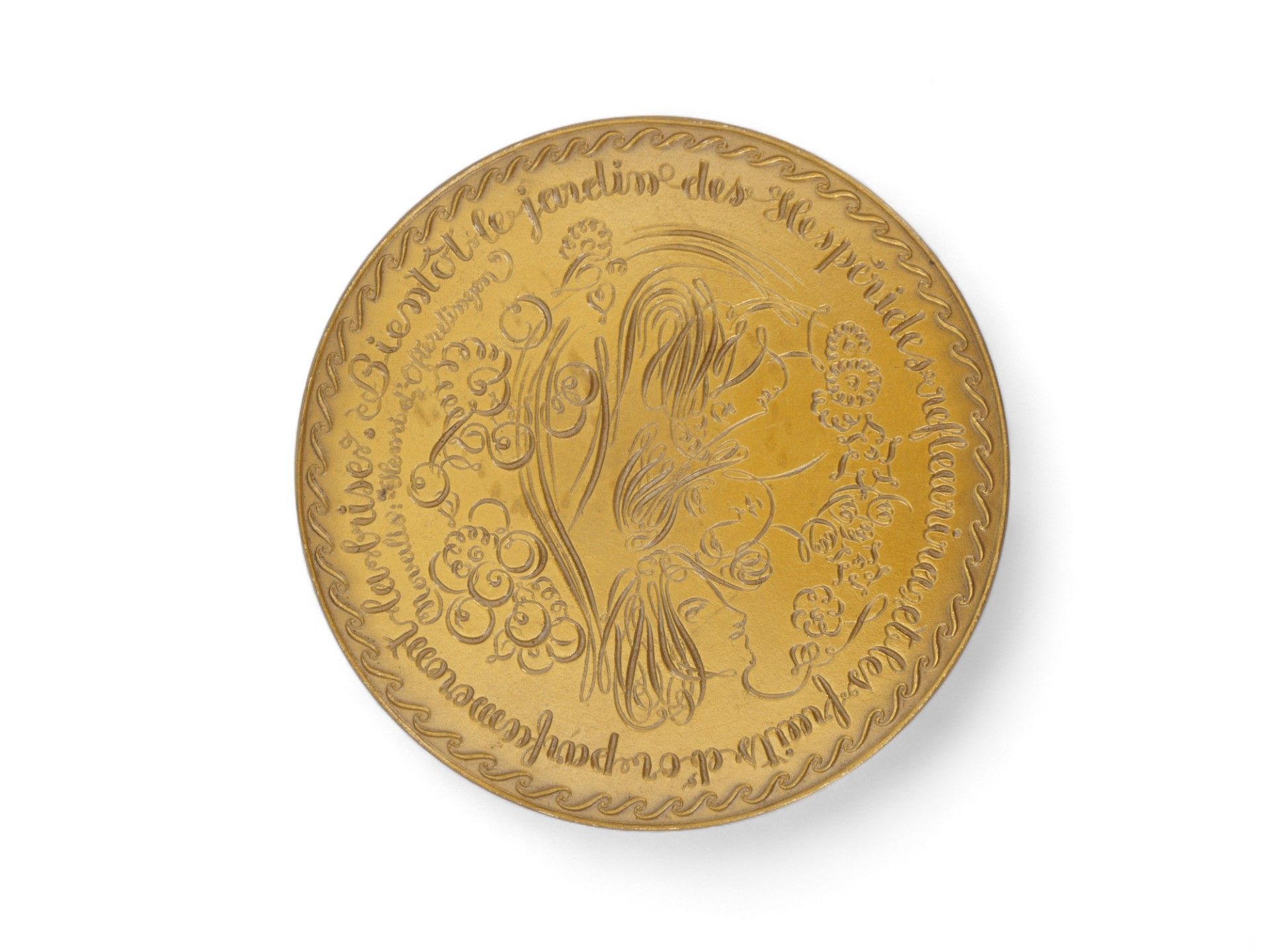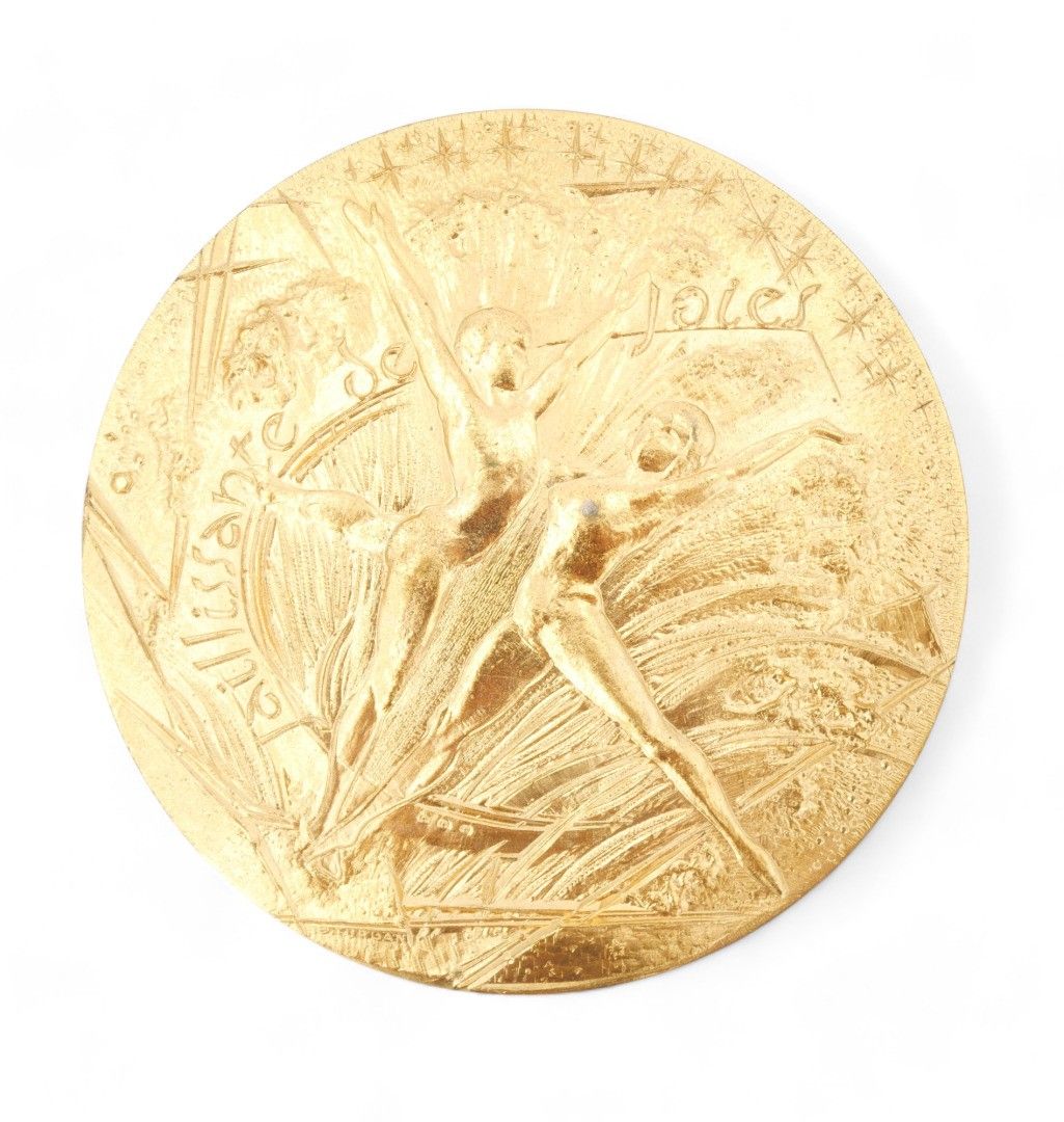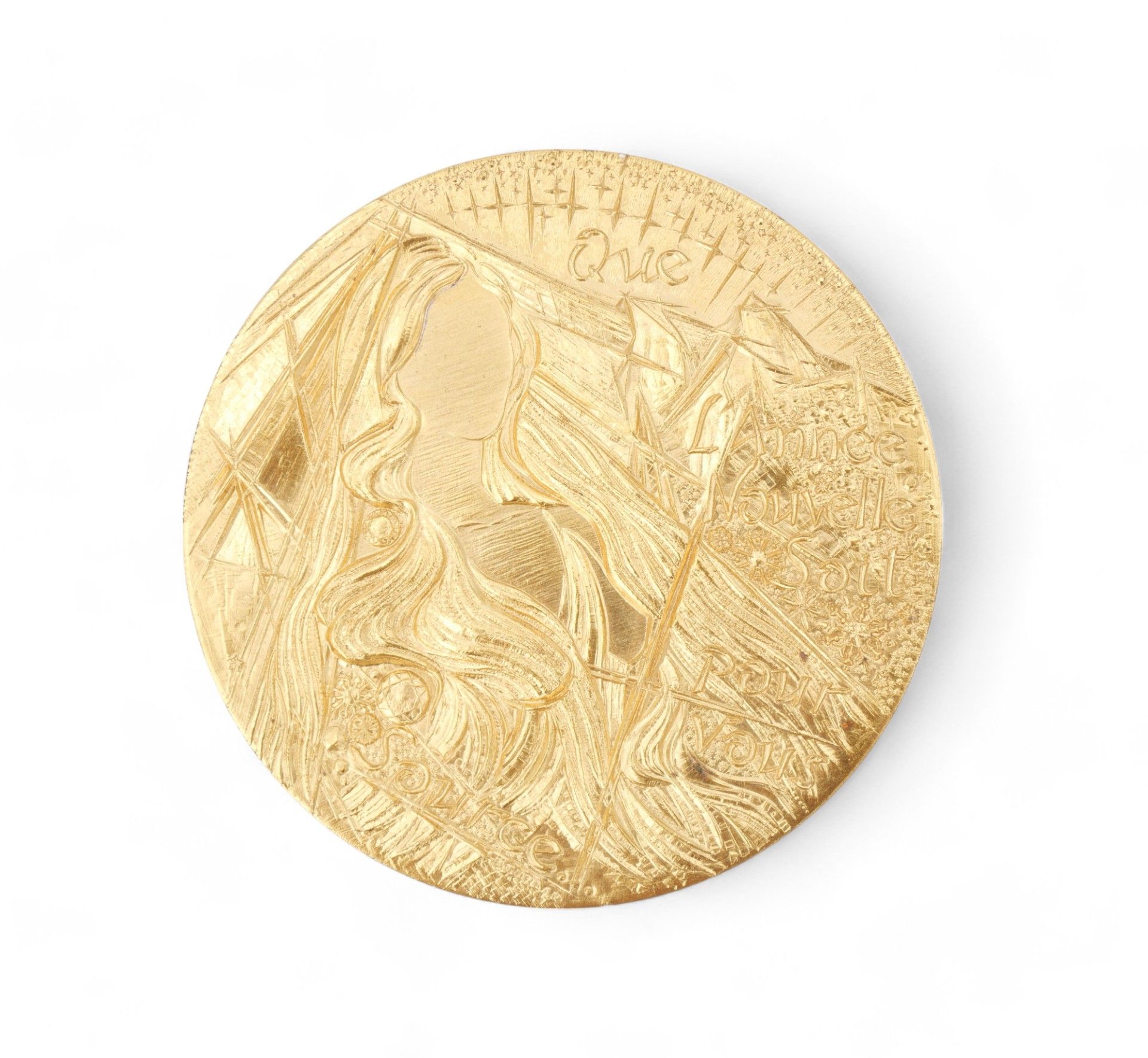 - Greetings medal decorated with faces, flowers and wings, featuring inscriptions from the novel "Novalis" by Henri d'OFTERDINGEN.