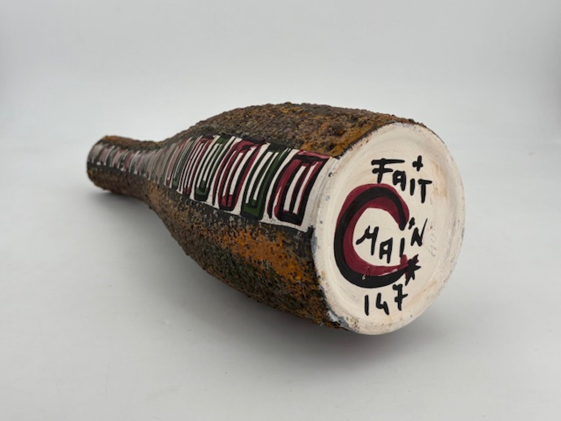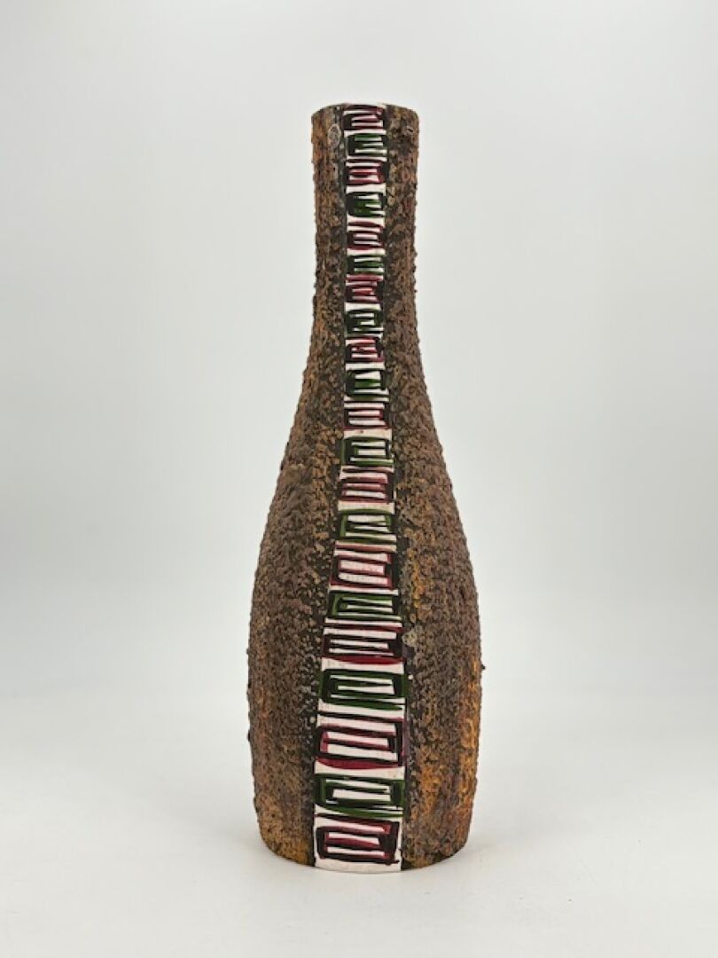 LARGE VASE with long neck decorated with red and green geometric motifs and a crusty patina