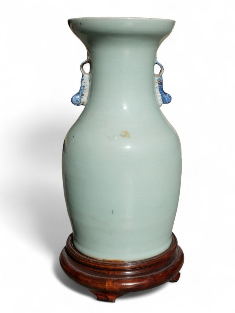 A white-blue porcelain long-necked baluster vase decorated with flowers in a landscape. Applied handles in the shape of a fantastic animal.
