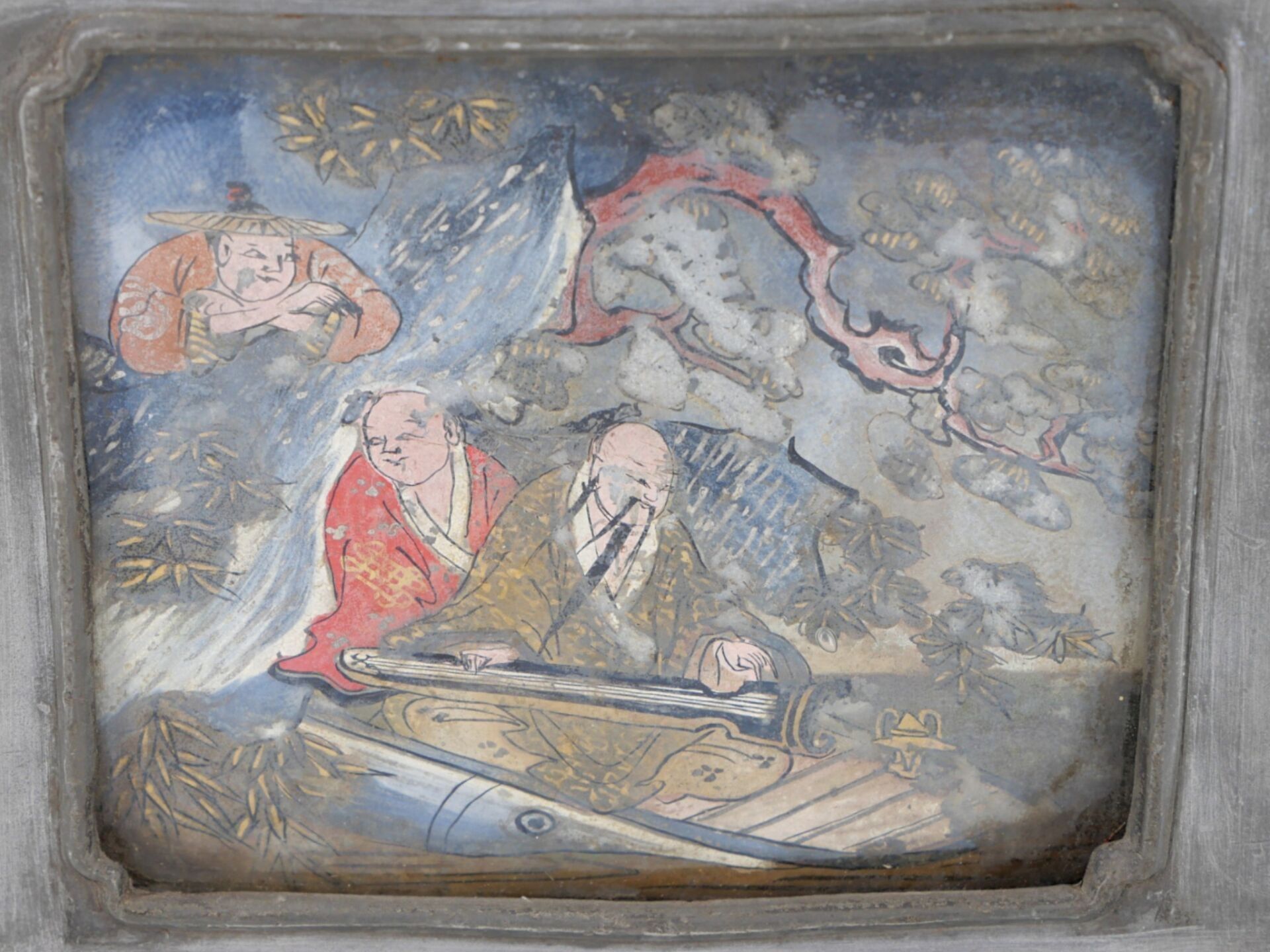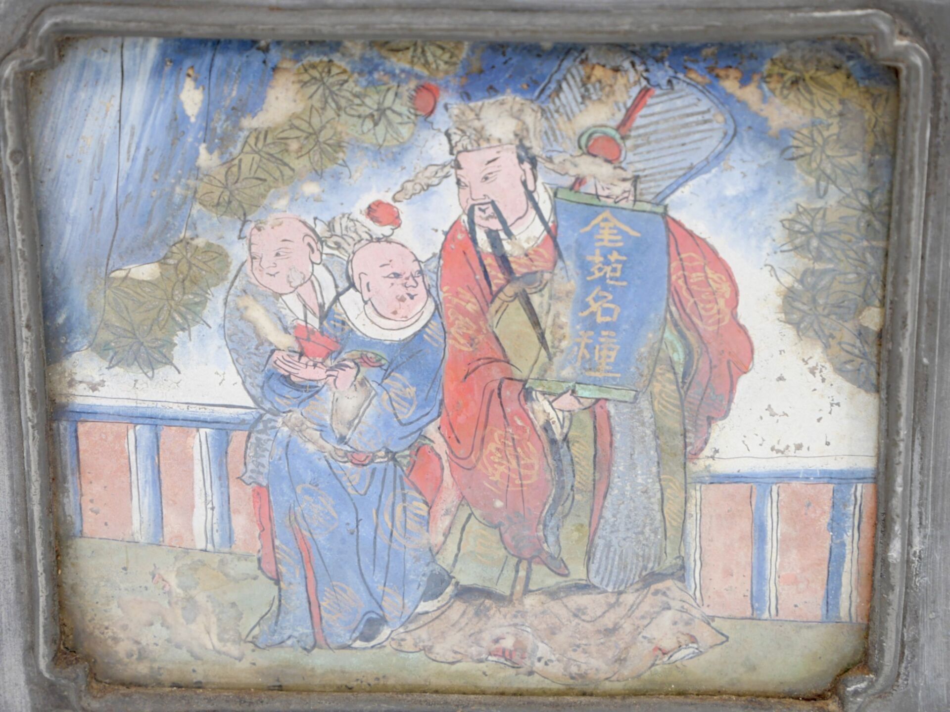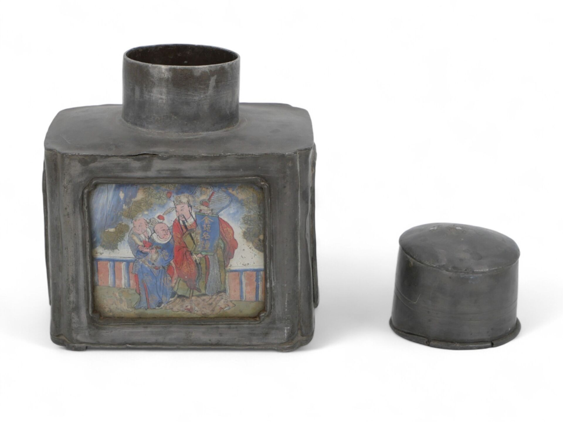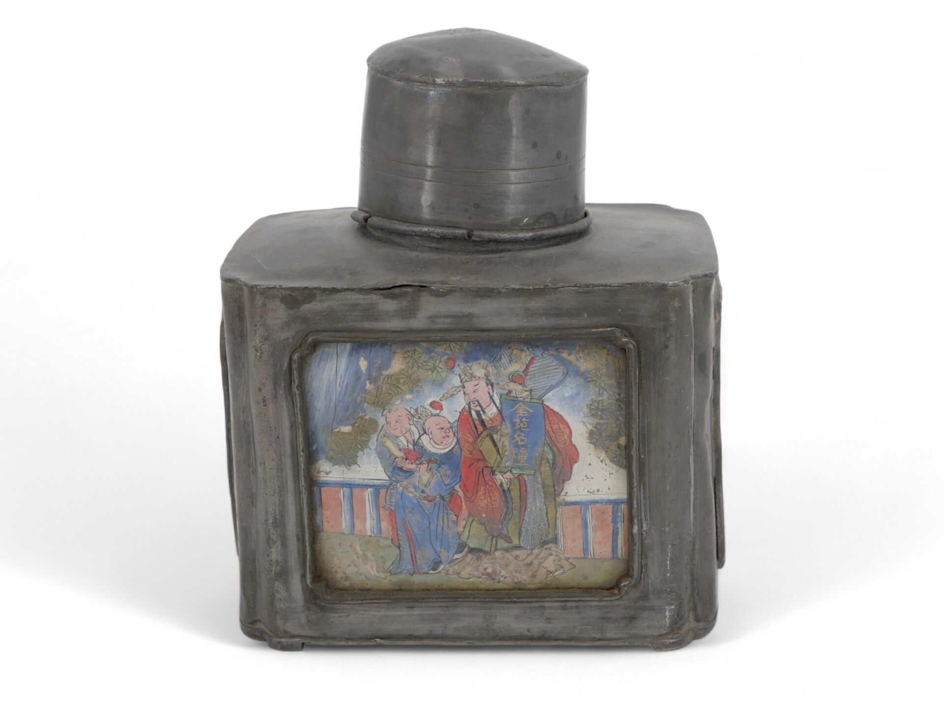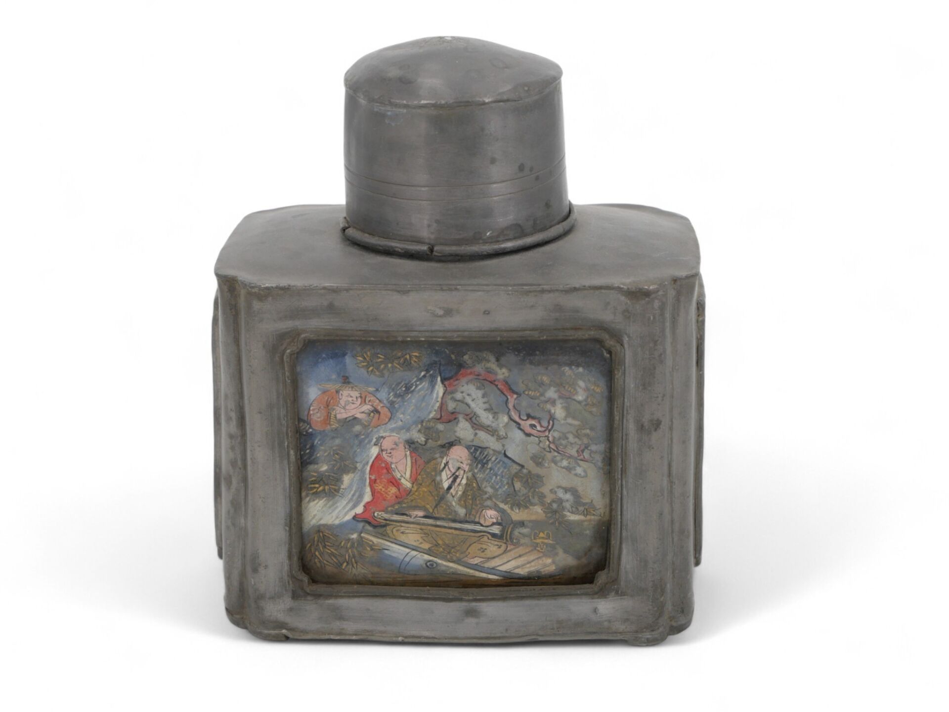 A large rectangular pewter covered tea caddy decorated on two sides with animated gouache scenes.