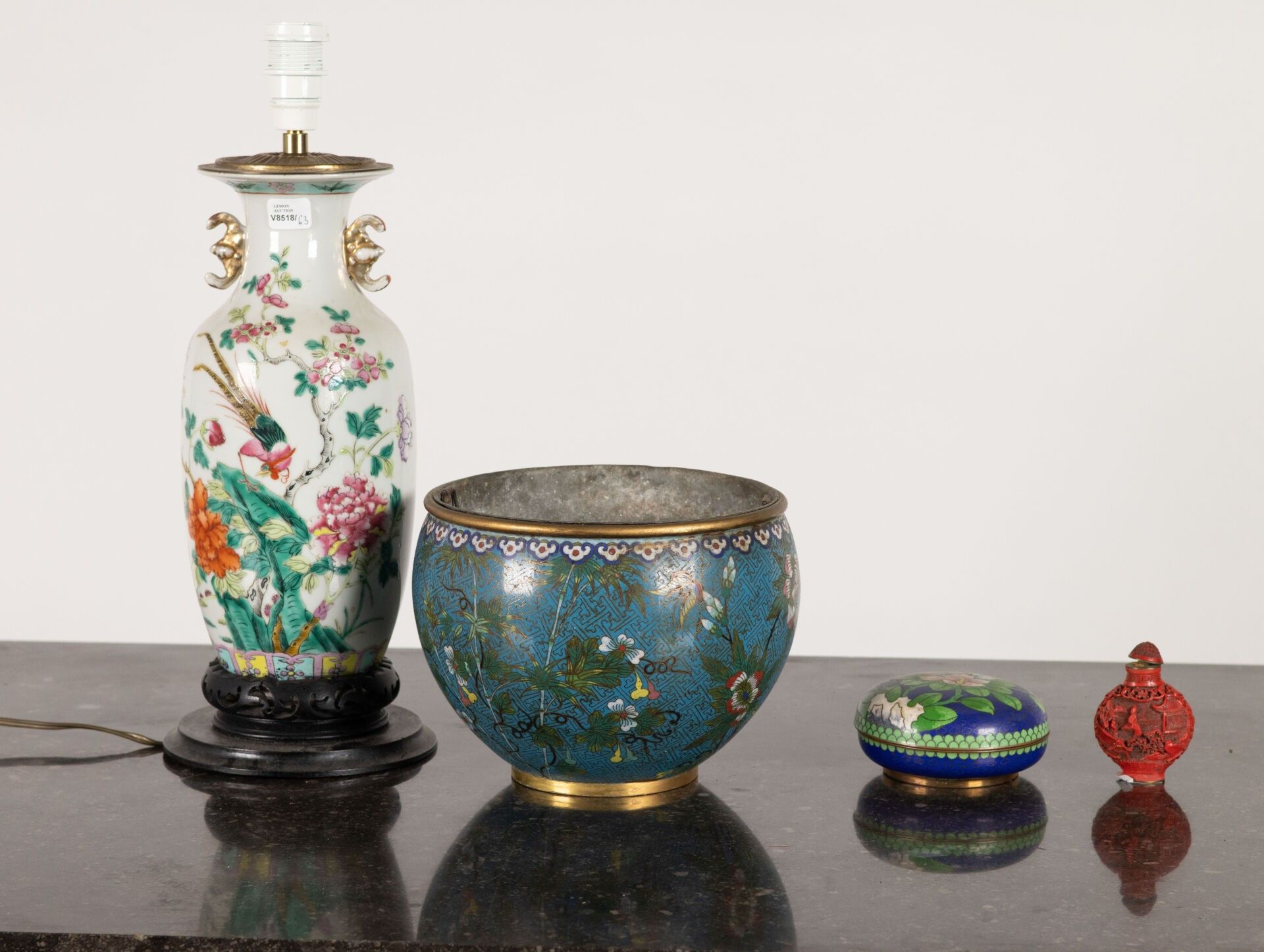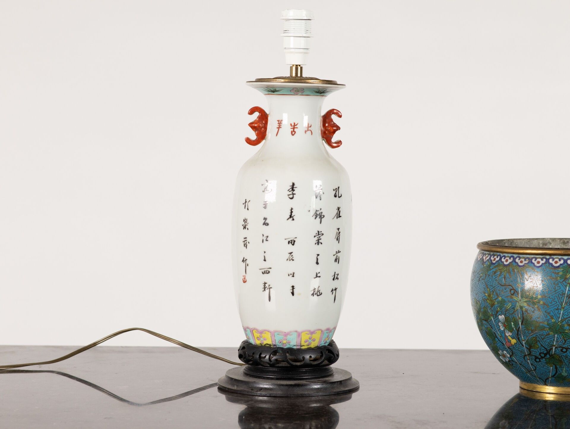 - A porcelain and polychrome enamel lamp vase decorated with birds on branches.