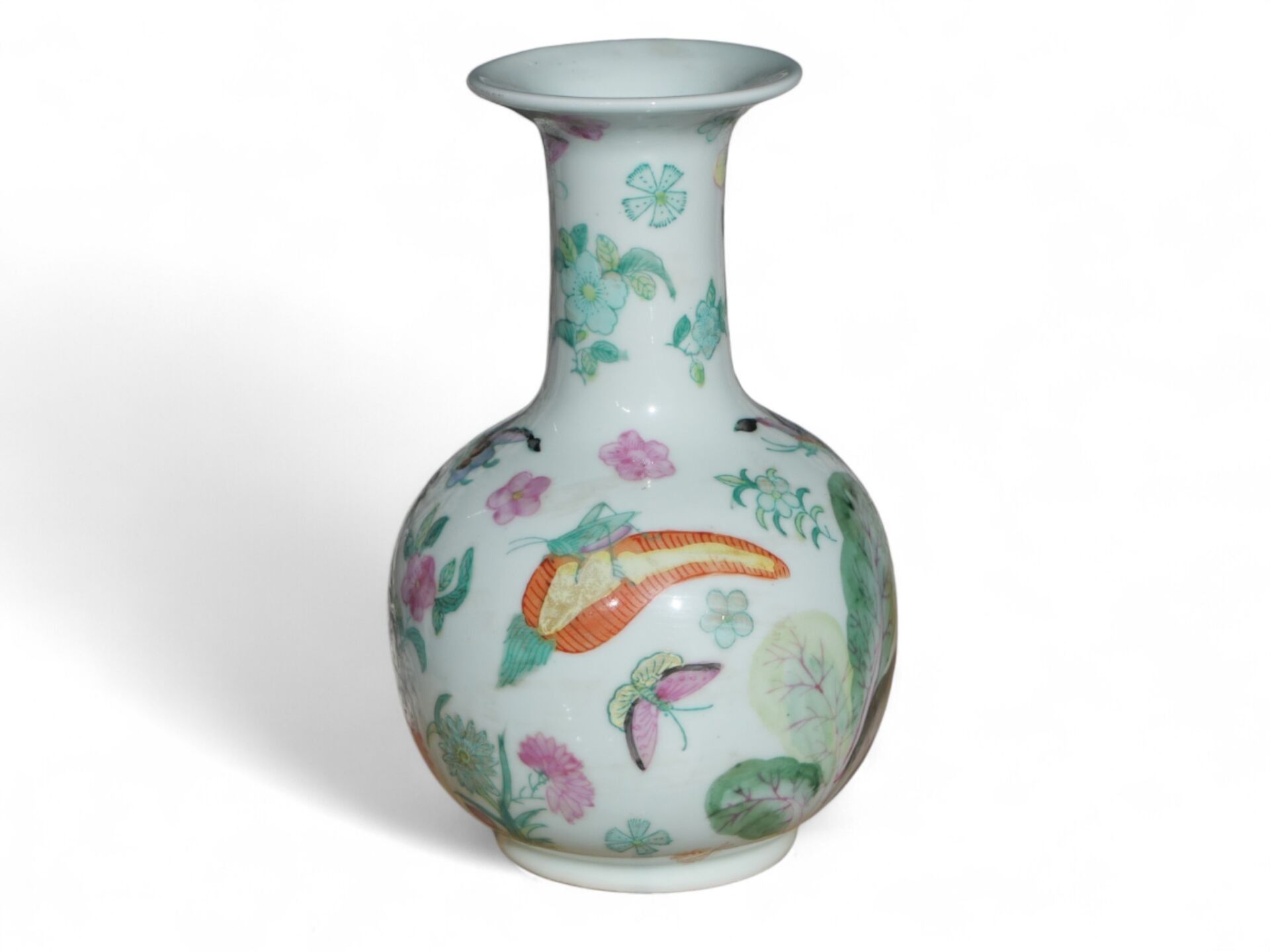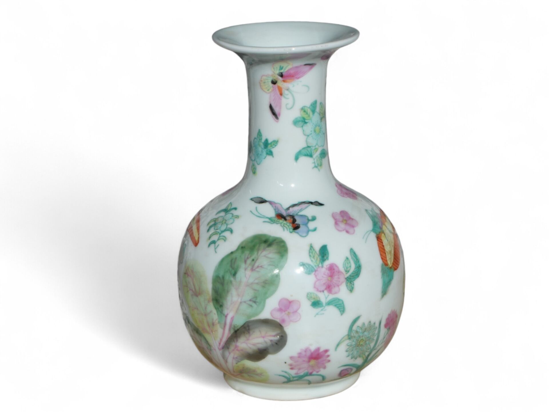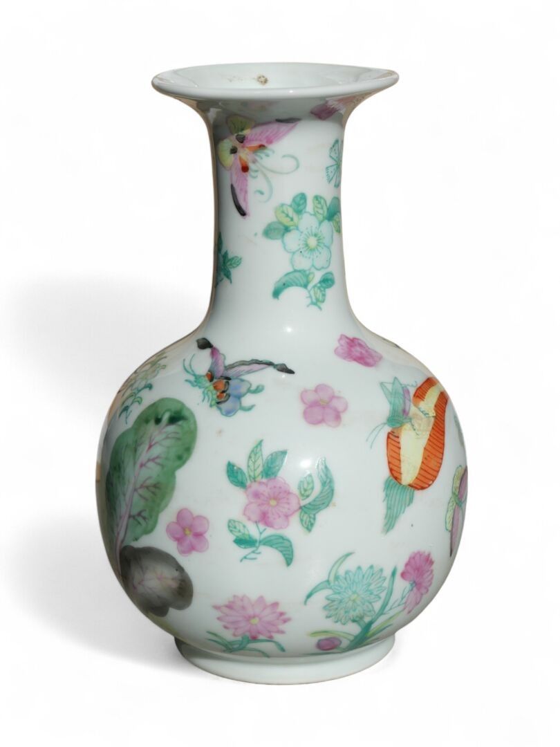 A white porcelain long-necked vase with polychrome enamelled decoration of grasshoppers, butterflies, flowers and vegetables.
