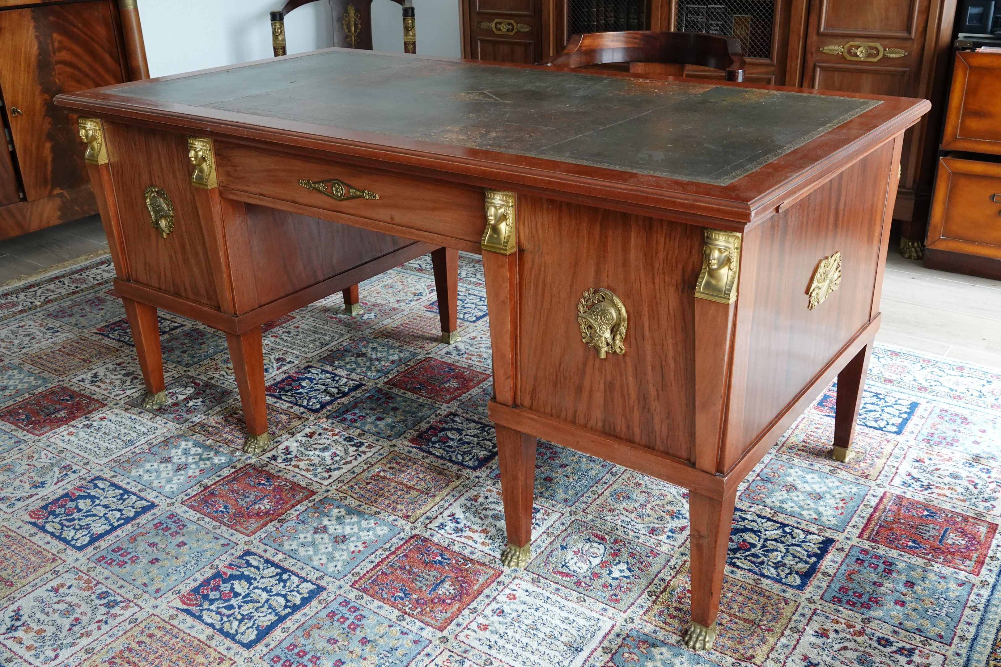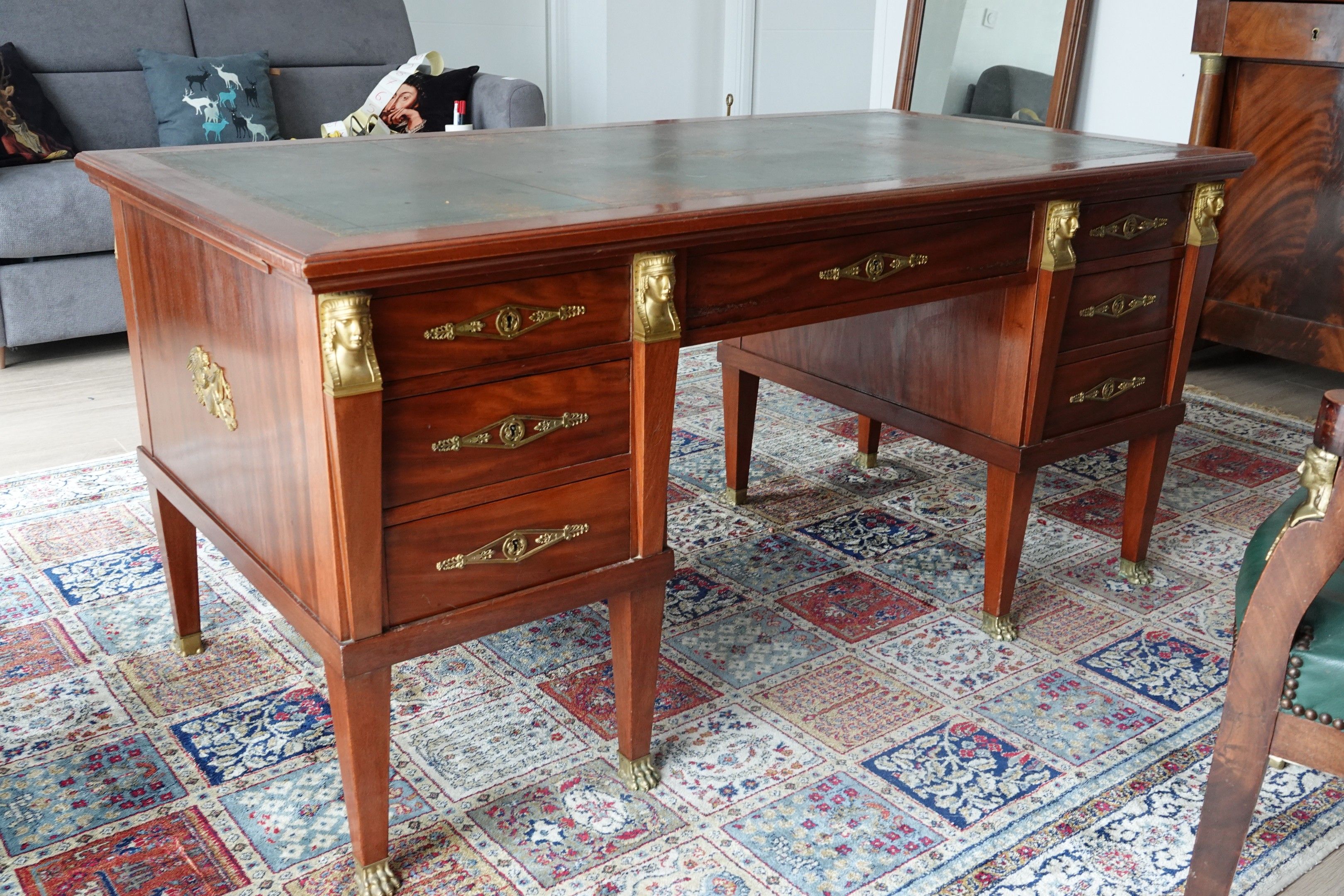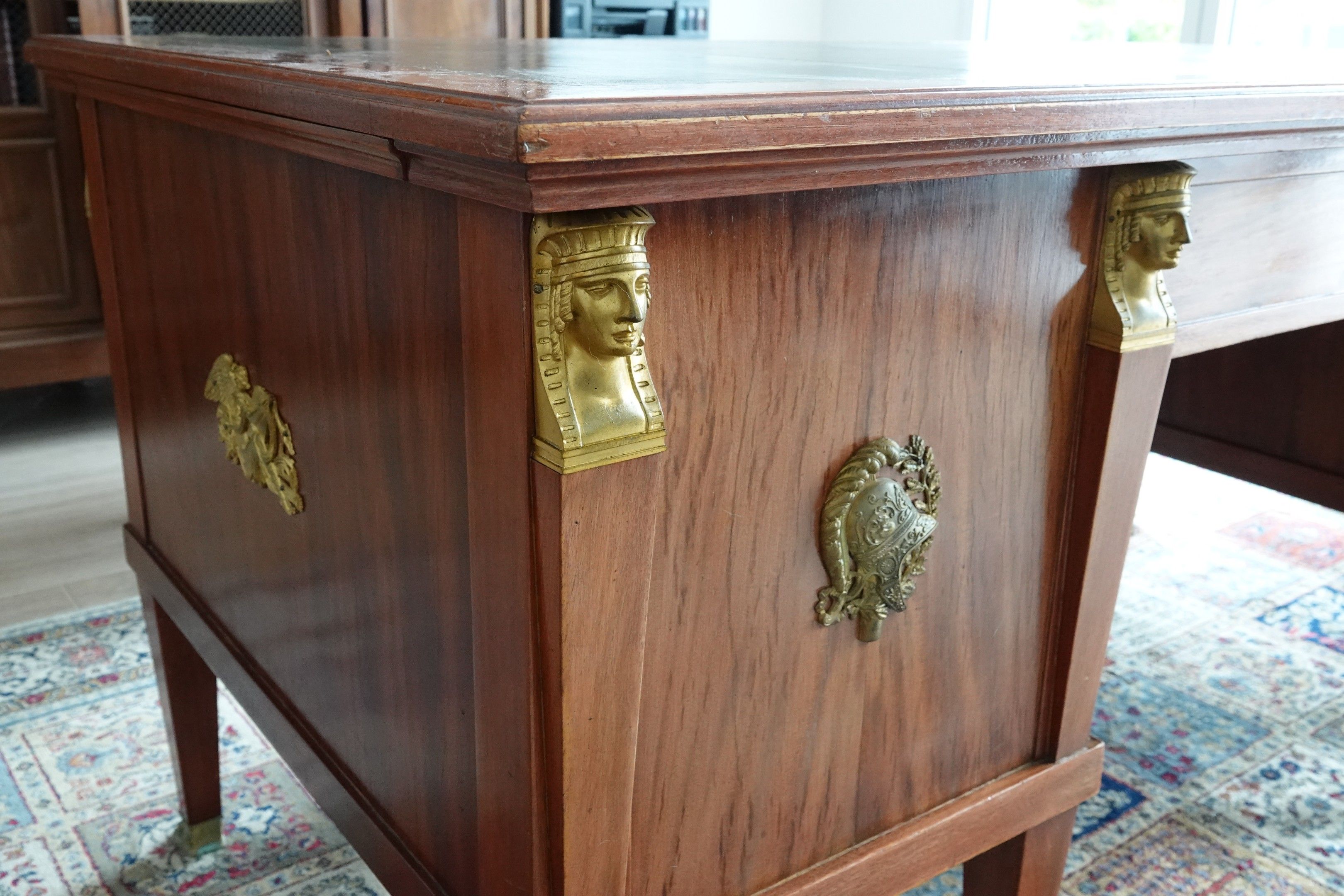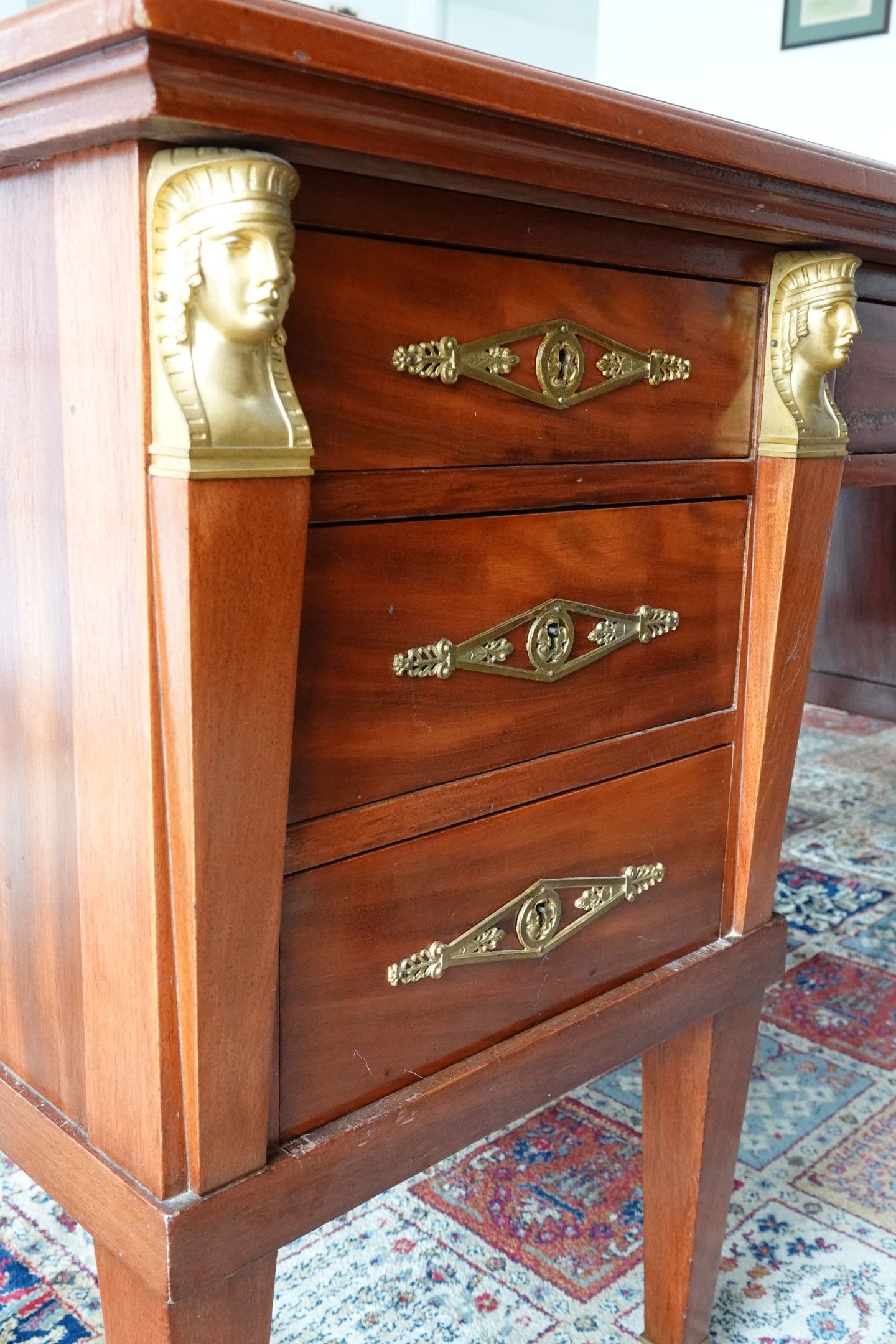 - A mahogany DESKTOP opening to a central drawer flanked by six side drawers and two side pulls.