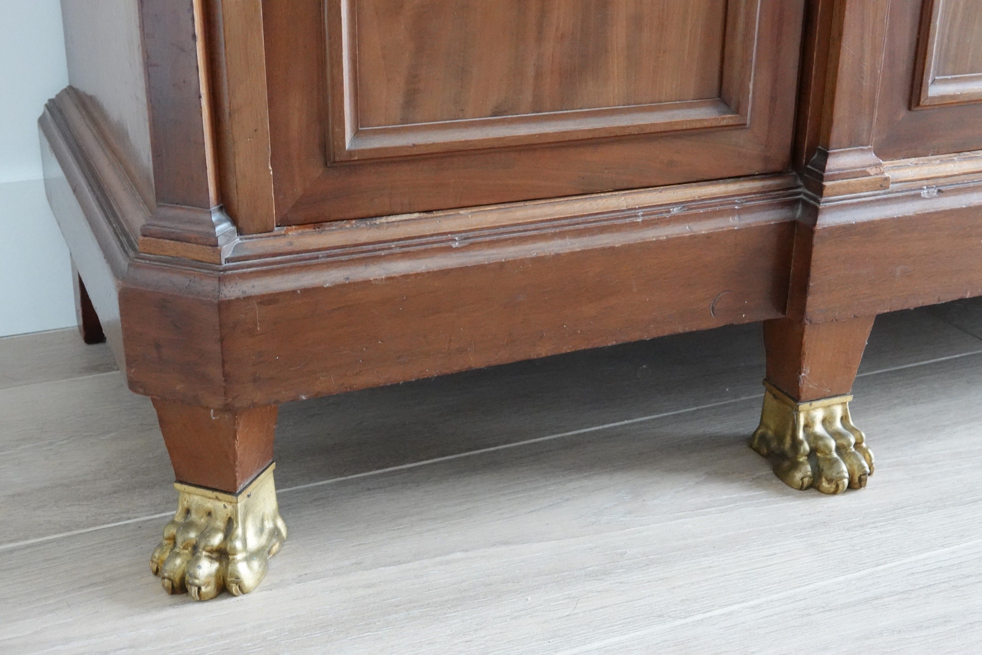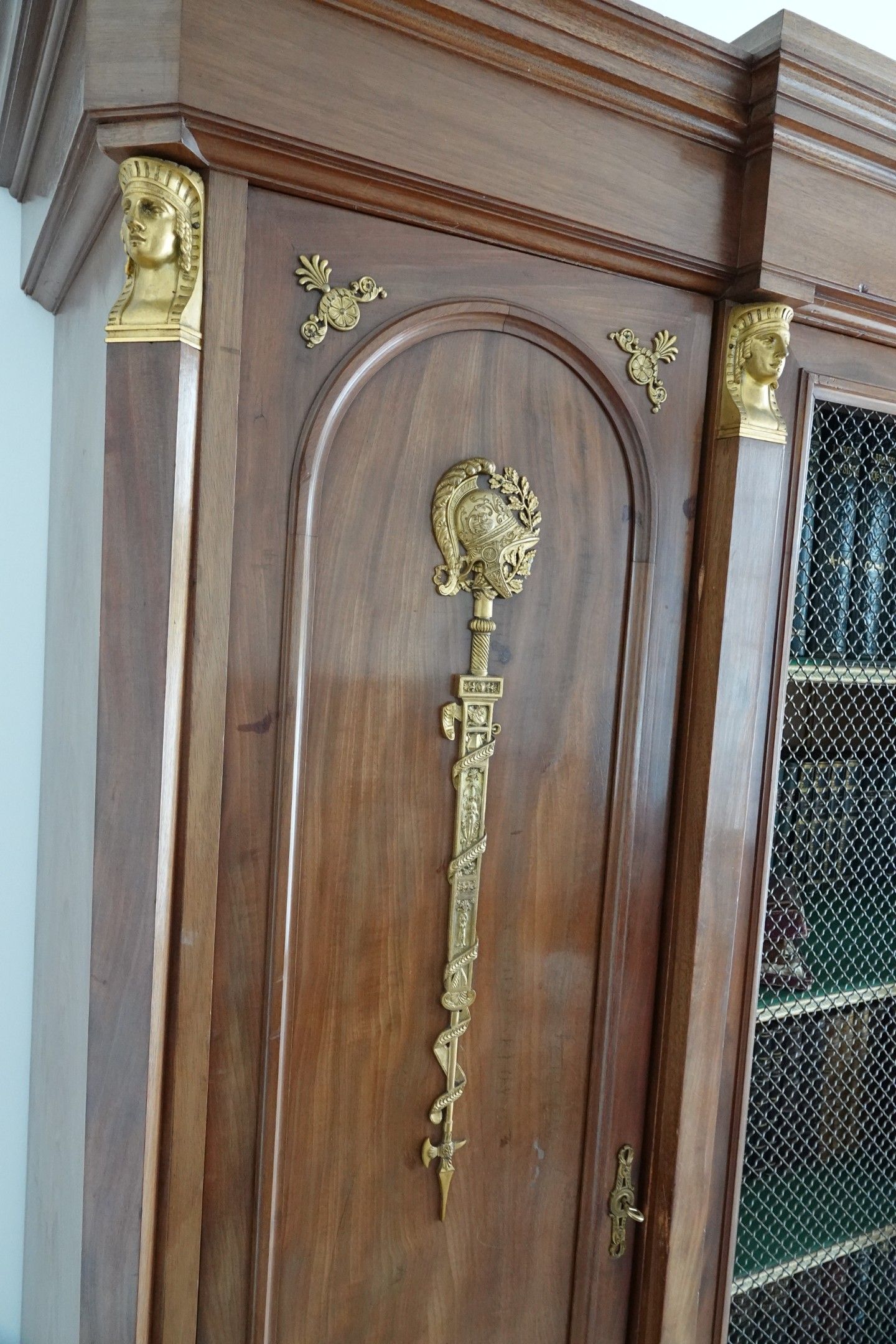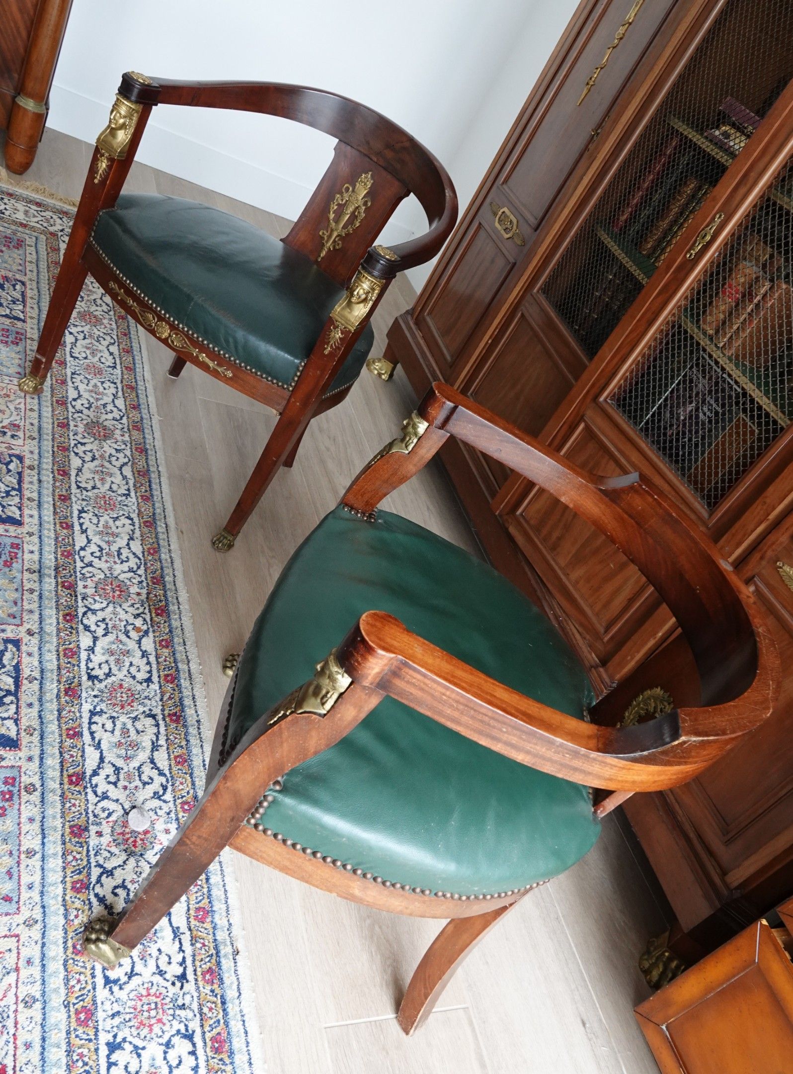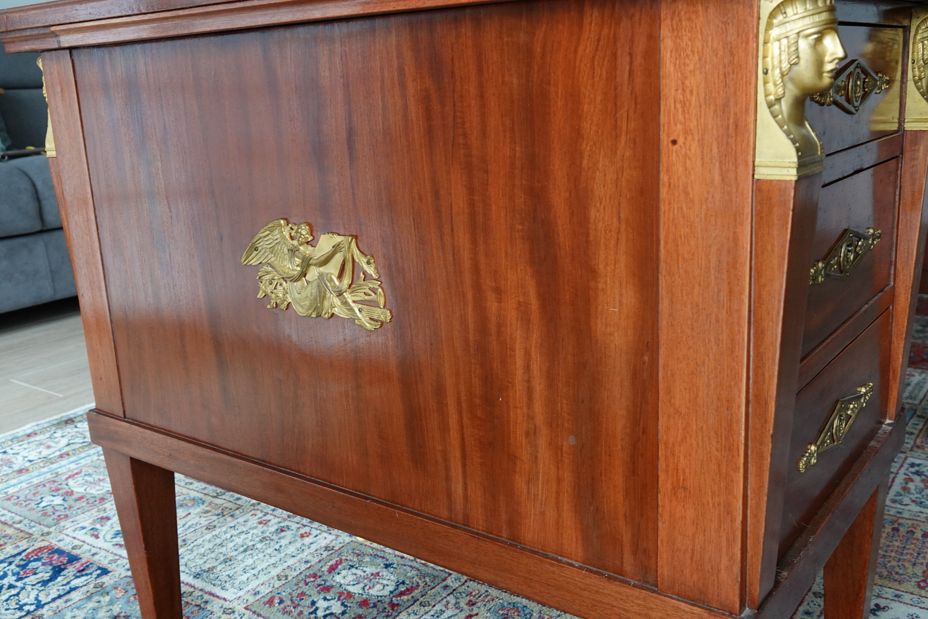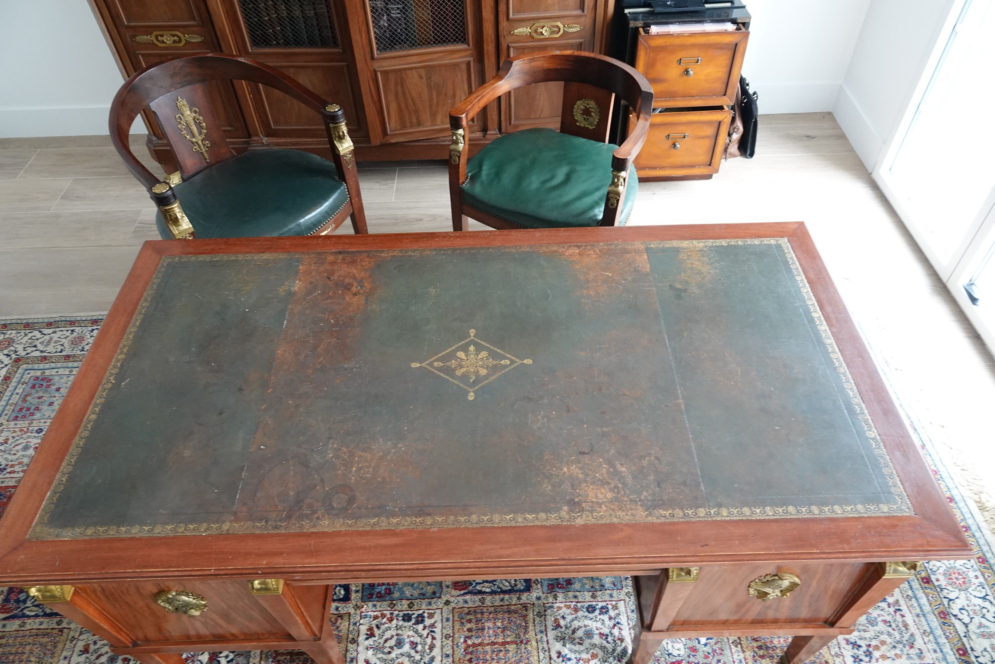 - A mahogany DESKTOP opening to a central drawer flanked by six side drawers and two side pulls.