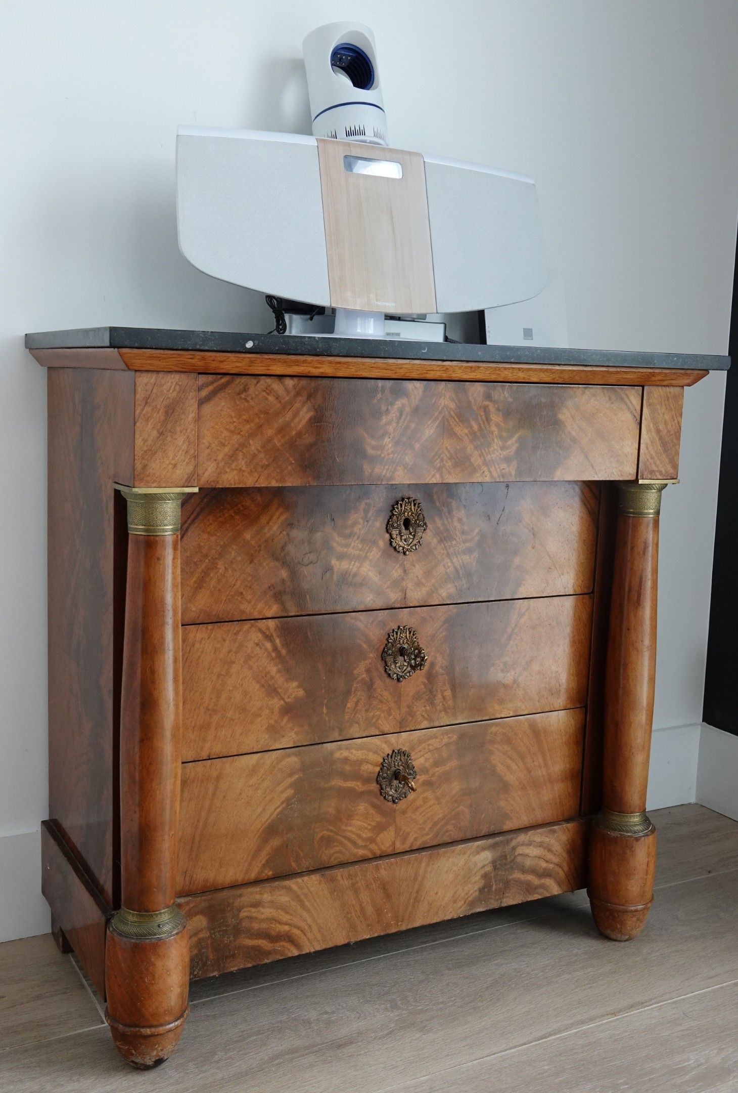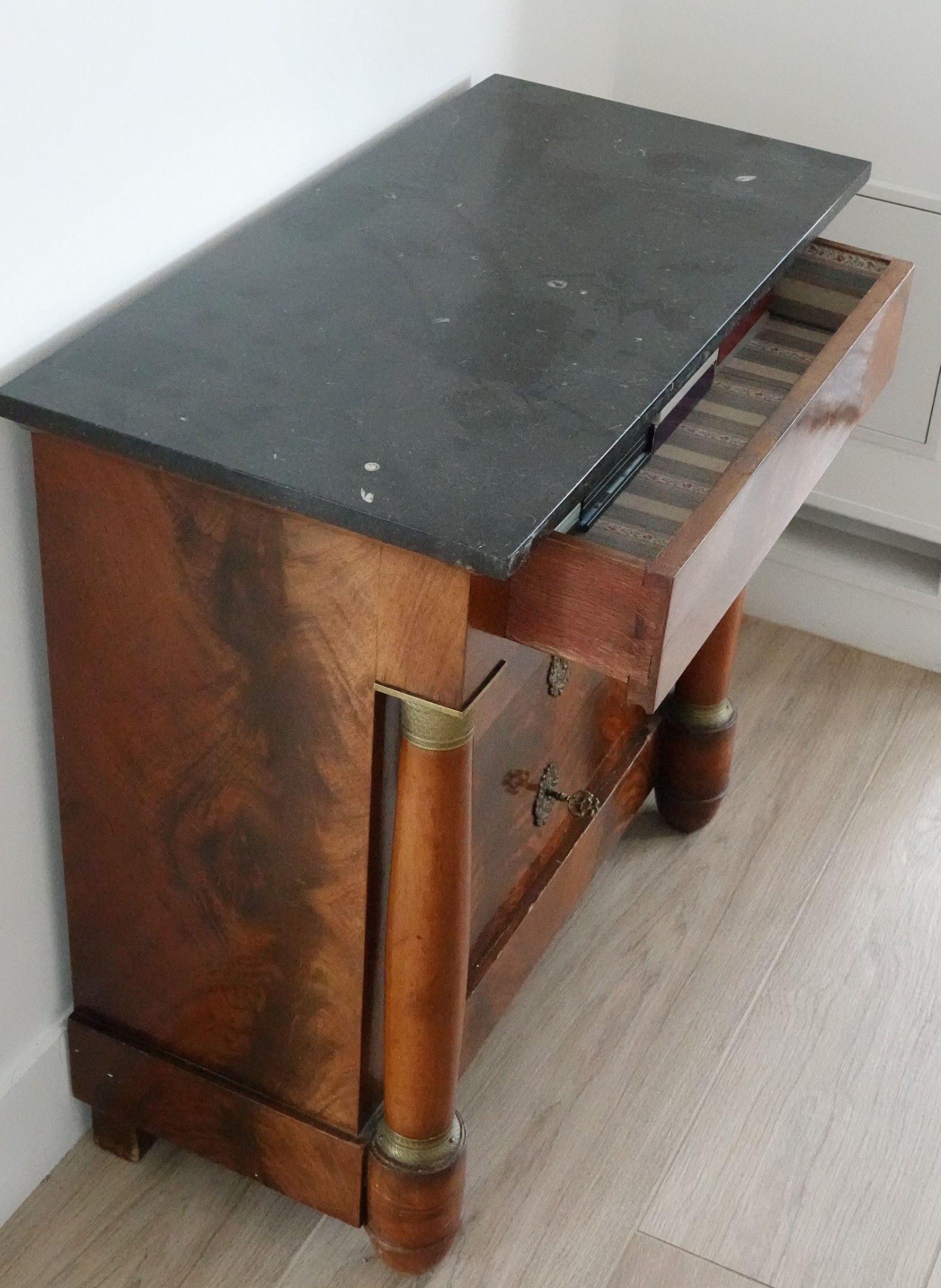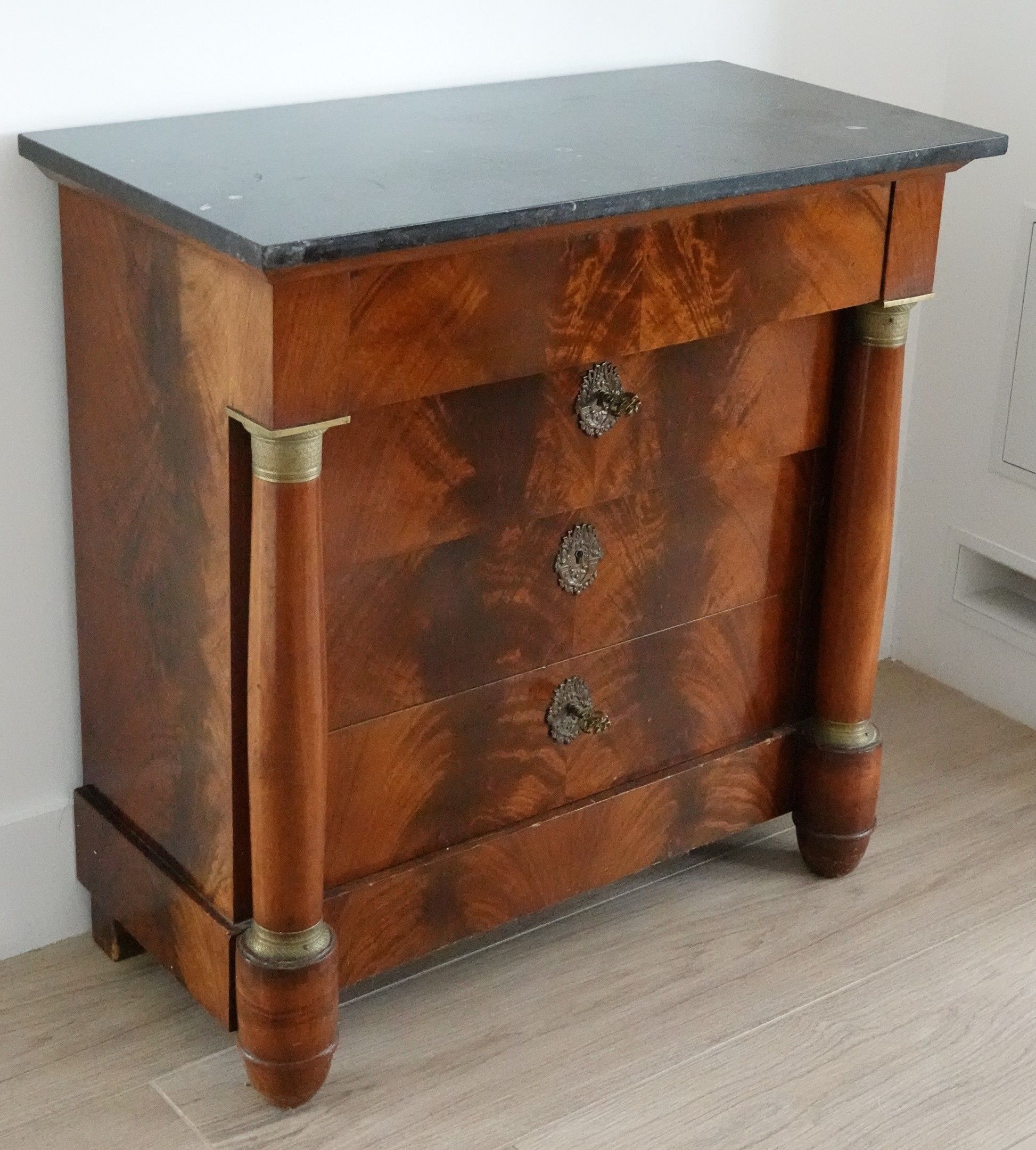 2 LITTLE WOODEN CABINETS in mahogany veneer opening to four drawers, the first of which is recessed to simulate a pediment.