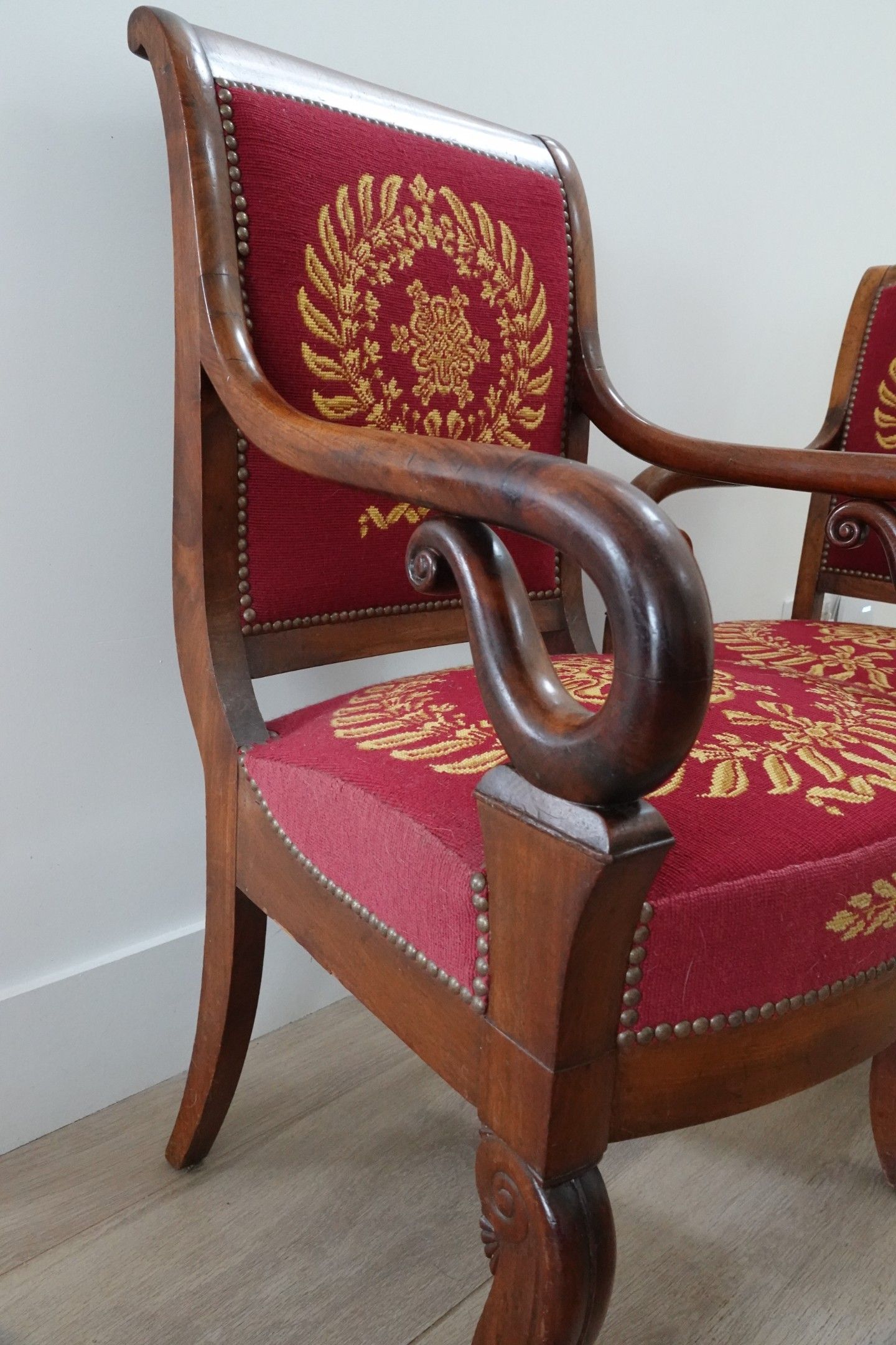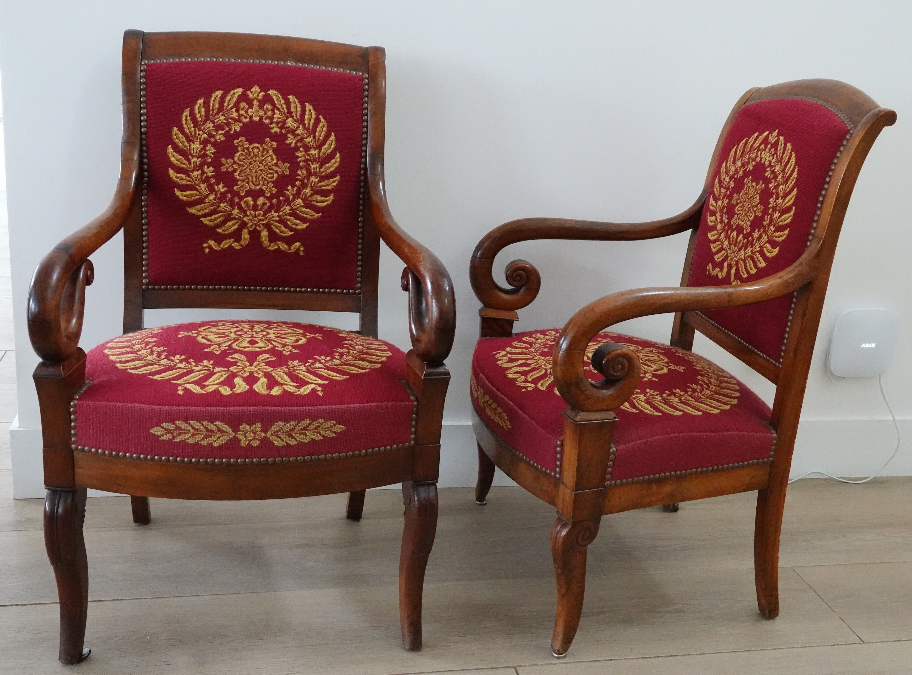 2 mahogany and mahogany veneered armchairs with bracket armrests upholstered in petit point tapestry decorated with laurel wreaths and flowers on a purple background.