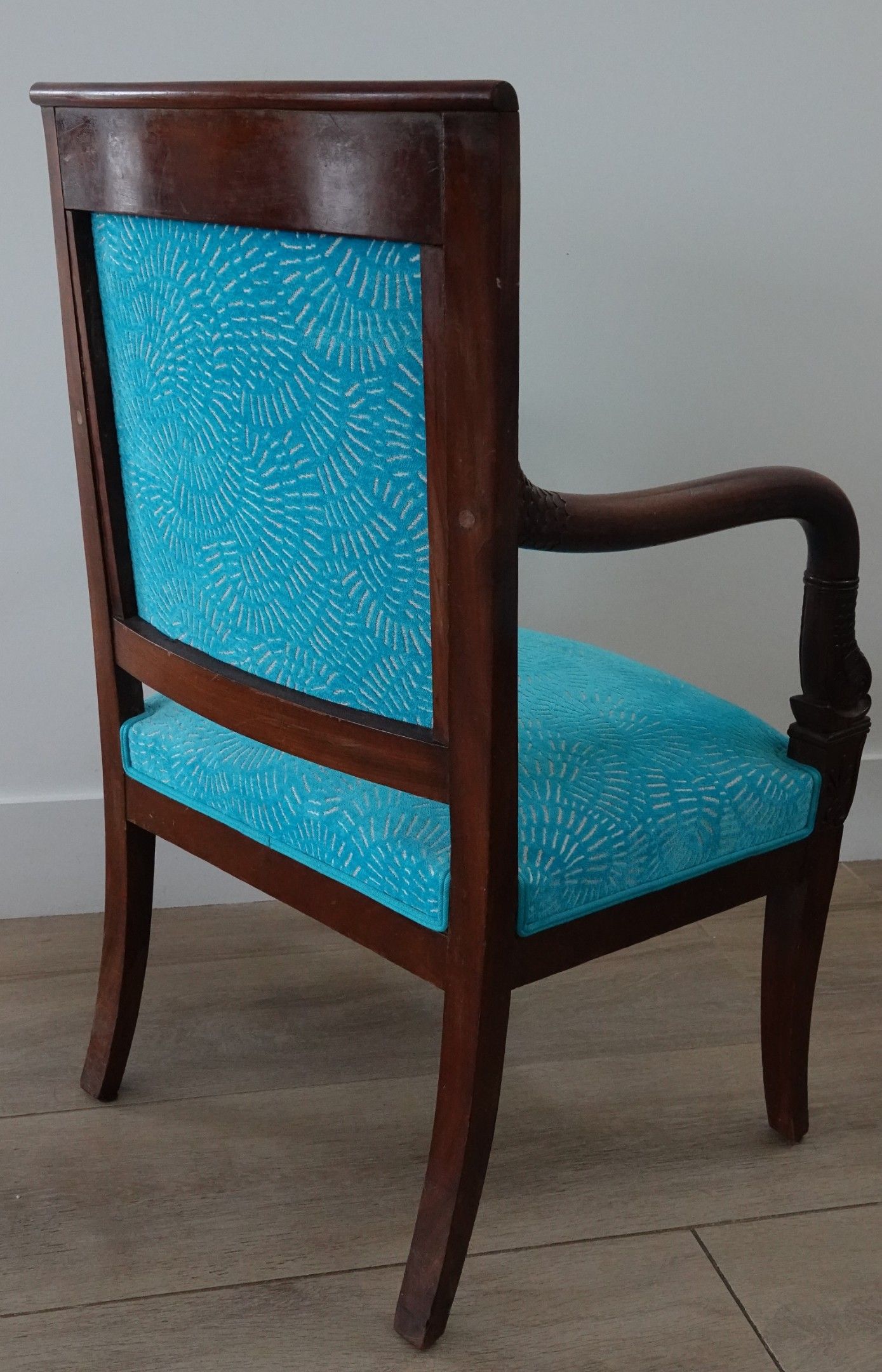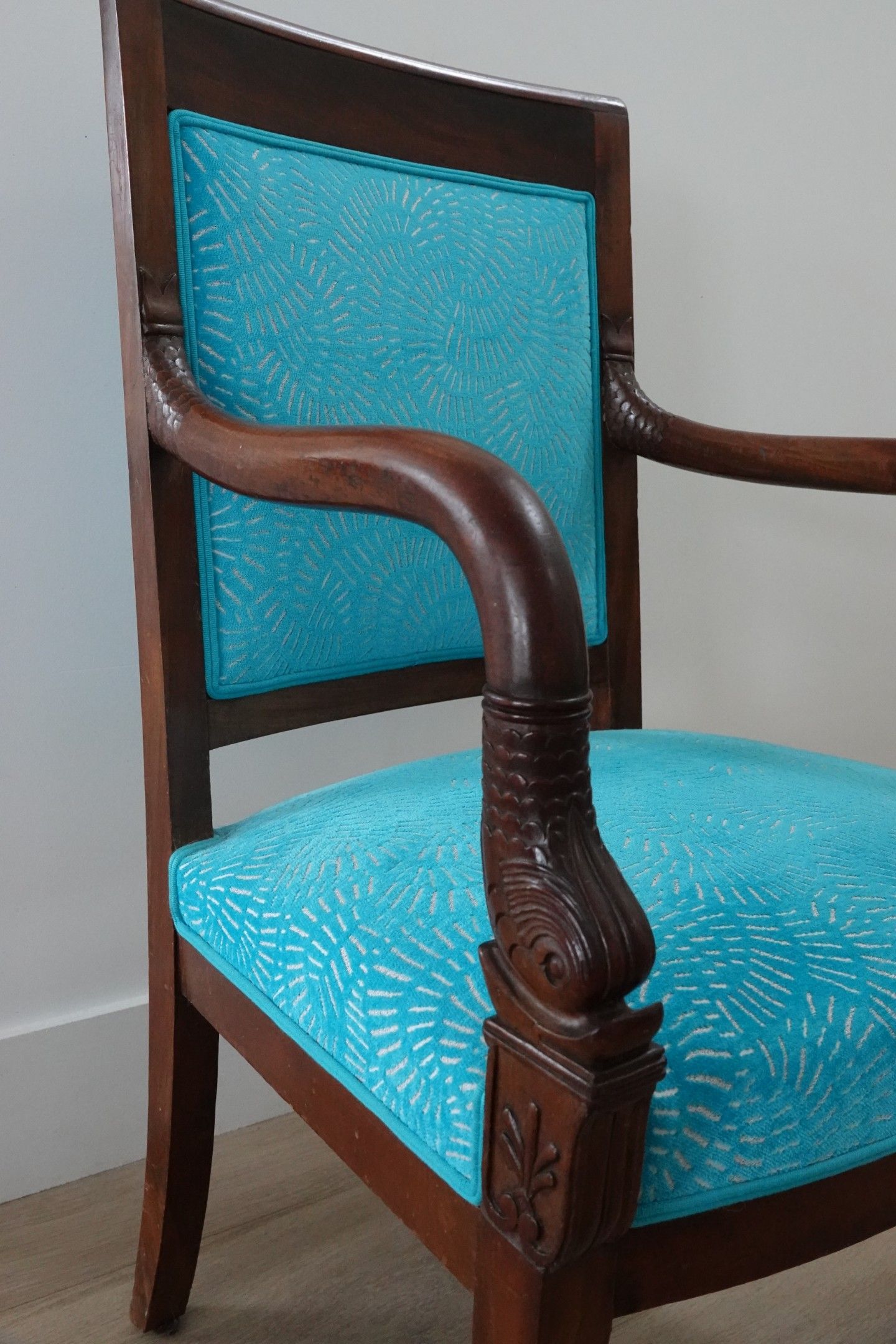PAIR OF ARMCHAIRS in mahogany and mahogany veneer with arm brackets terminating in dolphin heads and ending in a scaled tail.