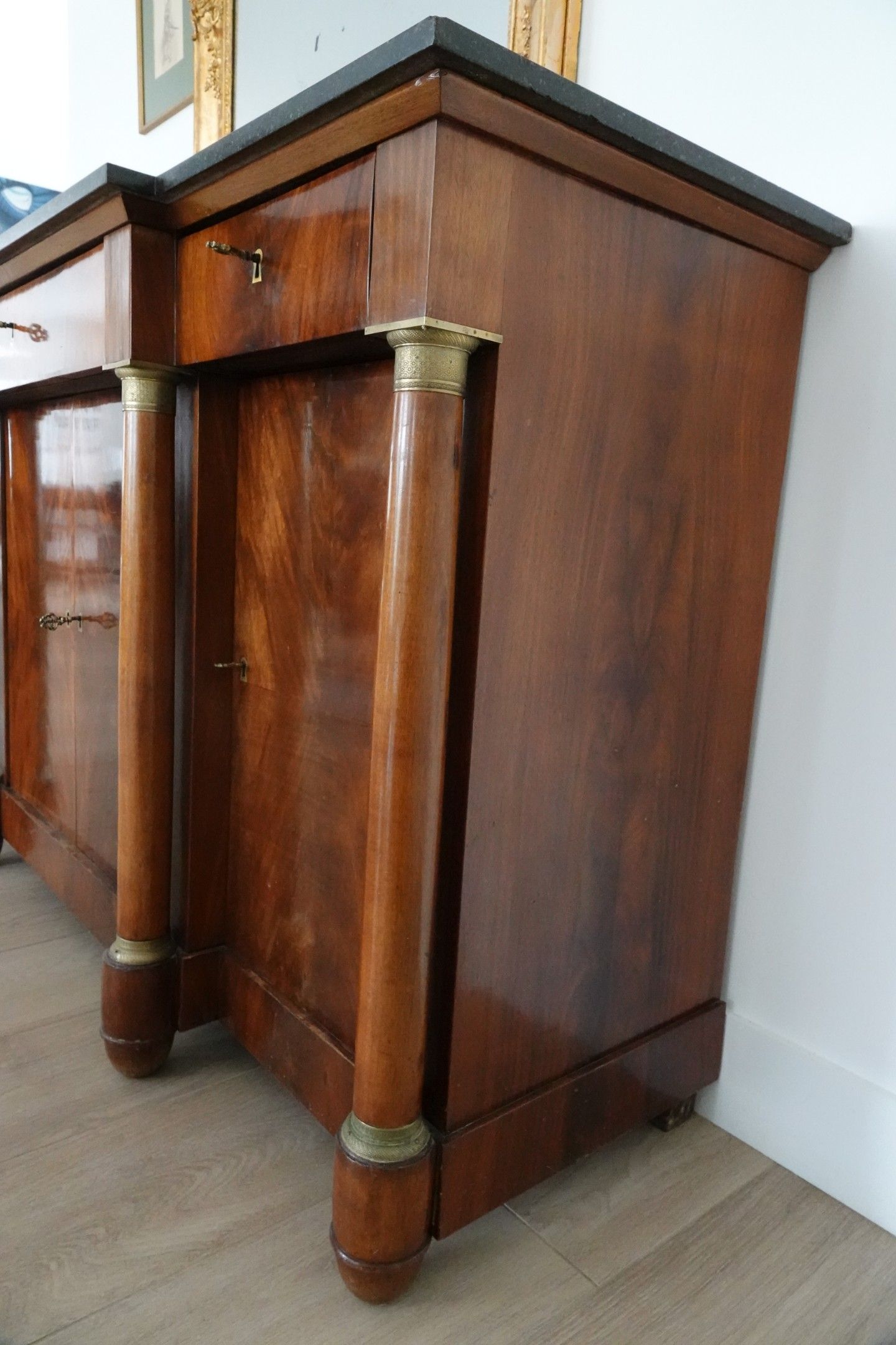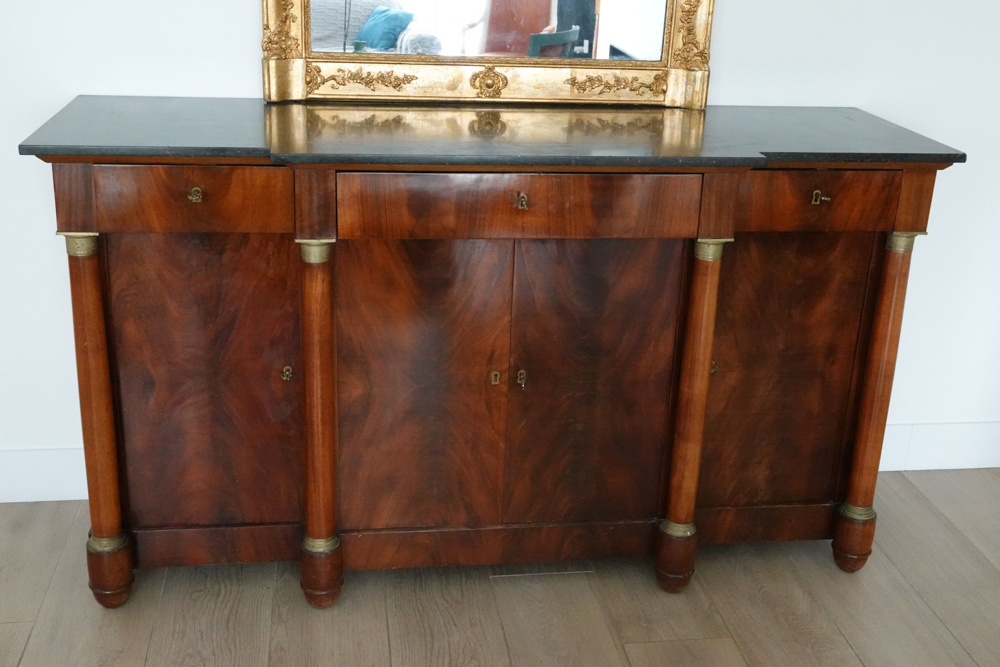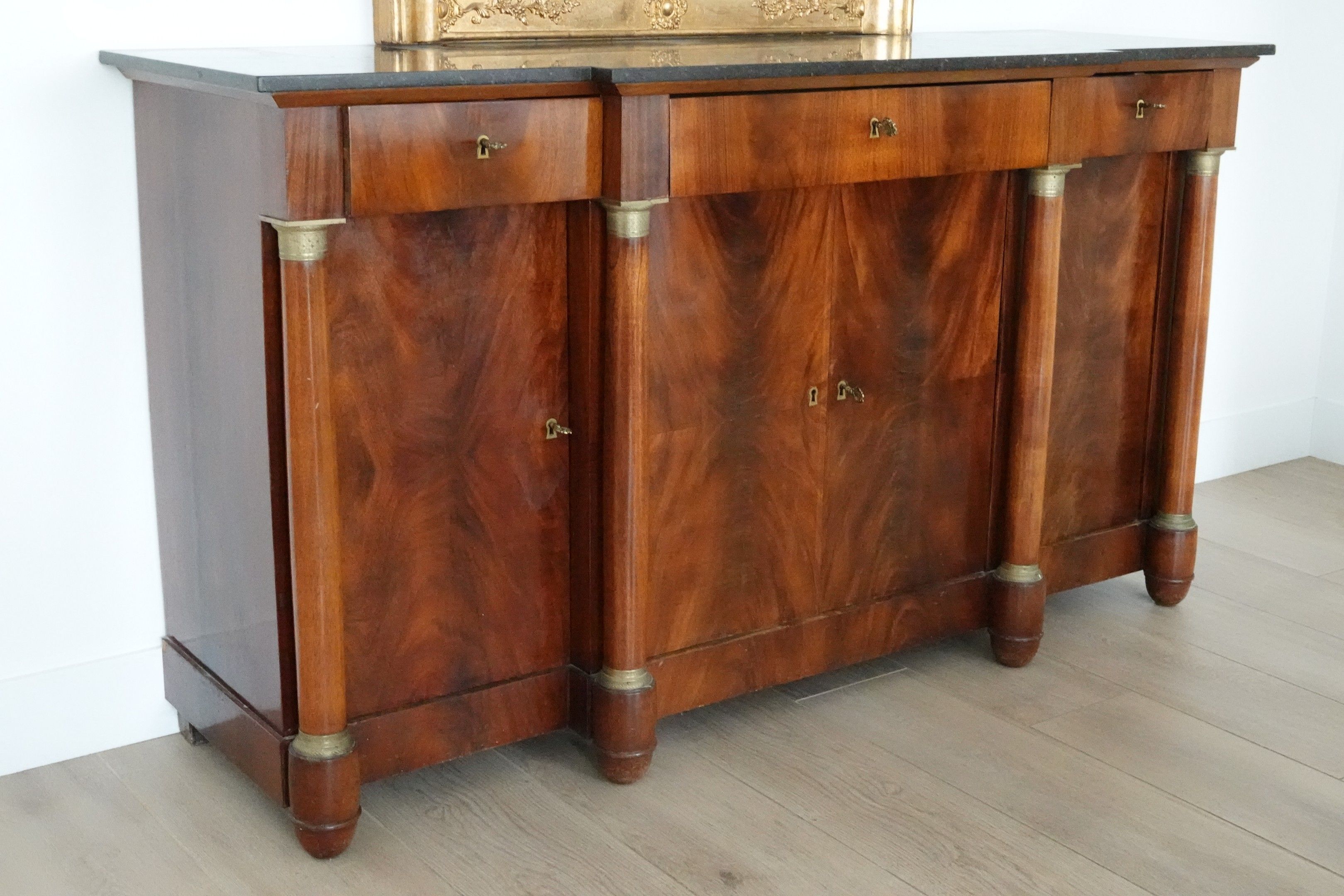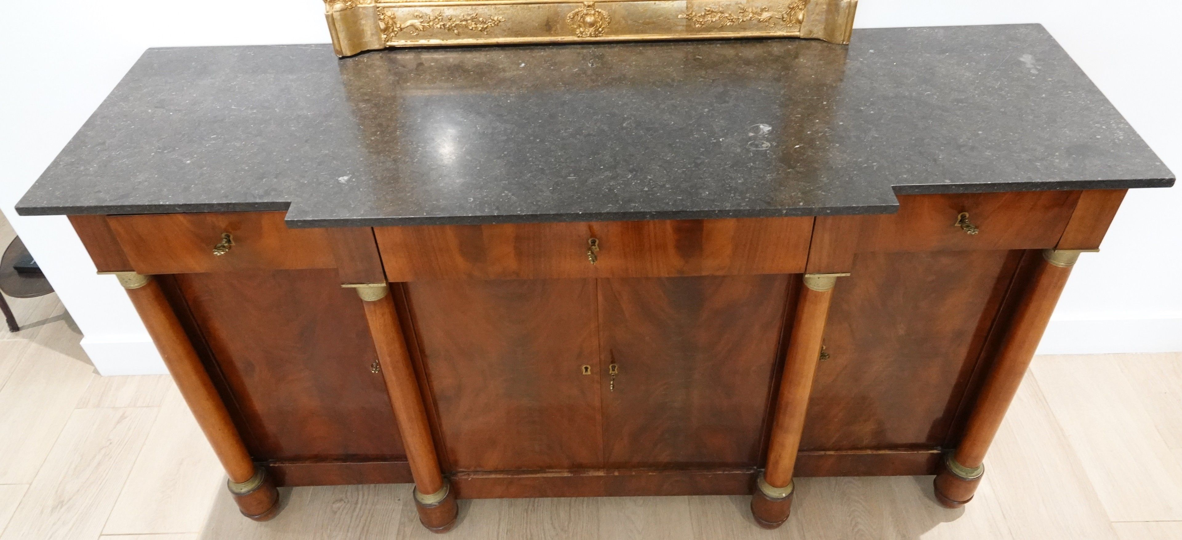 A mahogany and flowered mahogany veneer ENFILADE with a central projection. The front is decorated with four detached columns. It opens to reveal three drawers and four leaves.