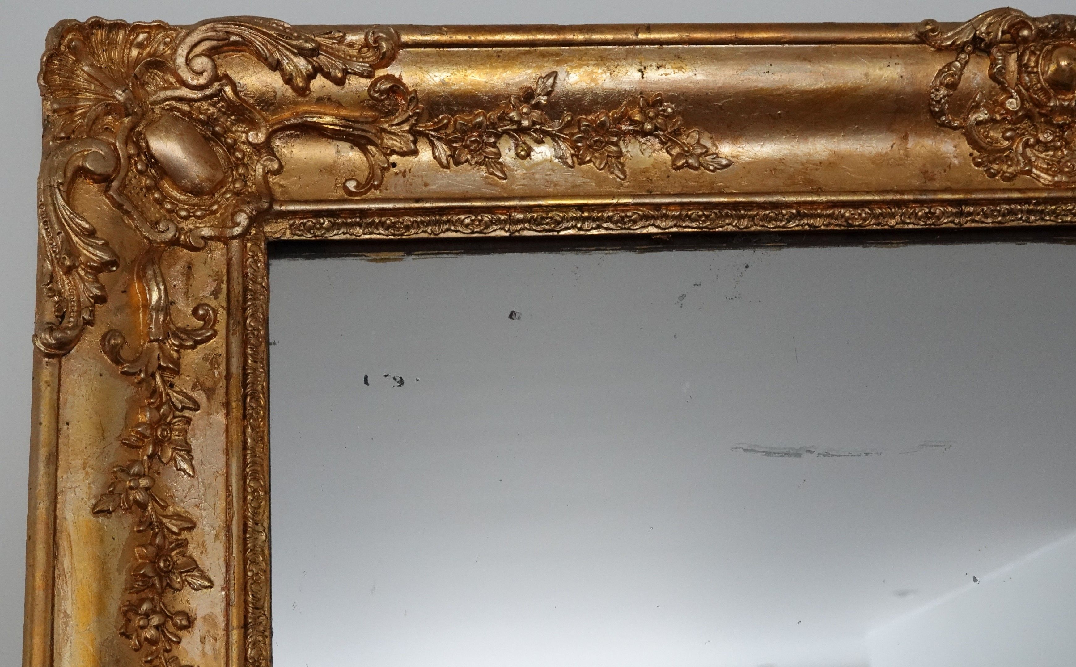 Gilded stuccoed wood mantel mirror decorated with acanthus leaves and leather spandrels.