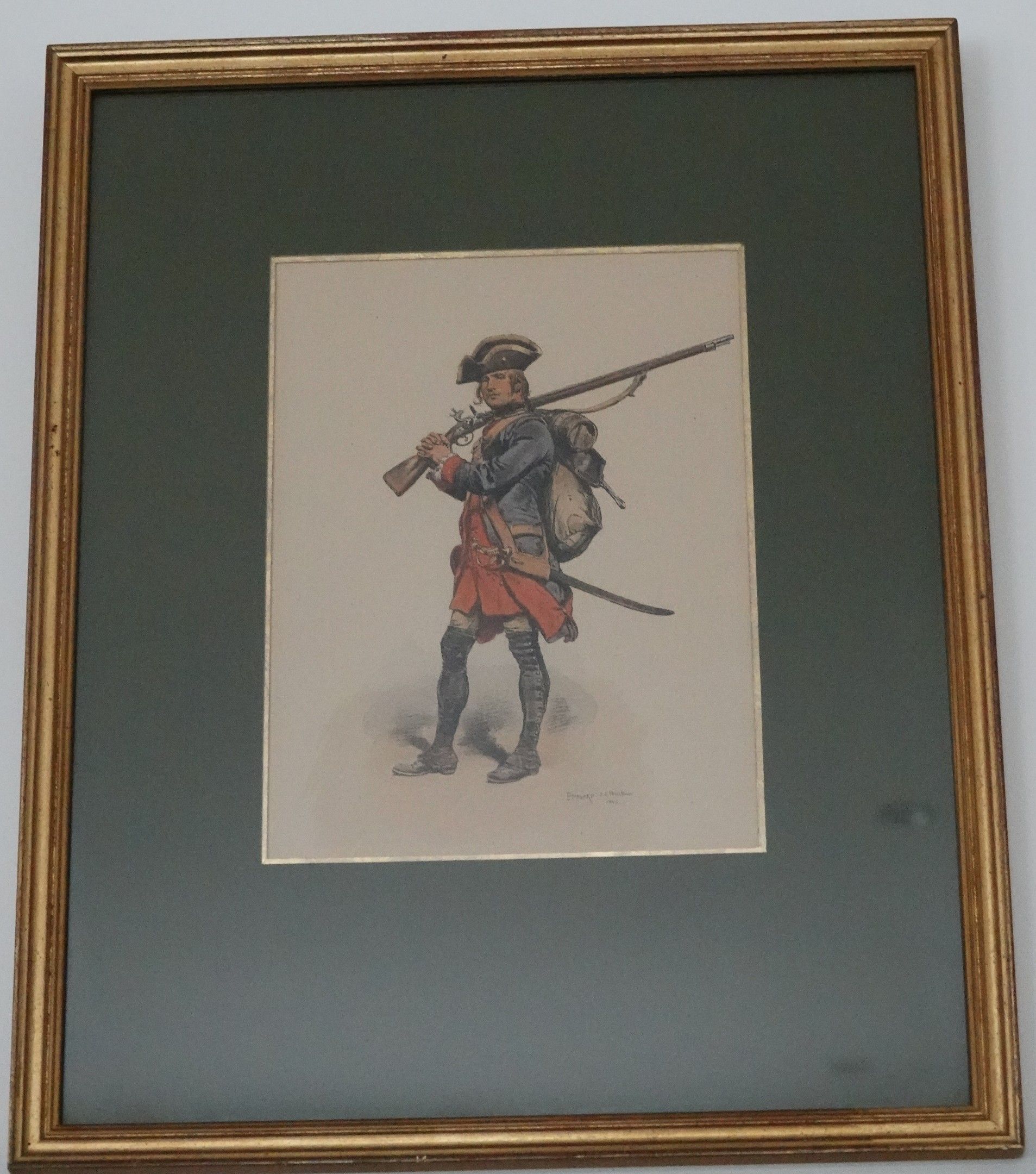 EDOUARD DETAILLE (1848-1912) Fantassin, two colour engravings. Total dimensions with moulded wood and gilt frame: 39.5 x 32 cm.