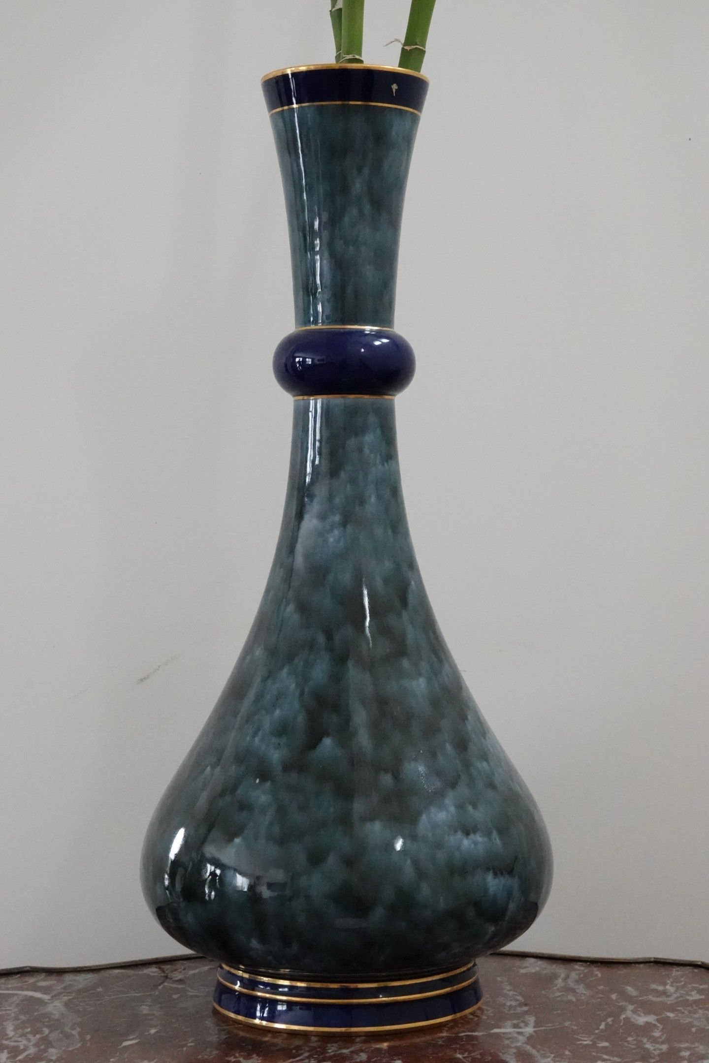 An ovoid porcelain vase with blue-grey marbled decoration decorated with midnight blue reserves and rings highlighted with gilding.