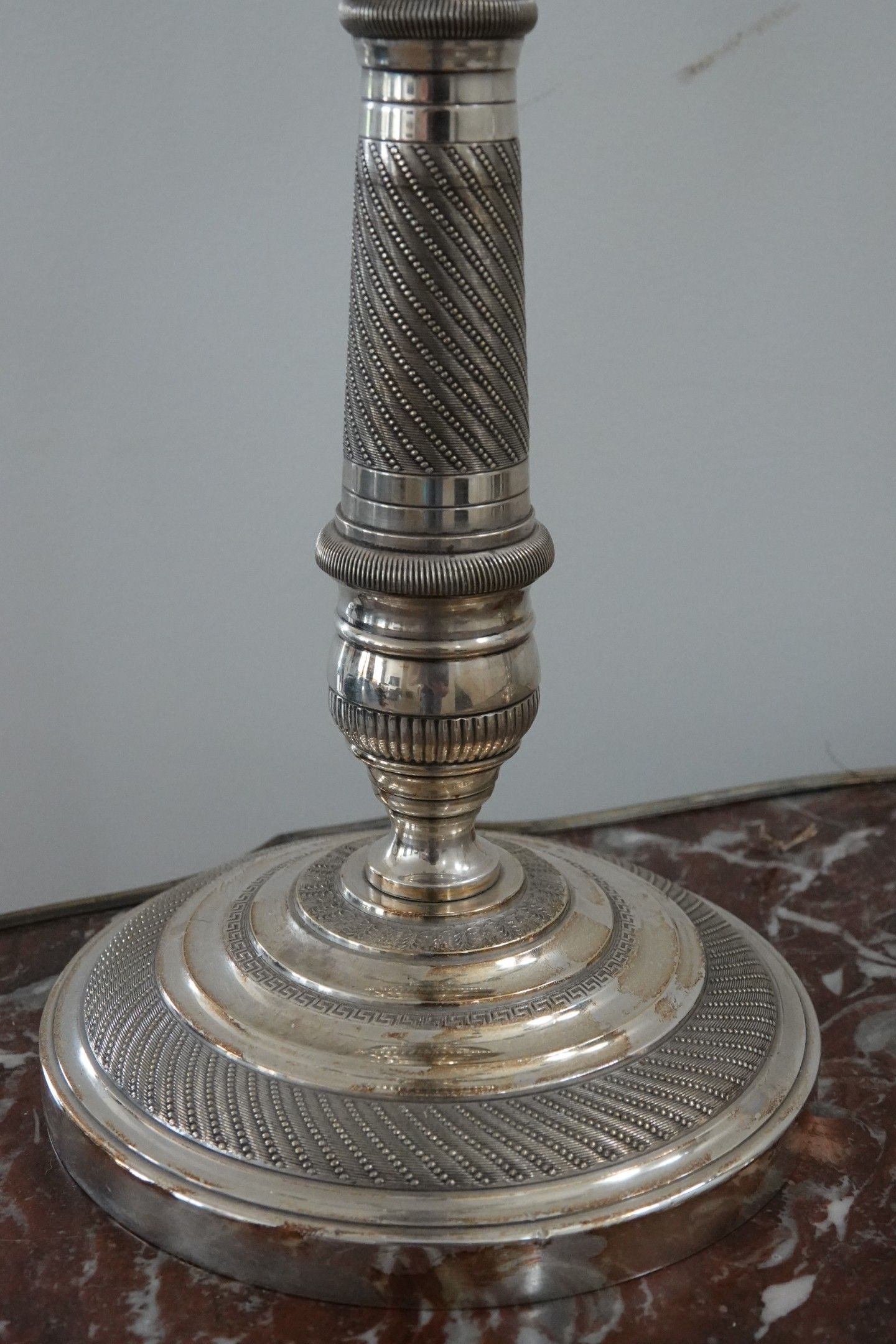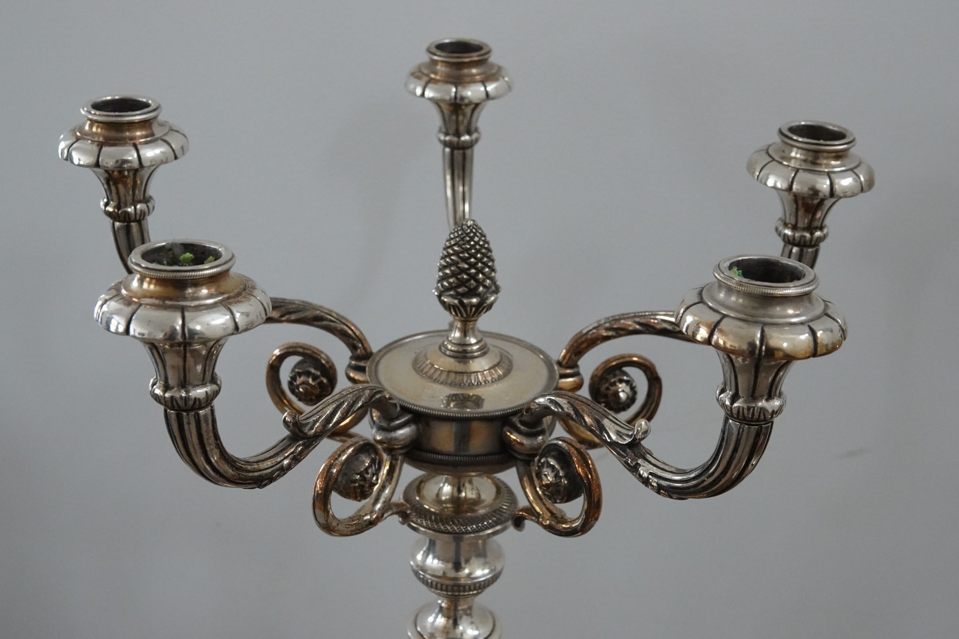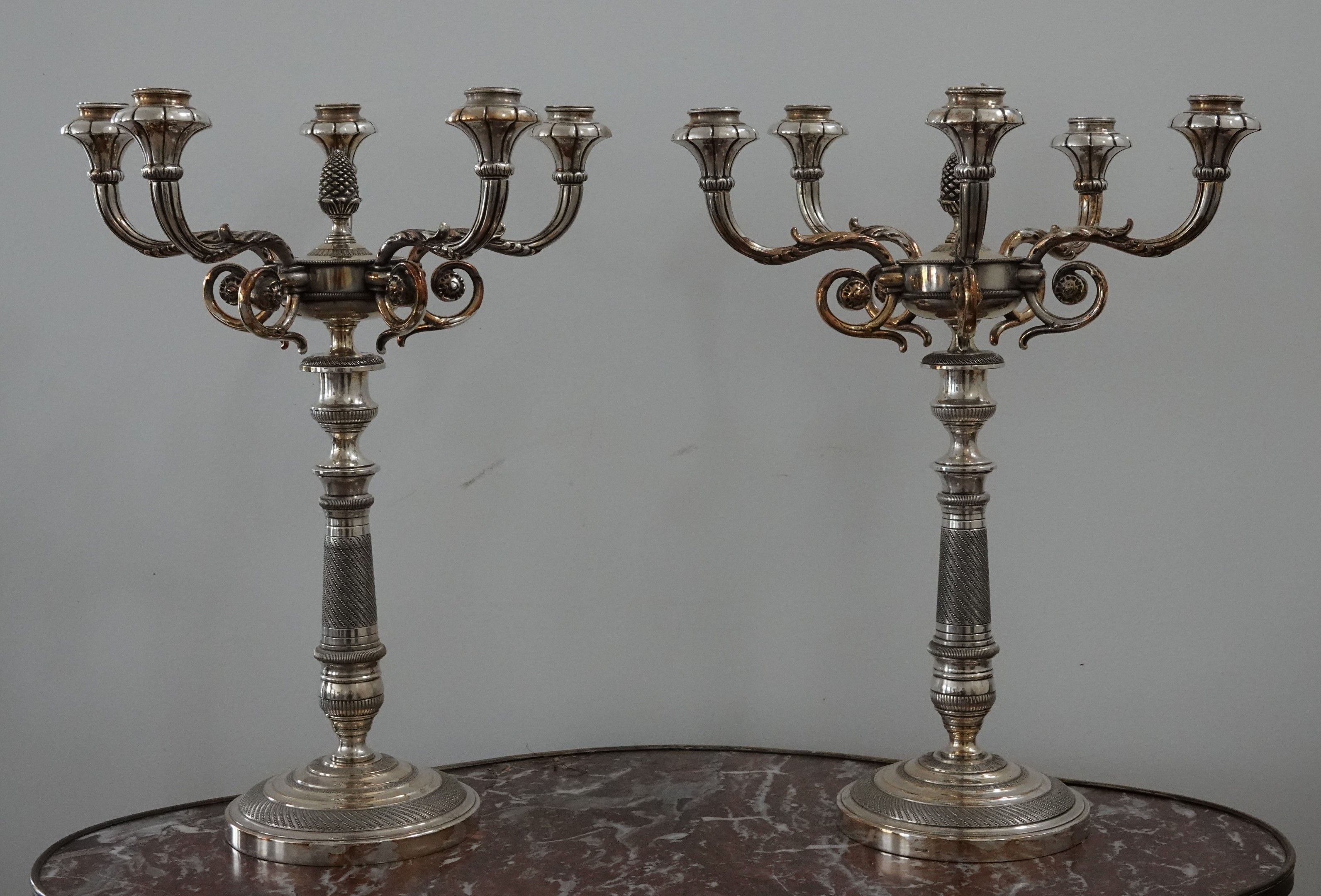 PAIR OF CANDELABRES in silver-plated metal with five gadrooned light branches, Greek motifs and garlands of twisted pearls and guilloché reserves.