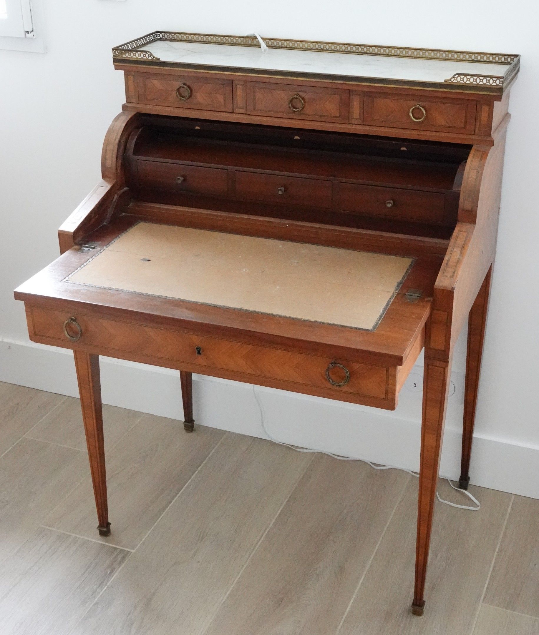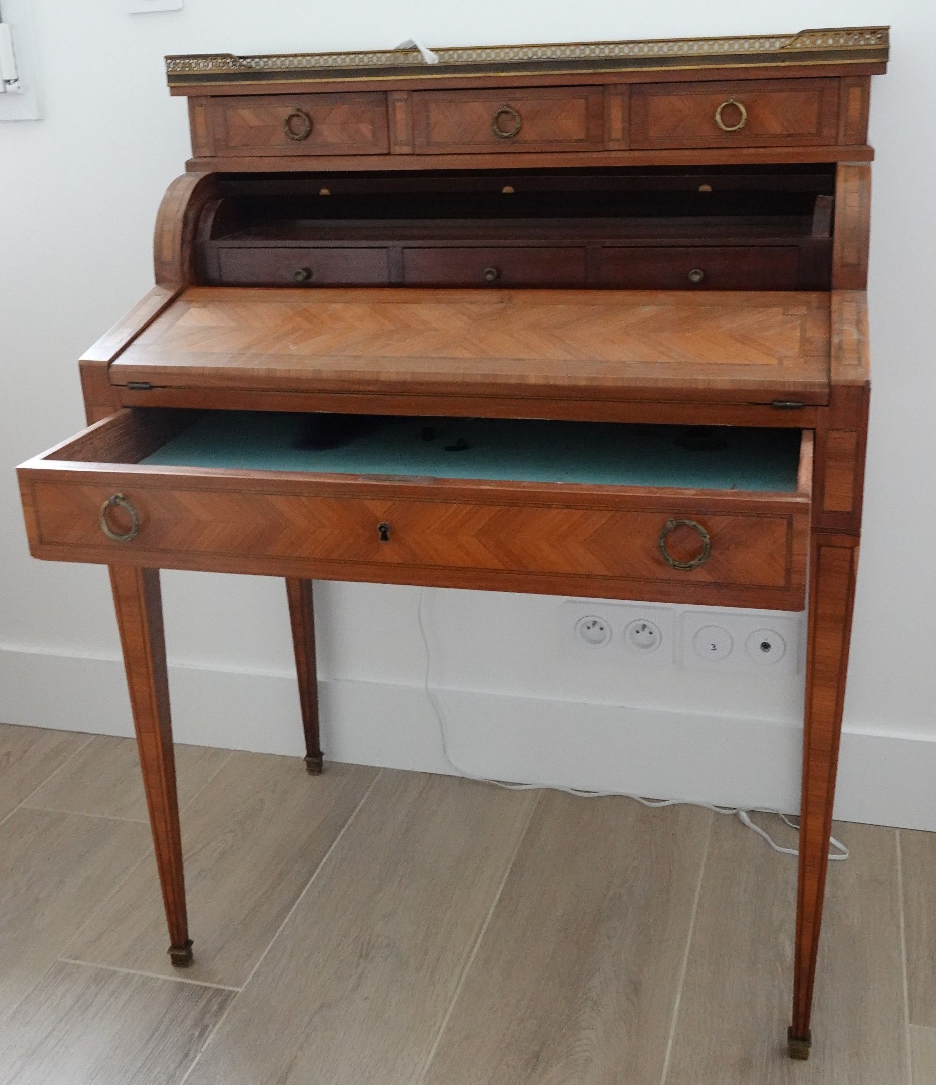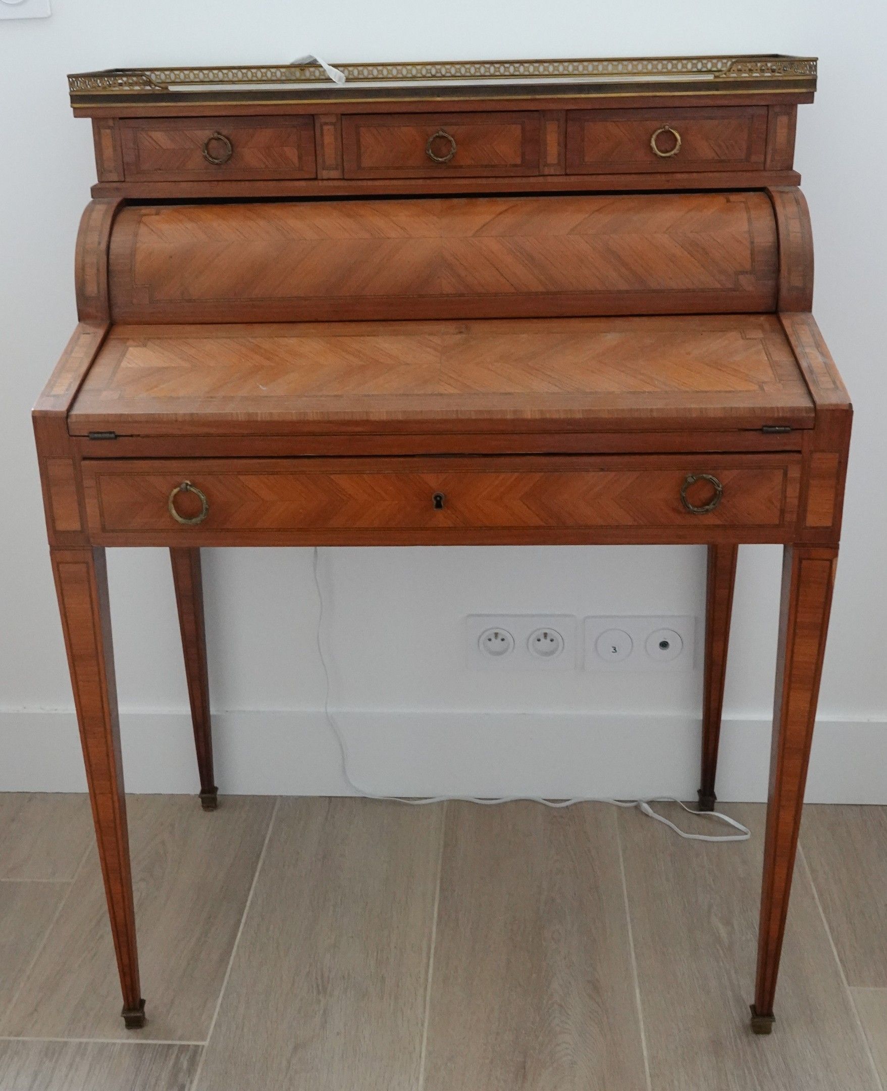 BONHEUR DU JOUR or LADY'S DESKTOP in mahogany veneer with rosewood reserves in frieze underlined by a fillet. It opens with a mechanism operated by a drawer in the waist, opening the scroll and revealing a locker and three drawers. It allows the secretary section to be opened out to reveal a flap. It stands on sheath legs with small hooves. Louis XVI style. Circa 1890.