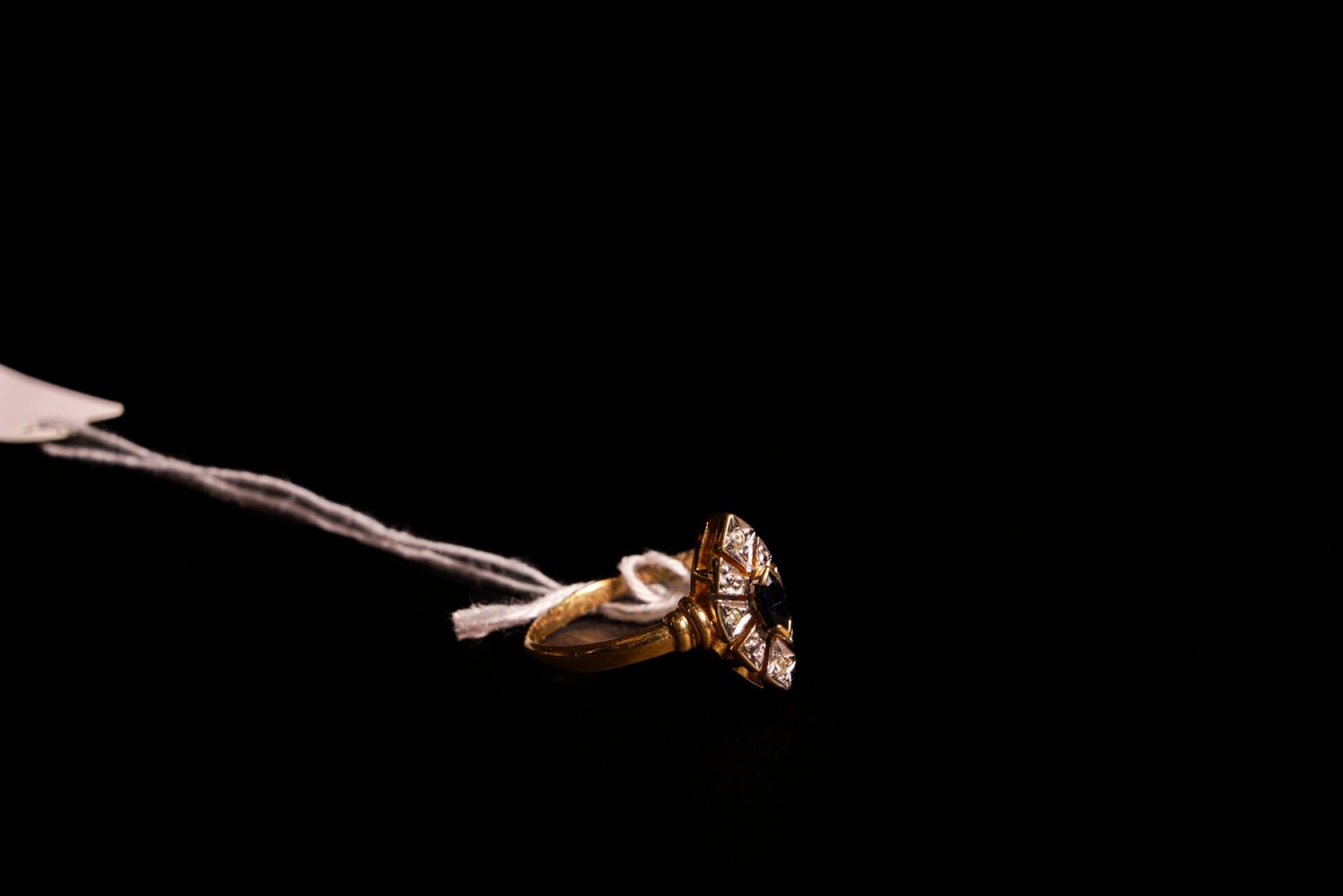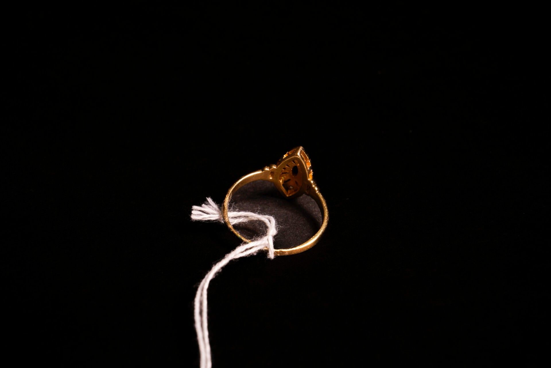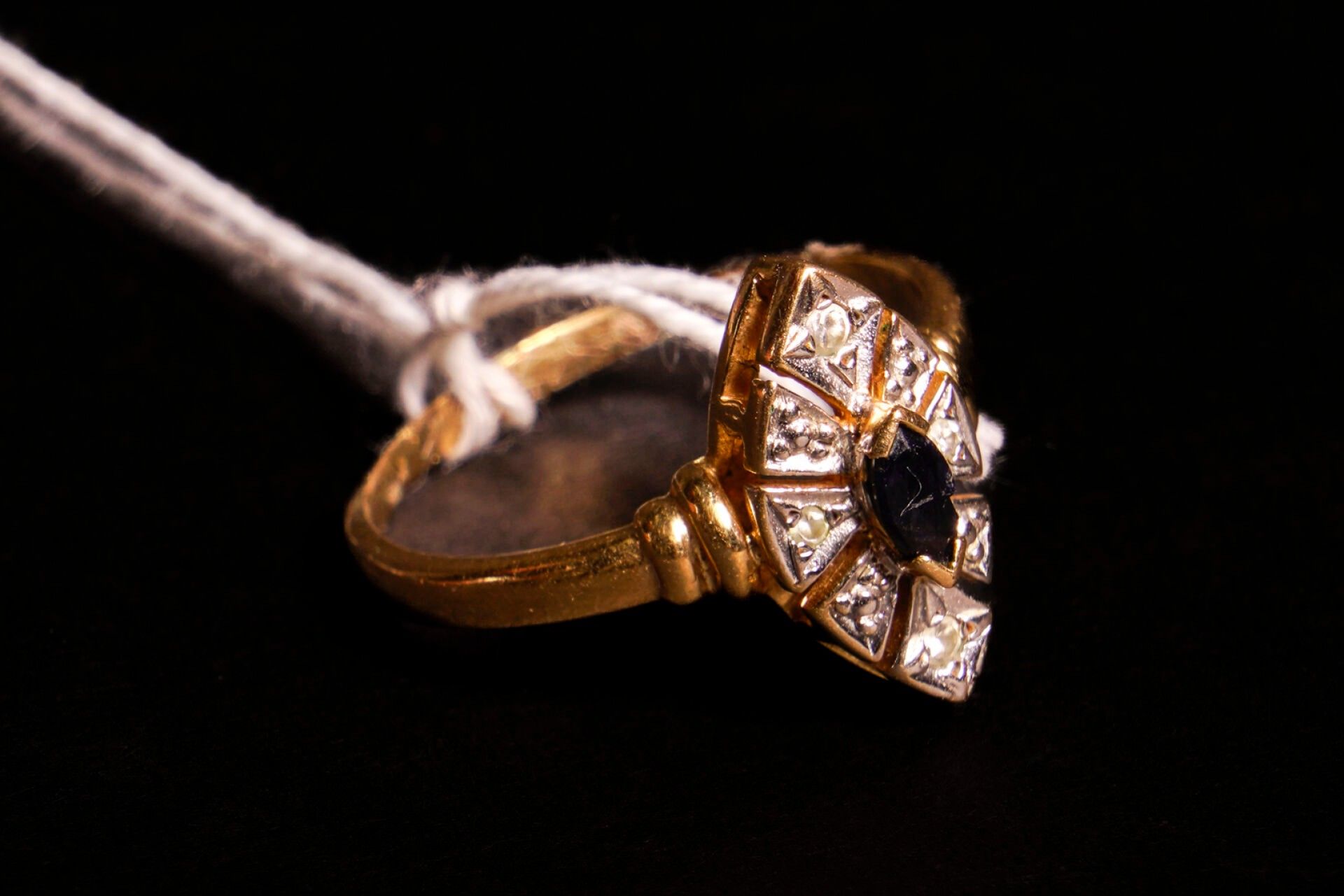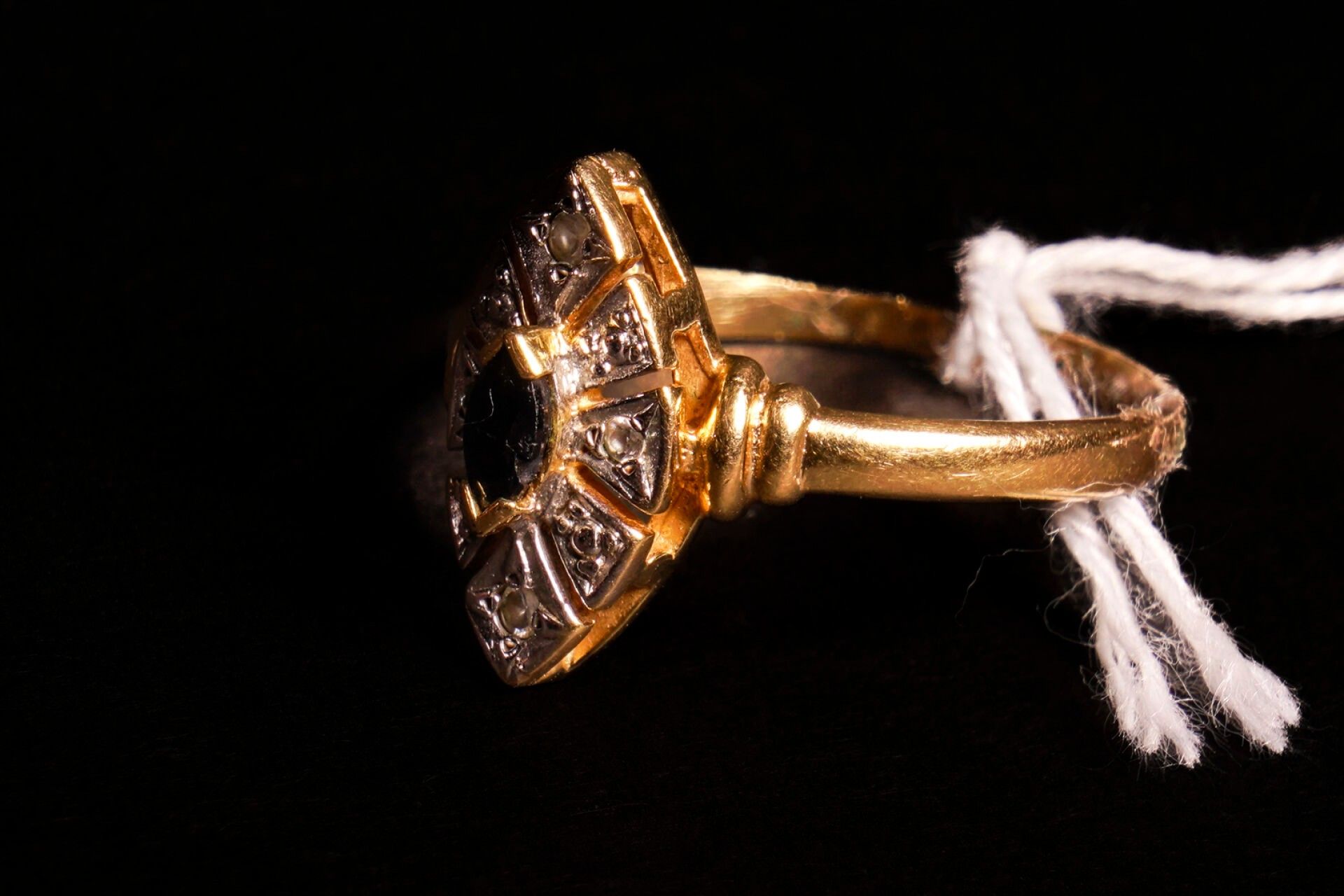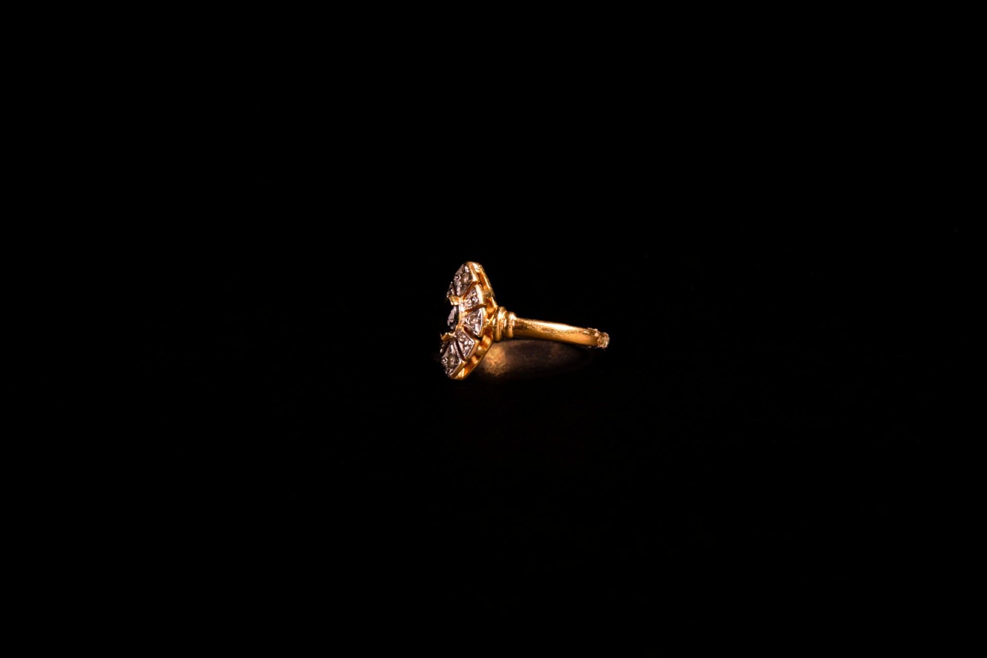 Marquise-shaped gilt metal ring set with white stones and a navette-shaped black stone.