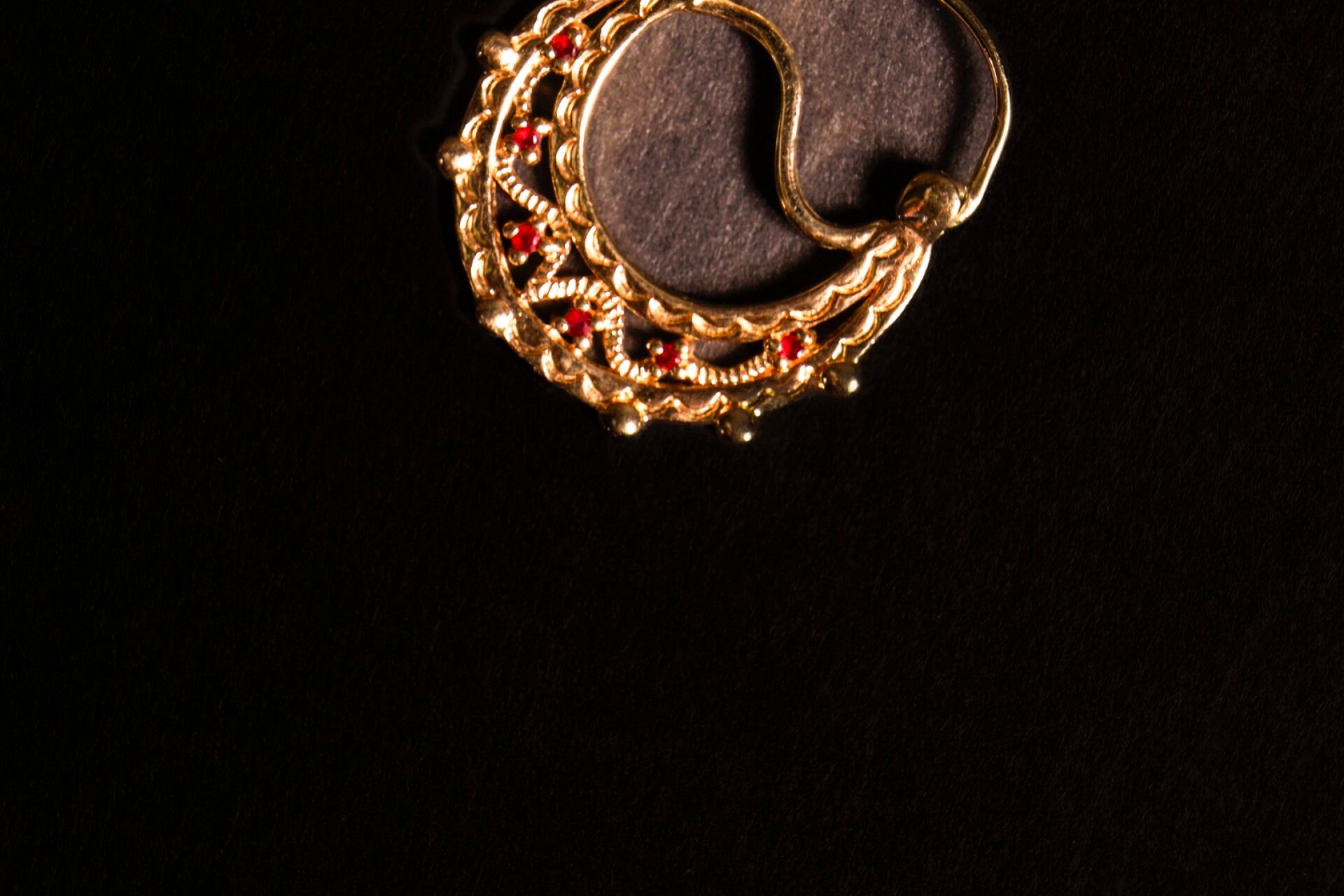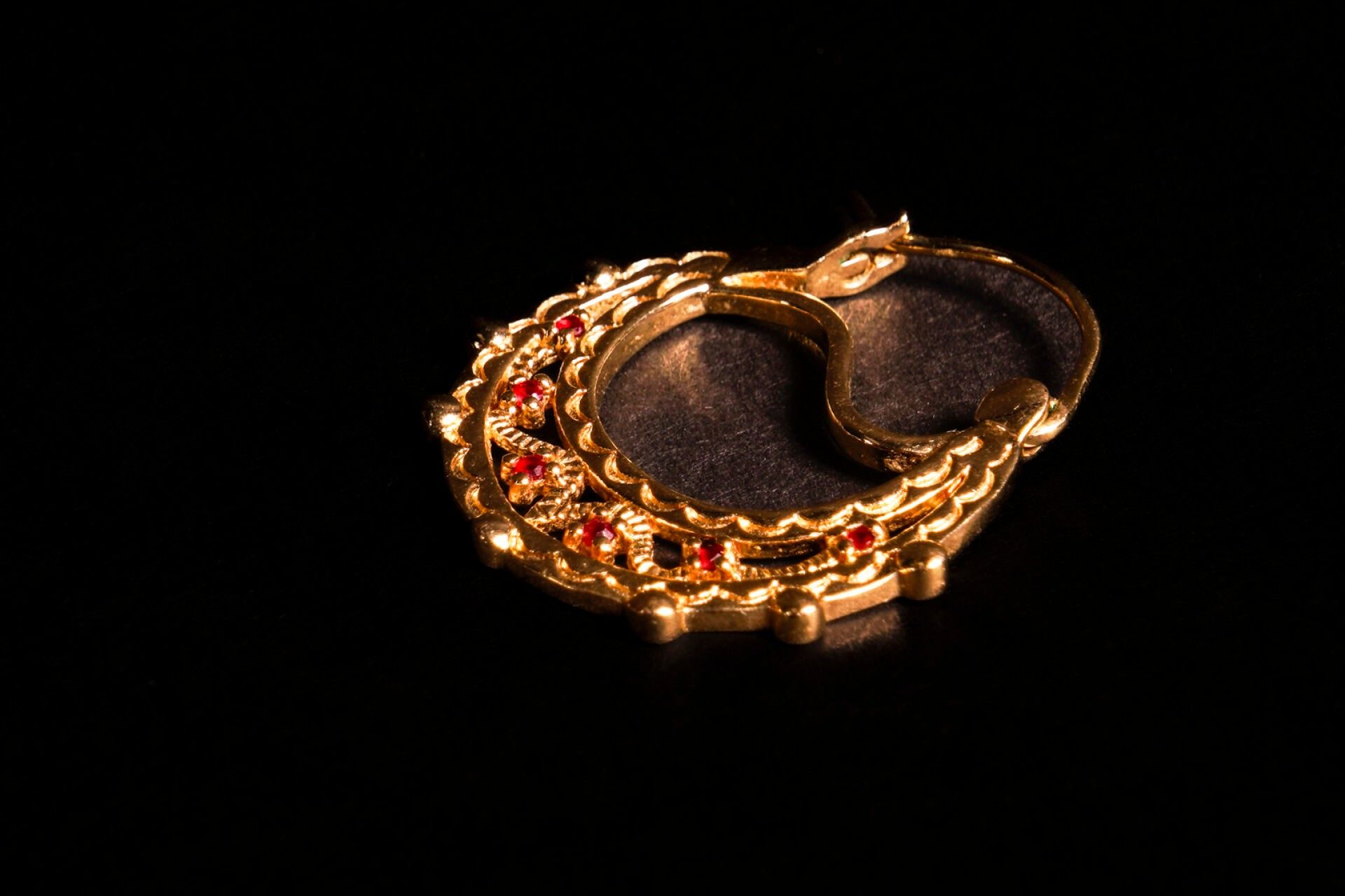 Creole-shaped earring in gold-plated metal adorned with six red stones
