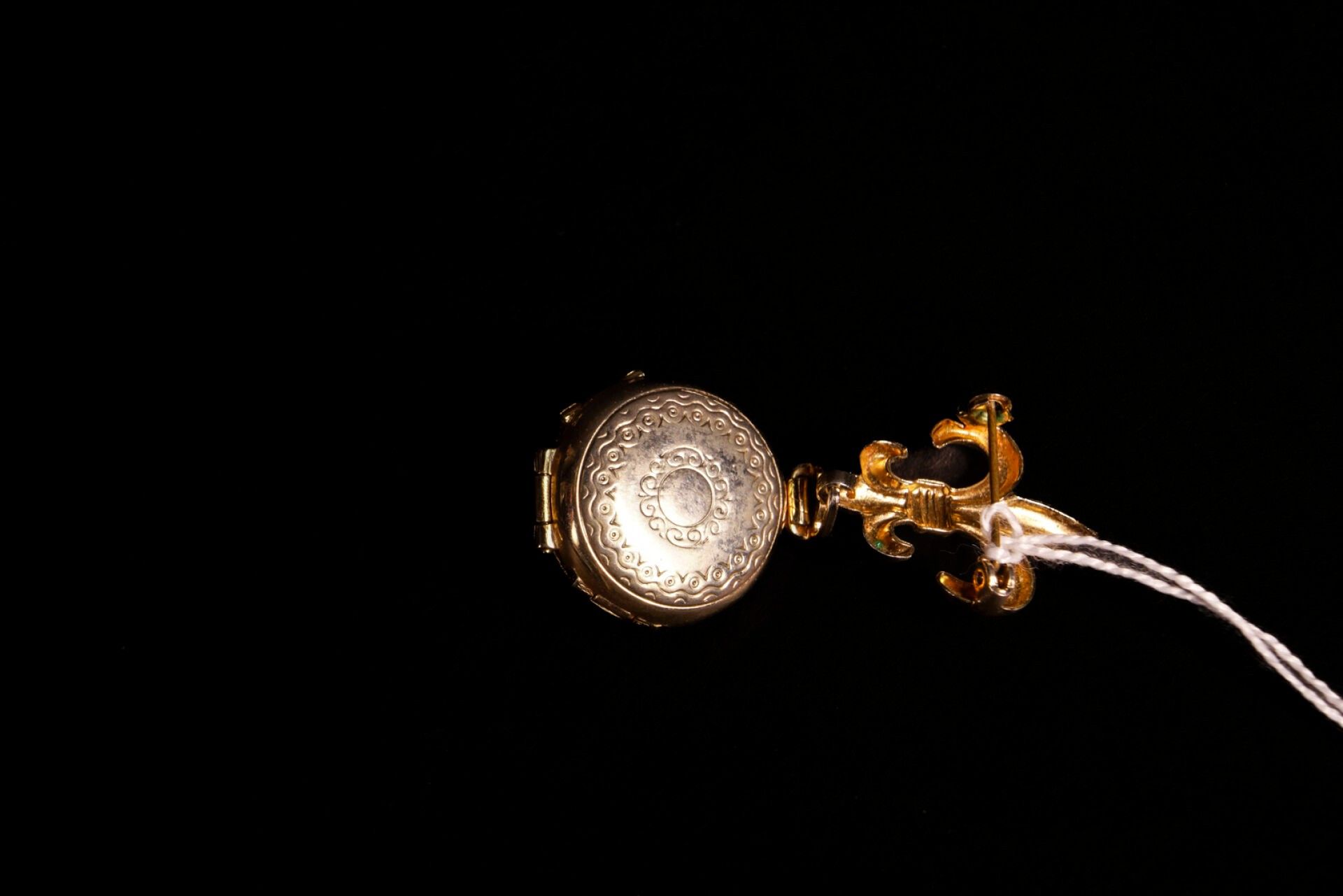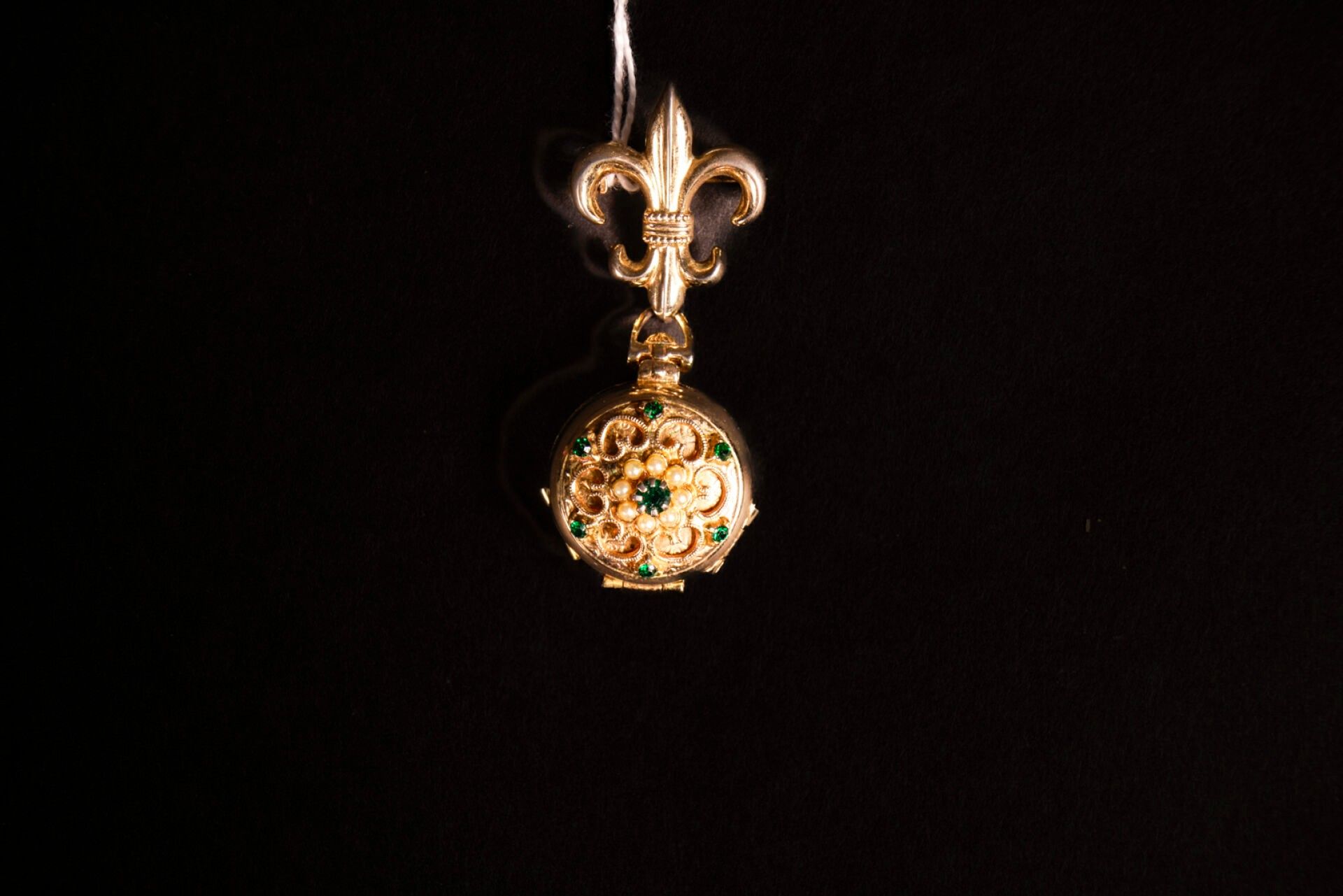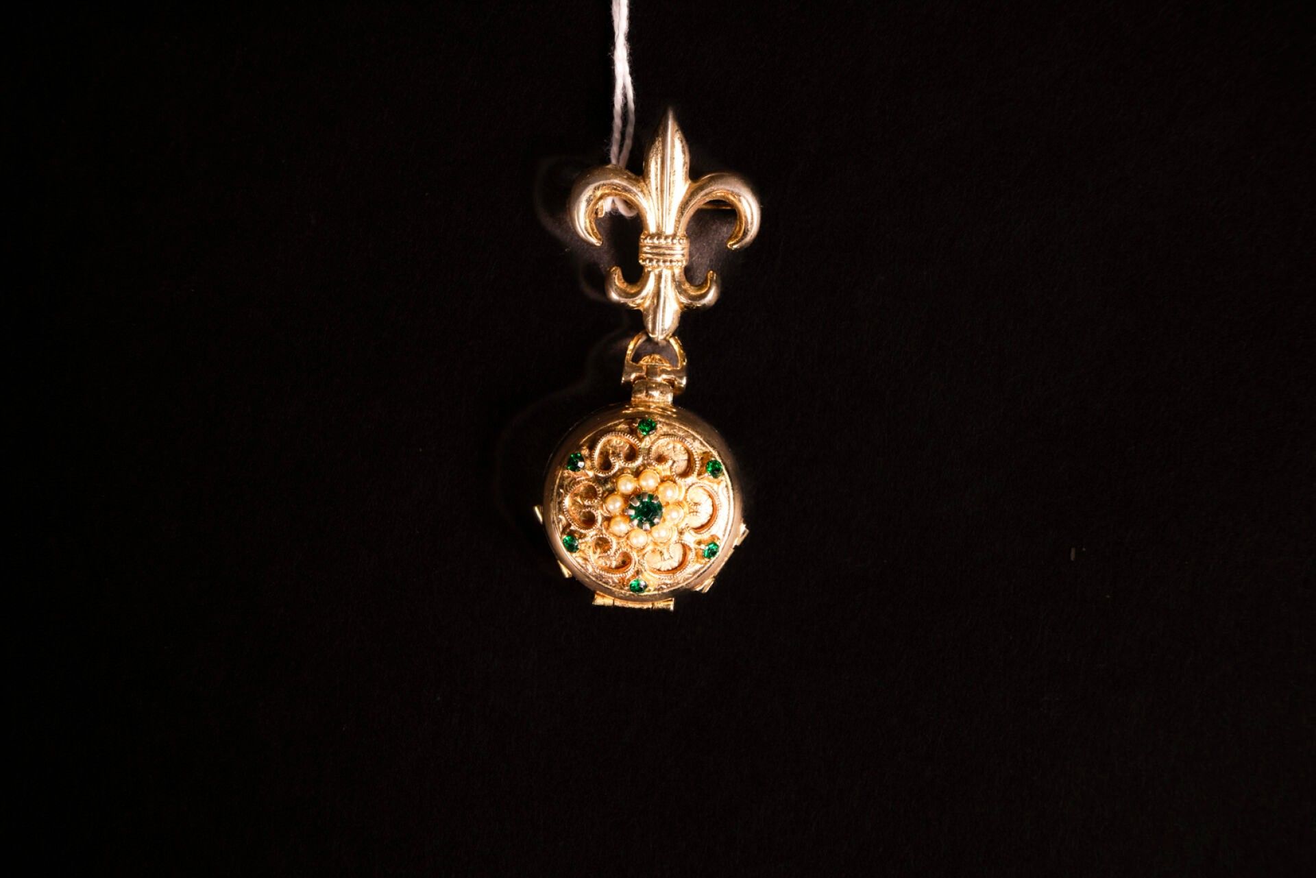 Pendant in gilded metal, cultured pearls and coloured stones. The circular medallion reveals four photo frames and is held by a fleur-de-lis brooch.