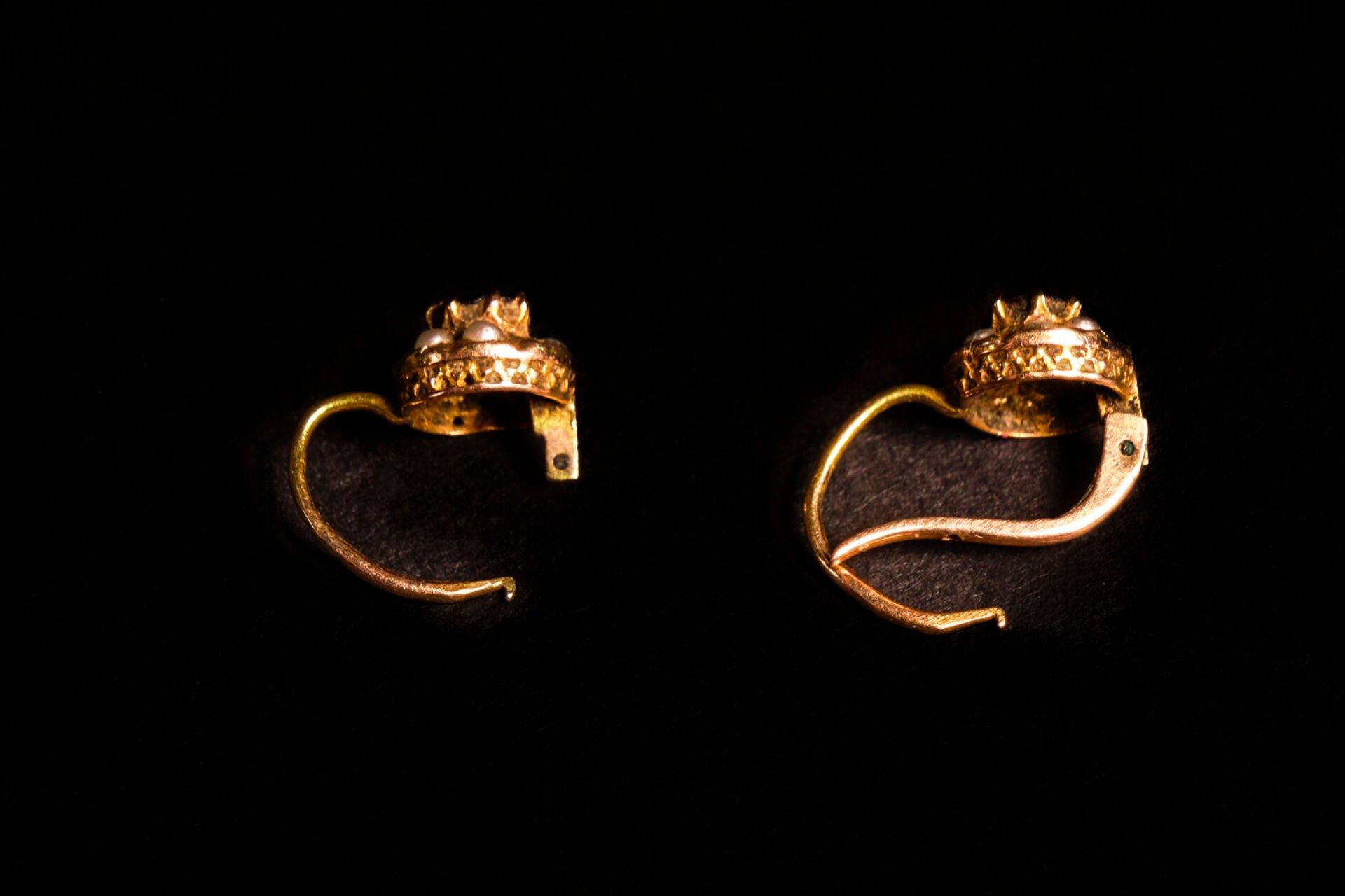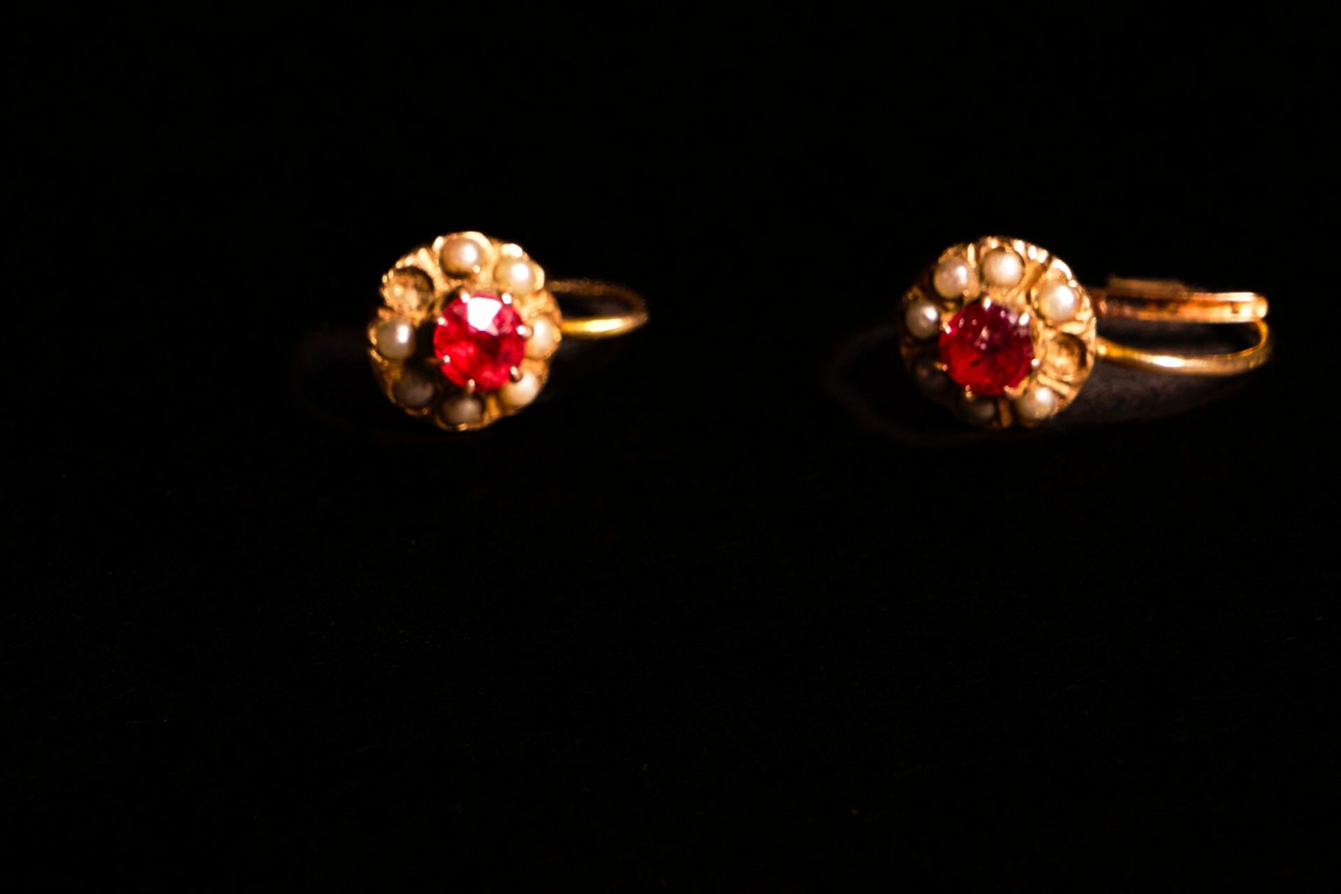 Pair of earrings in yellow gold (750/1000) set with red stones and pearls