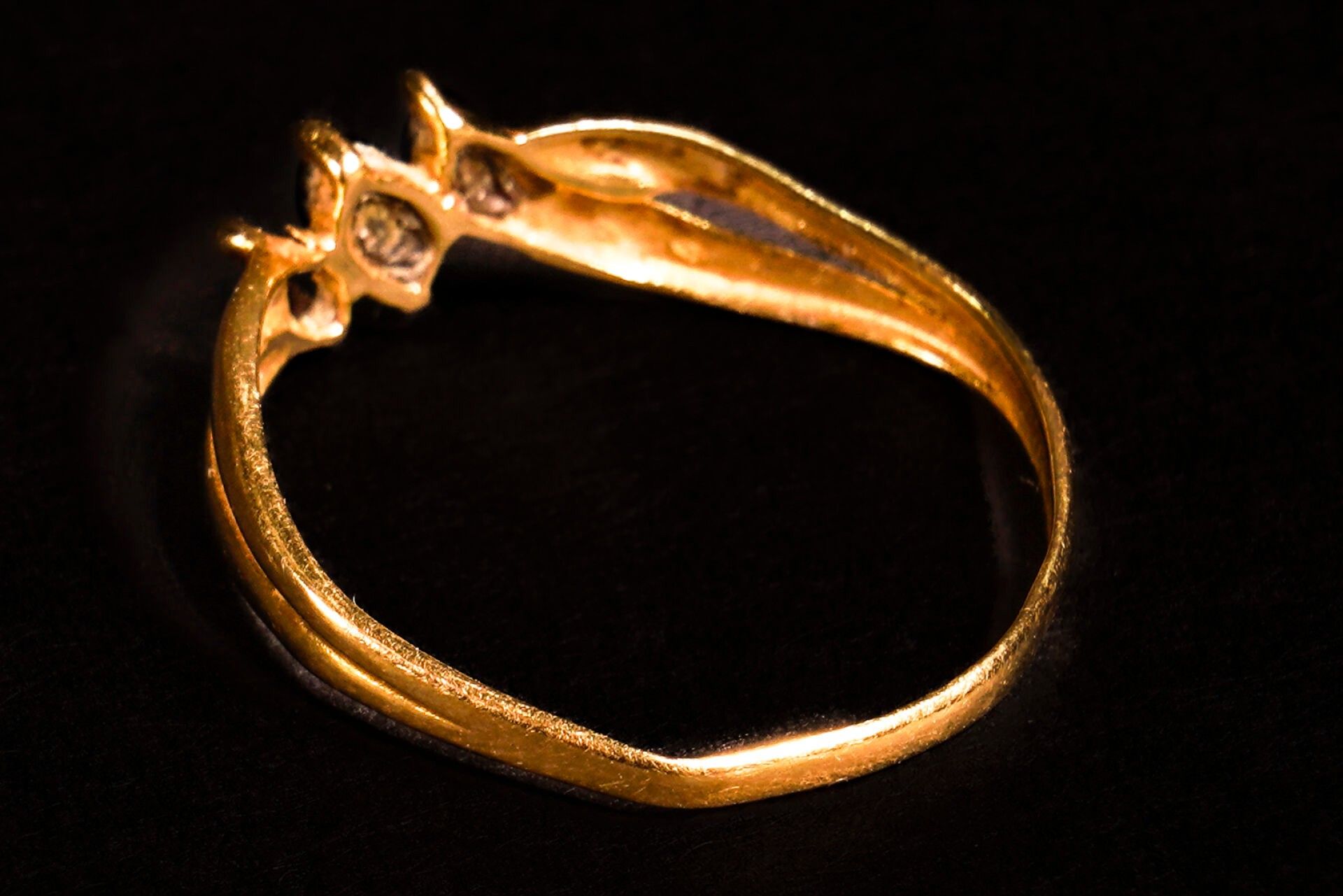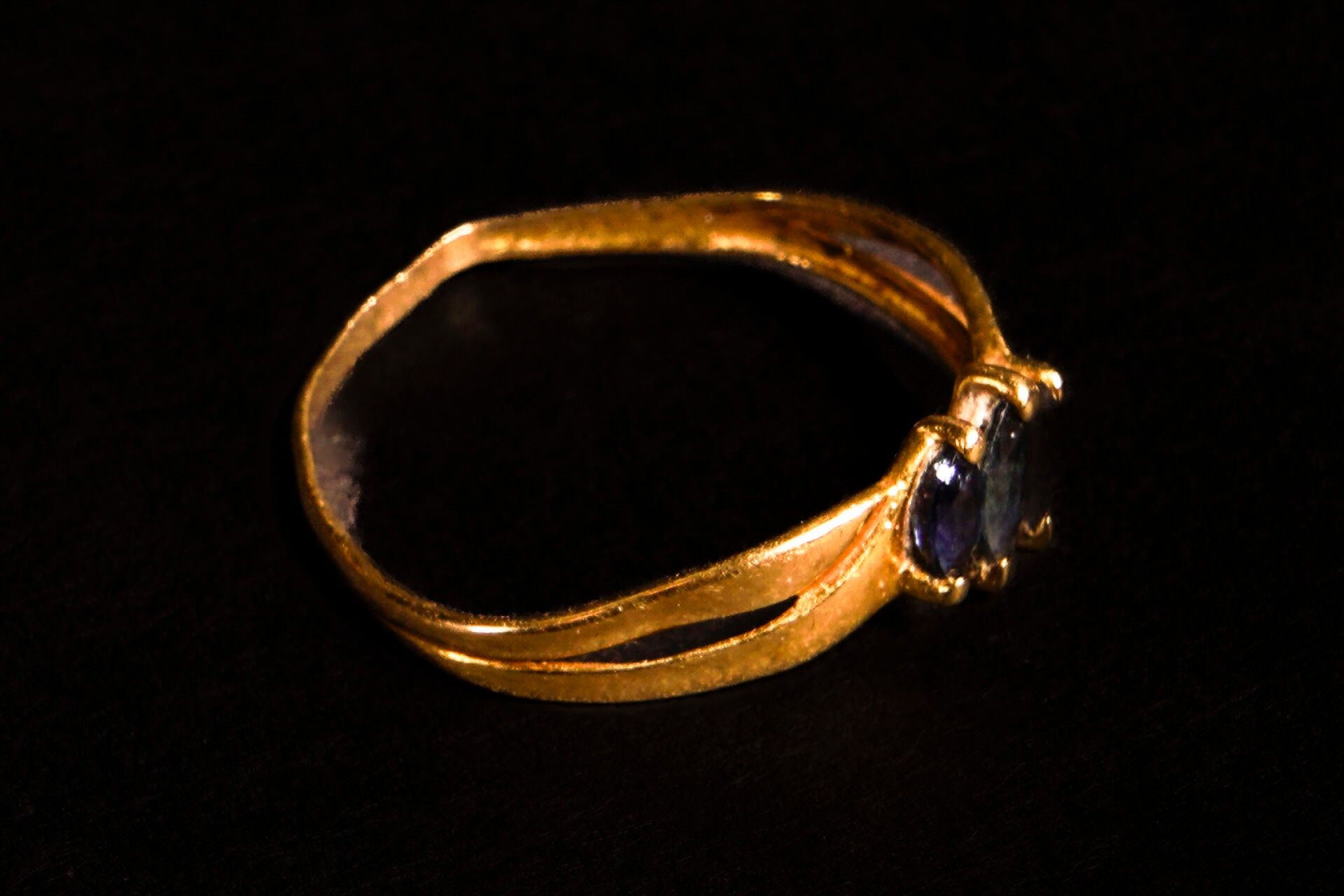 A yellow gold (750/1000) ring set with two diamond-shaped blue stones (Accident).