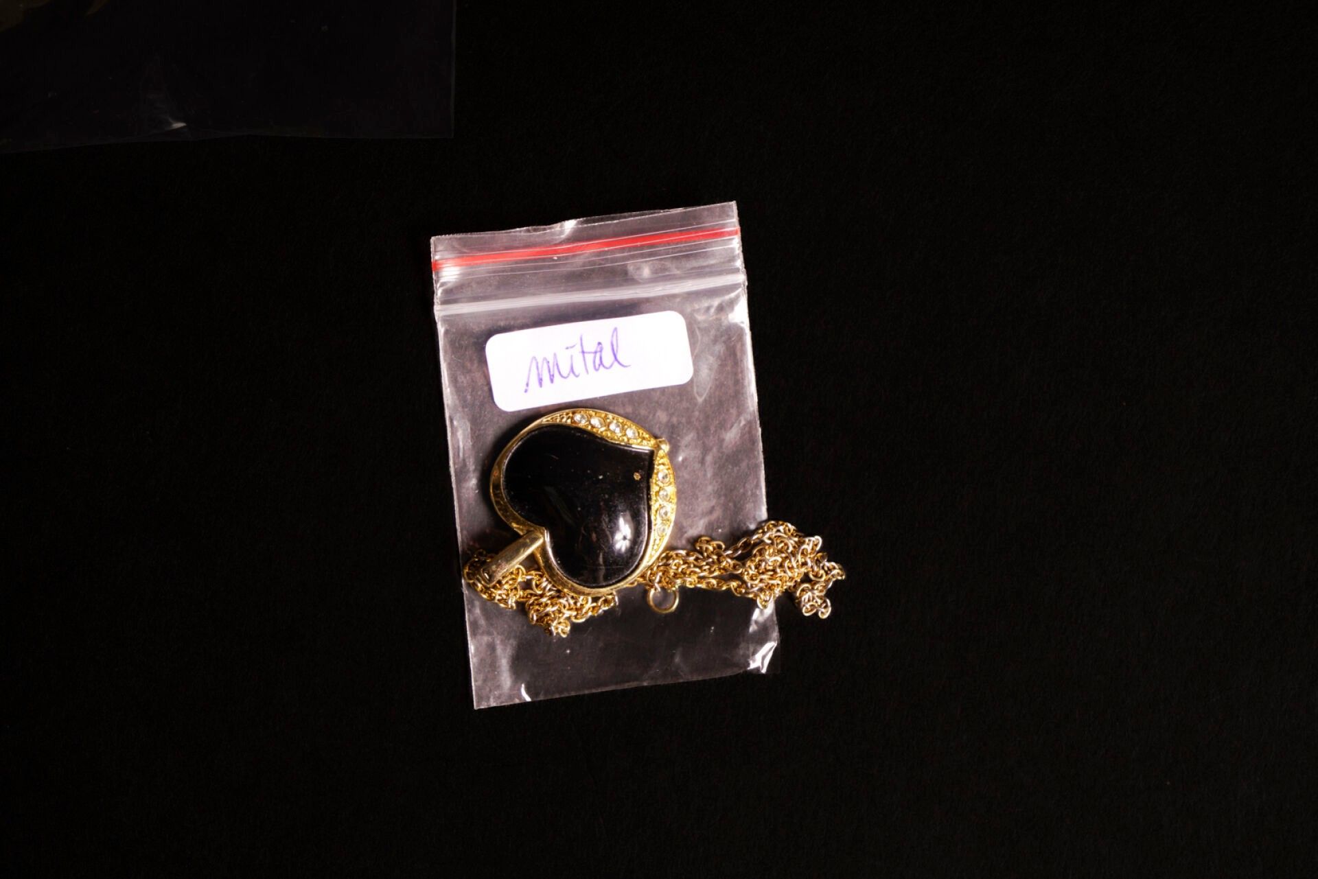 Gold-plated metal, black lacquer and white stone chain and heart pendant