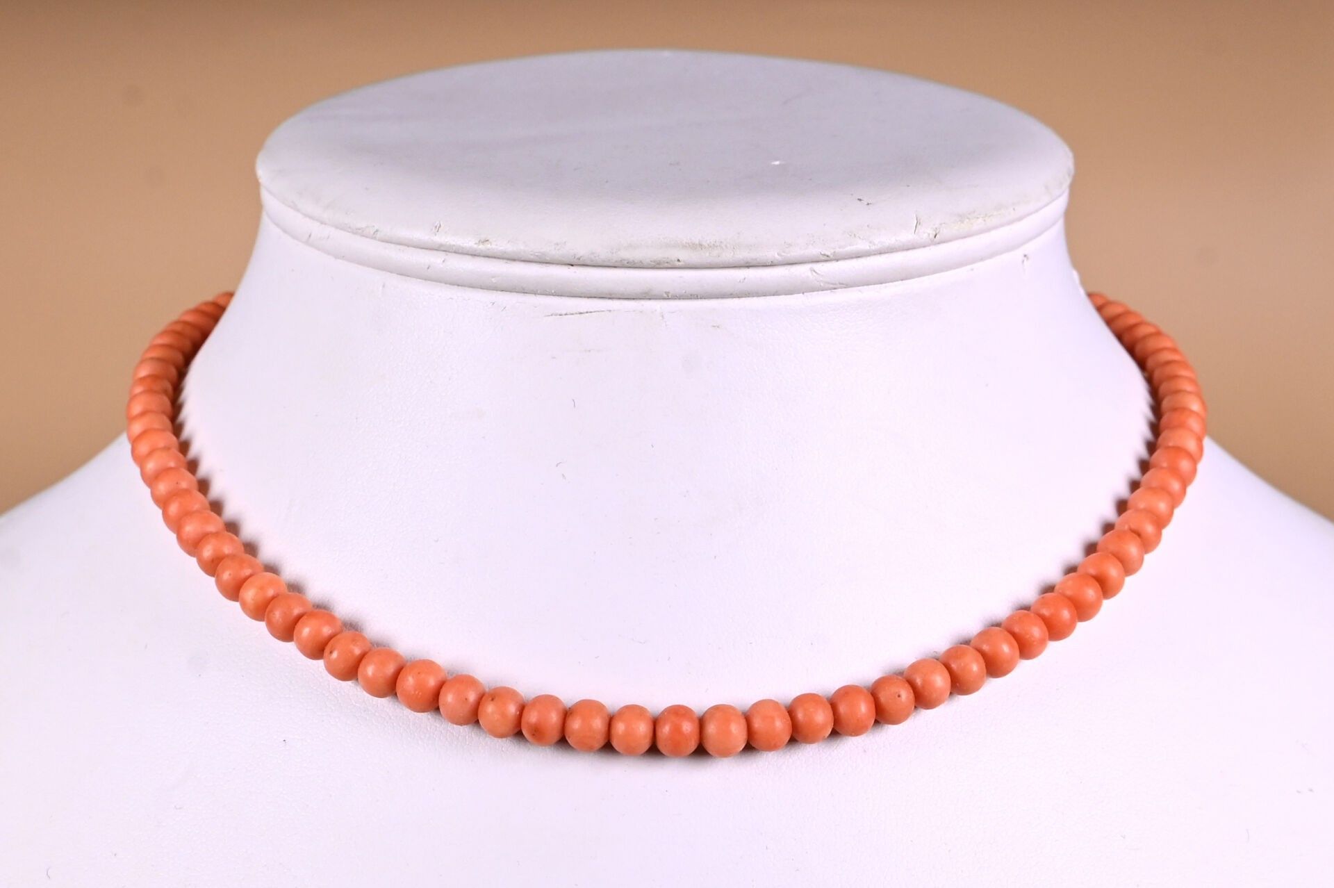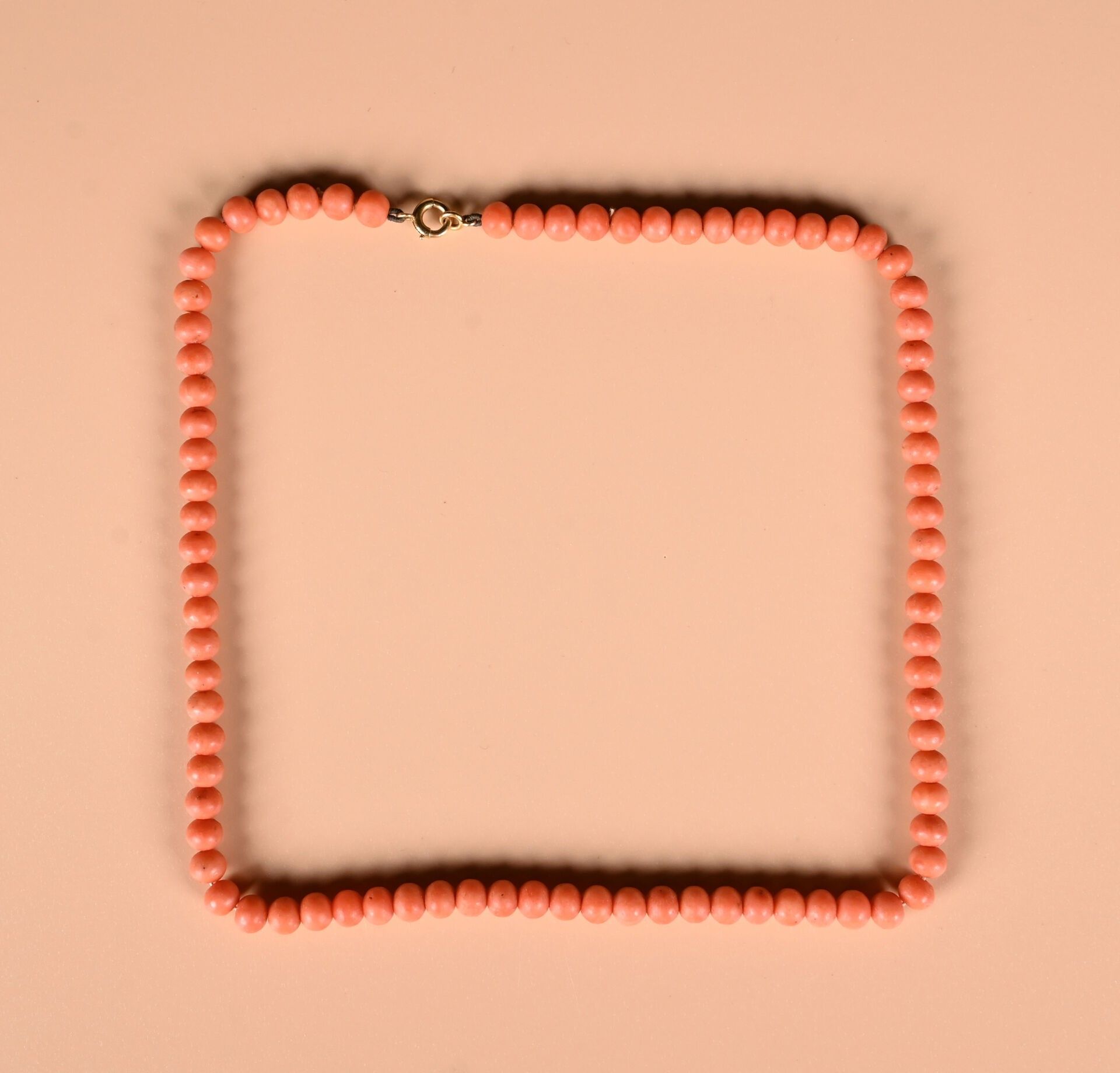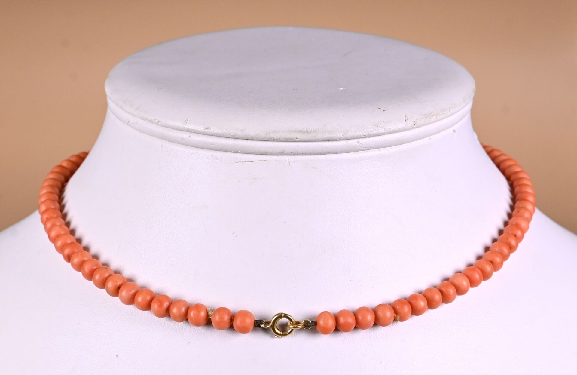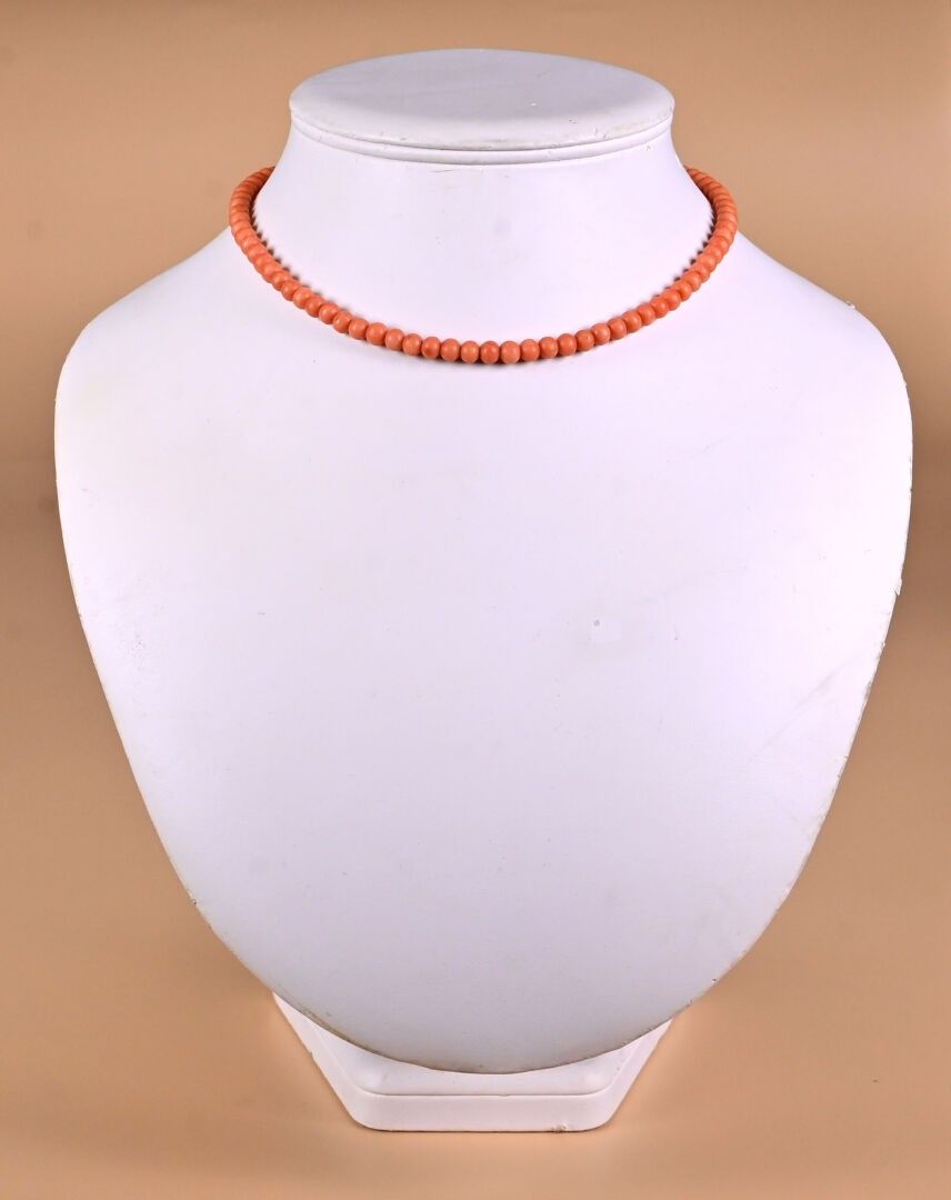 Choker necklace with red coral pearls and clasp in 18K yellow gold 750/1000 (loose thread or missing pearl). Gross weight : 18,04 g. Length: 40.5 cm