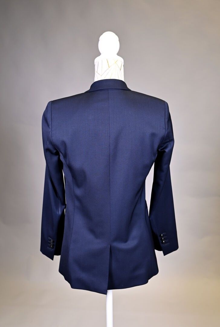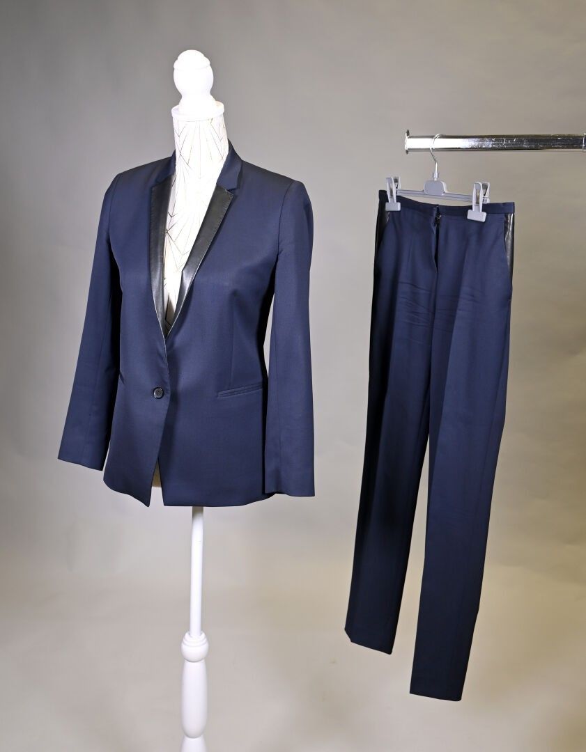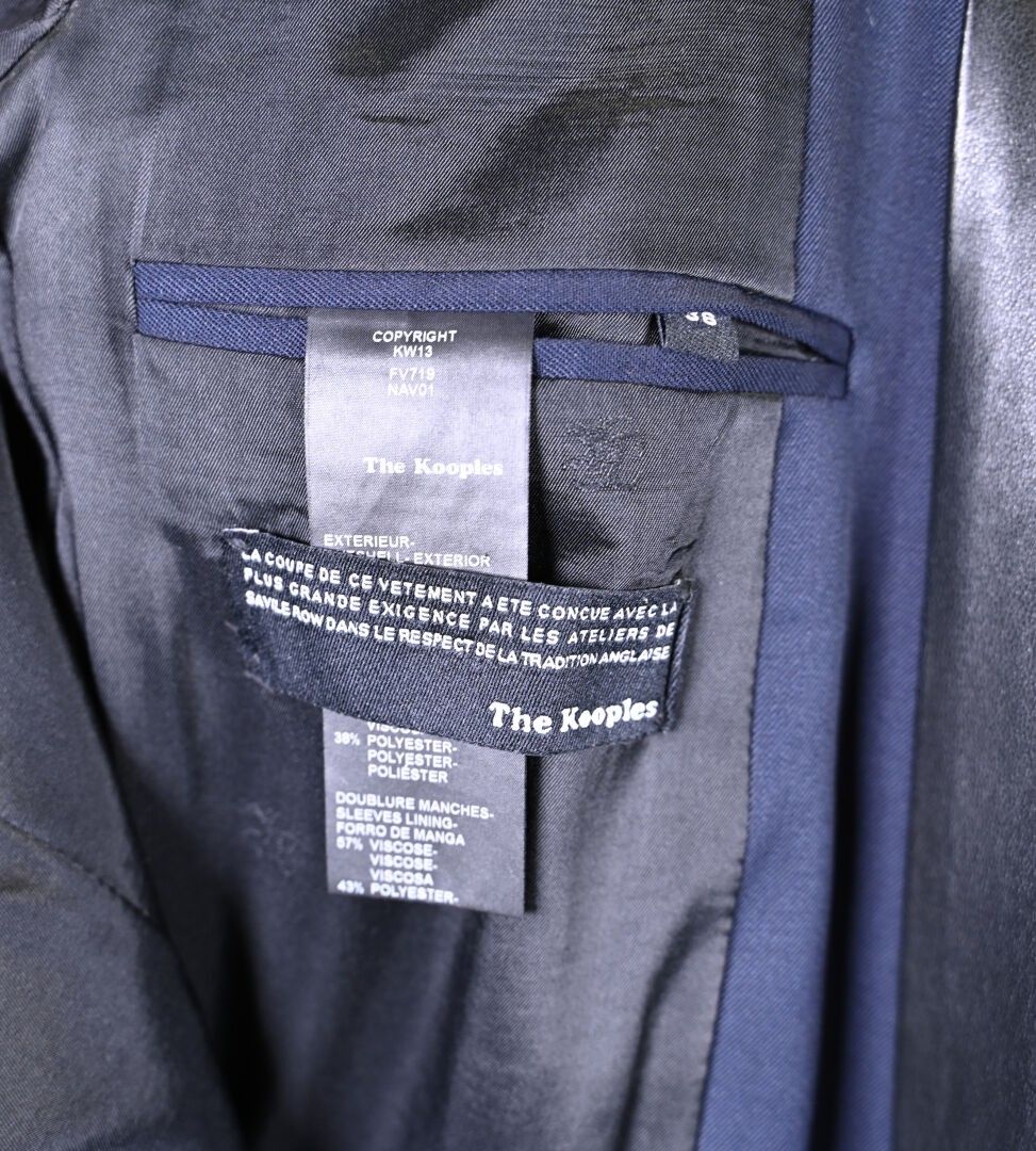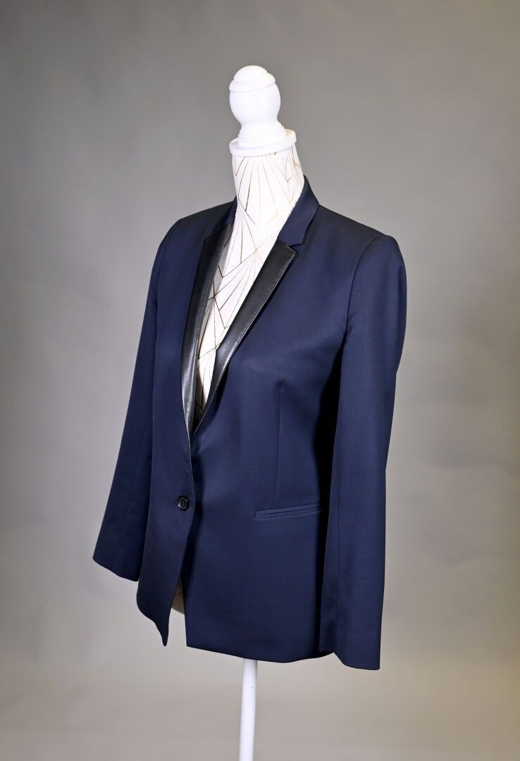 THE KOOPLES. Woman's dinner jacket in navy fabric, black leather collar. Size 36.
