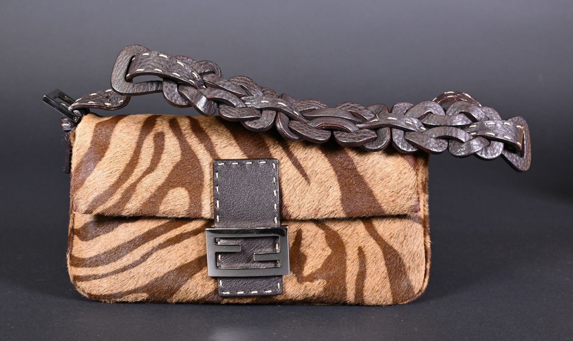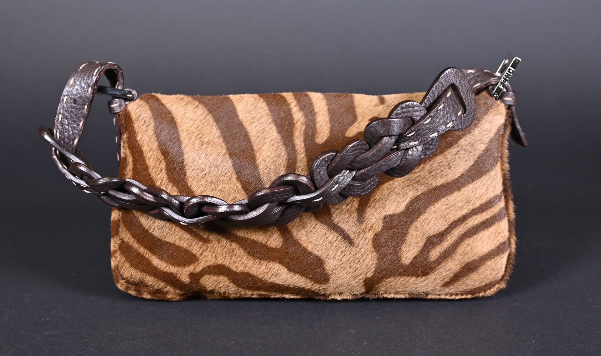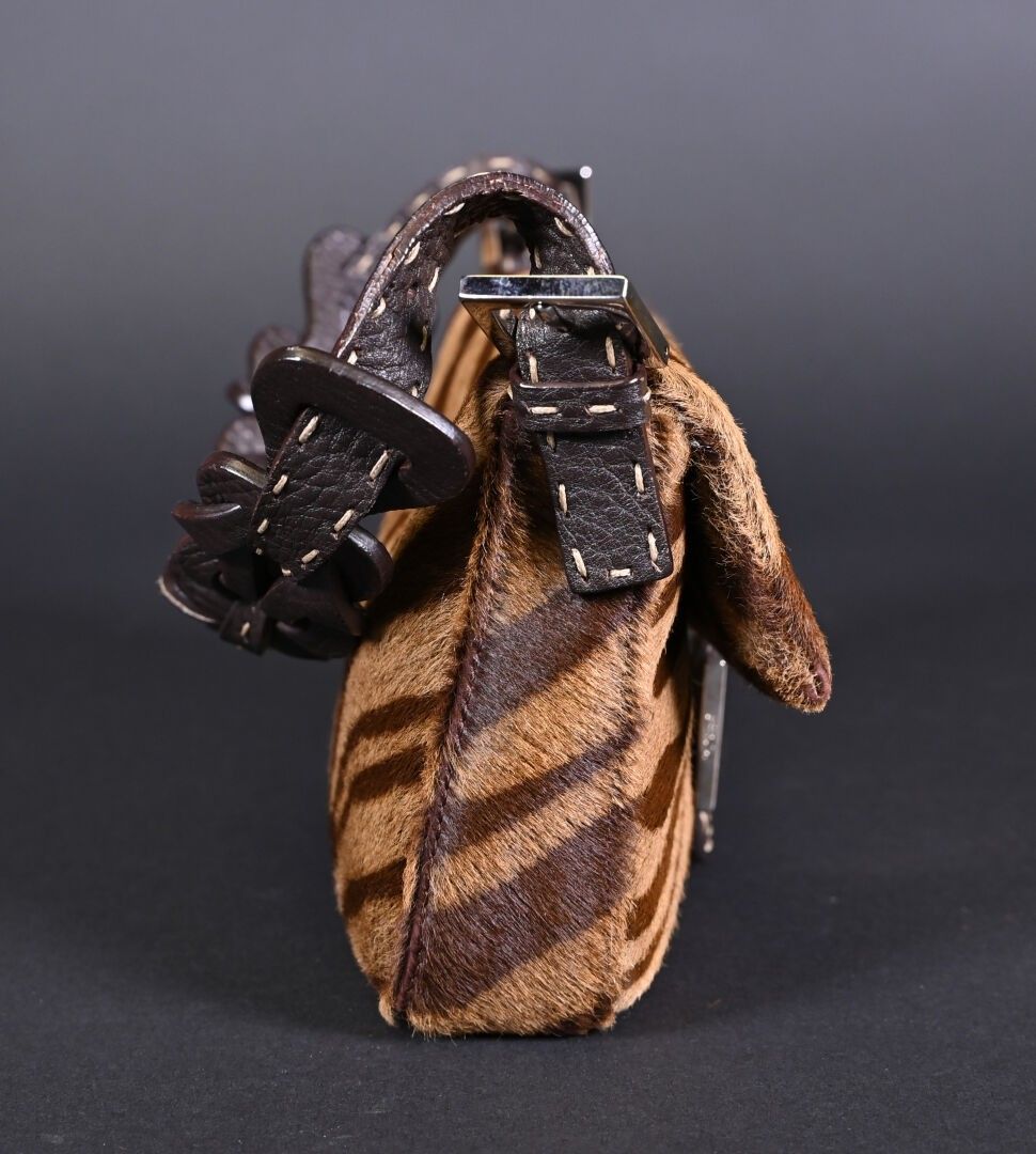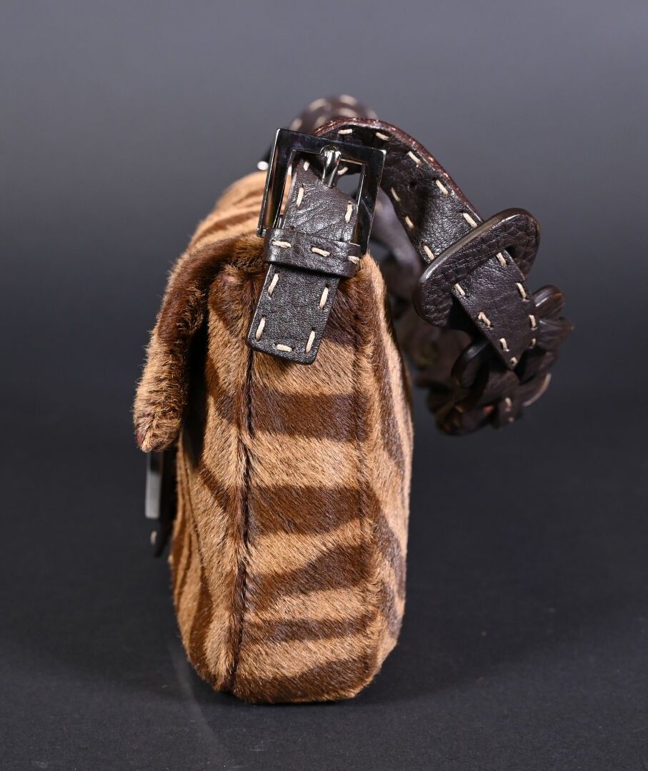 FENDI. Baguette handbag in tiger-stained printed cowhide, Tabacco + Moro limited series. Flap closure, chocolate plaited leather handle. Numbered 266178. With house card, dust bag and box. Excellent condition. Height 15 cm - Width: 28 cm - Depth: 10 cm.