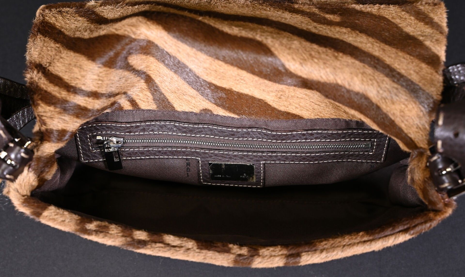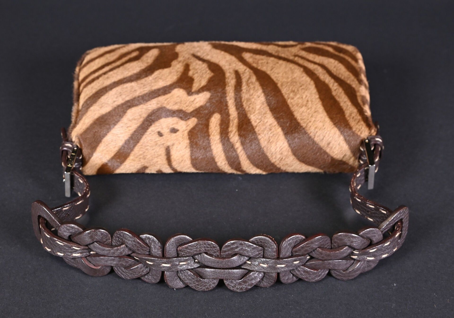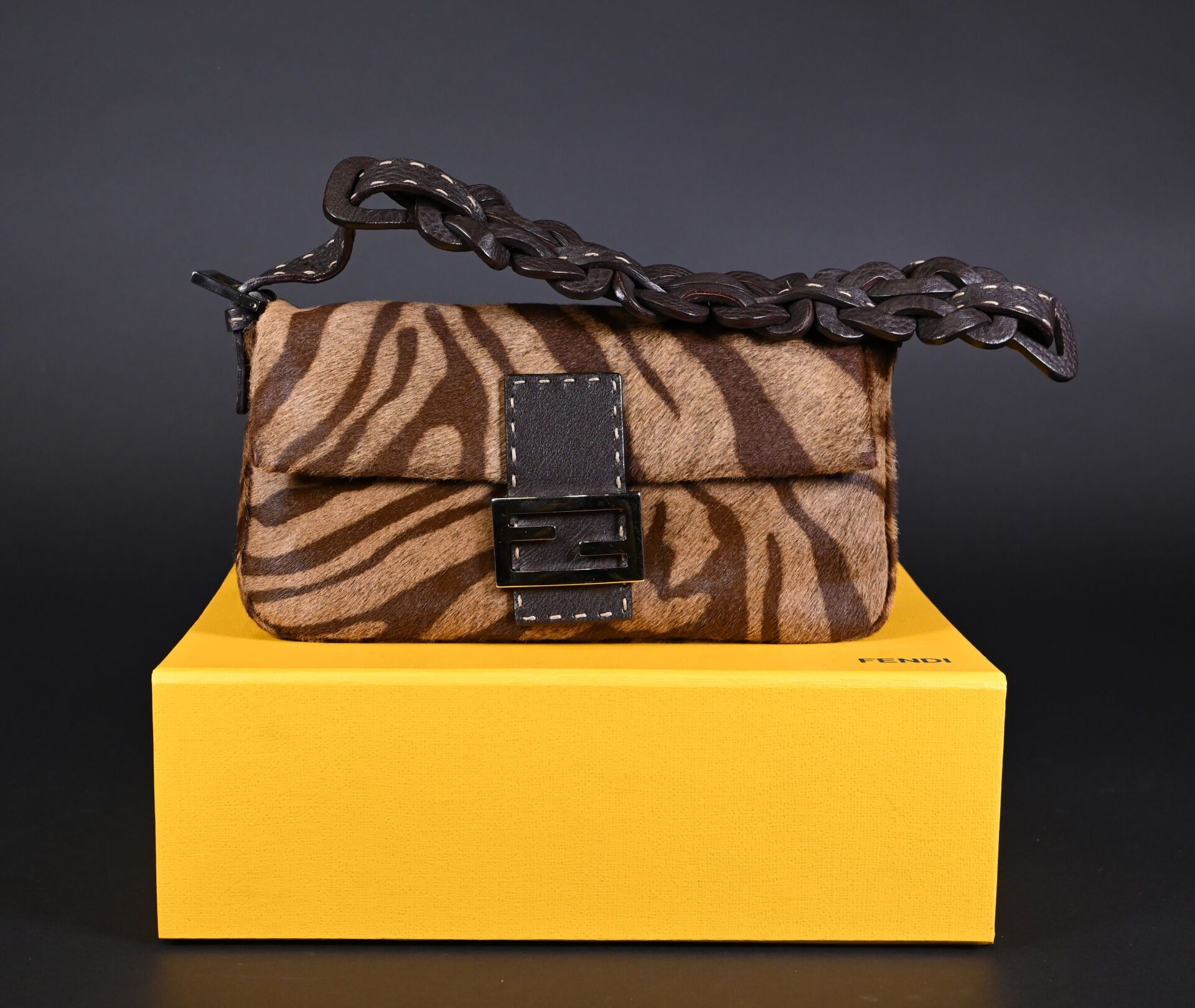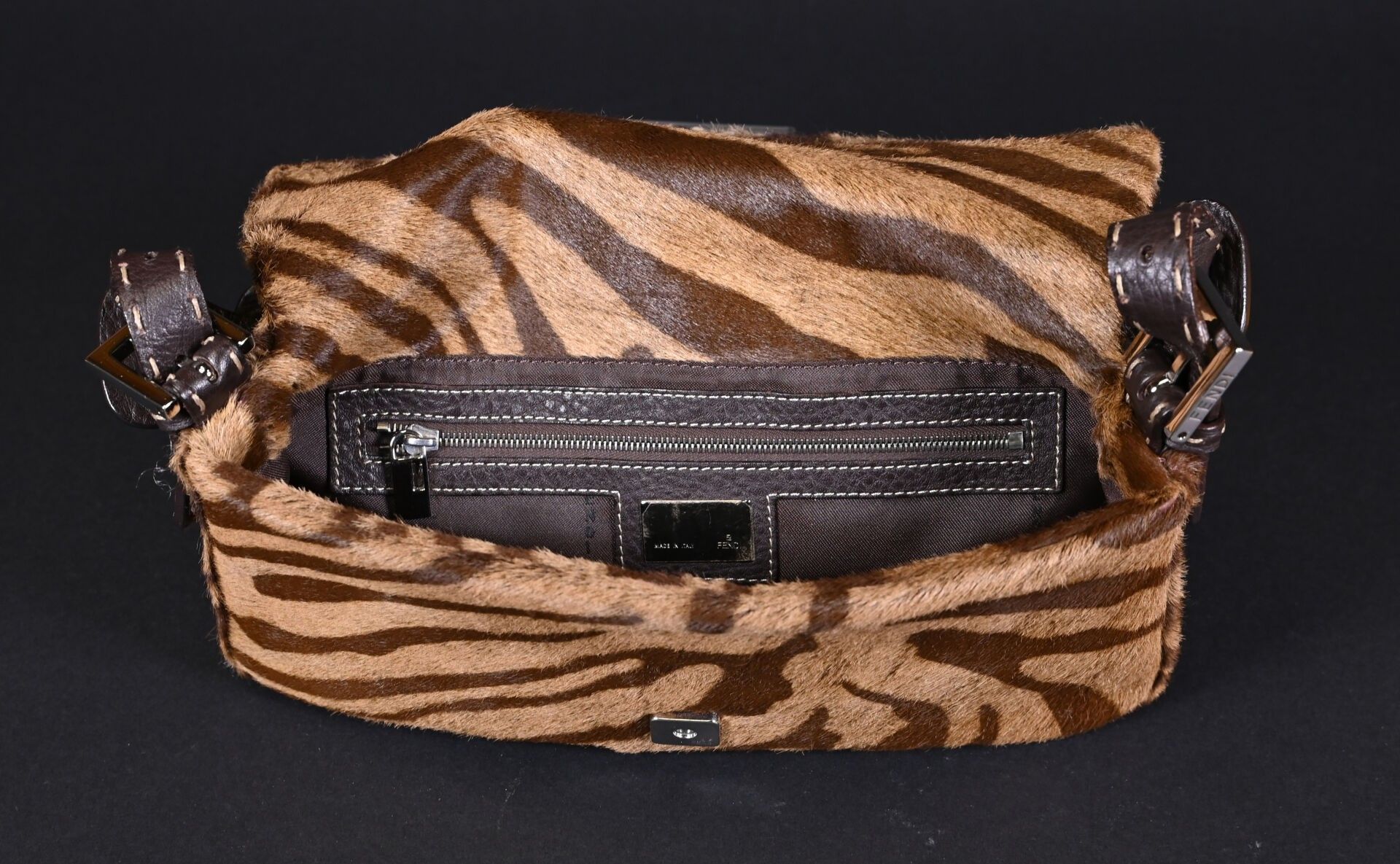 FENDI. Baguette handbag in tiger-stained printed cowhide, Tabacco + Moro limited series. Flap closure, chocolate plaited leather handle. Numbered 266178. With house card, dust bag and box. Excellent condition. Height 15 cm - Width: 28 cm - Depth: 10 cm.