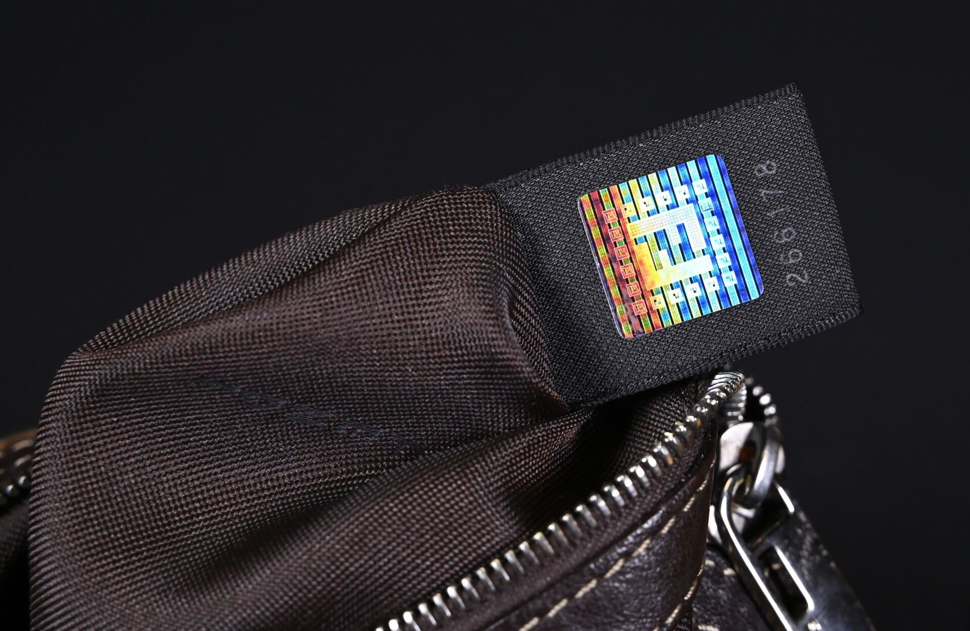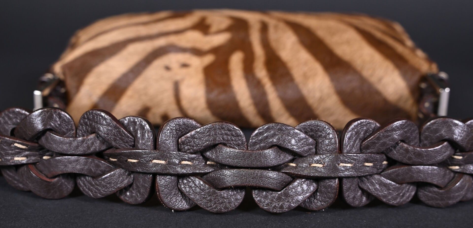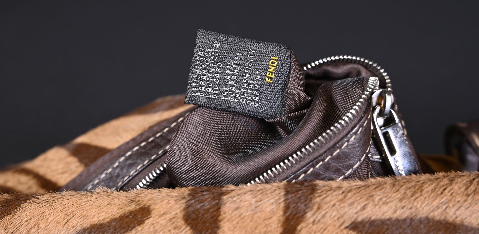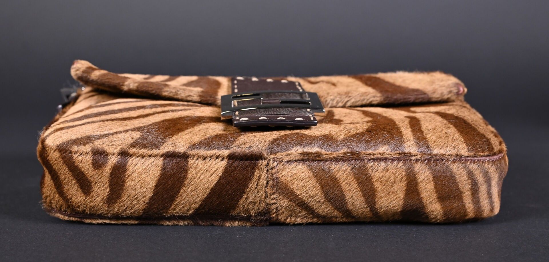 FENDI. Baguette handbag in tiger-stained printed cowhide, Tabacco + Moro limited series. Flap closure, chocolate plaited leather handle. Numbered 266178. With house card, dust bag and box. Excellent condition. Height 15 cm - Width: 28 cm - Depth: 10 cm.