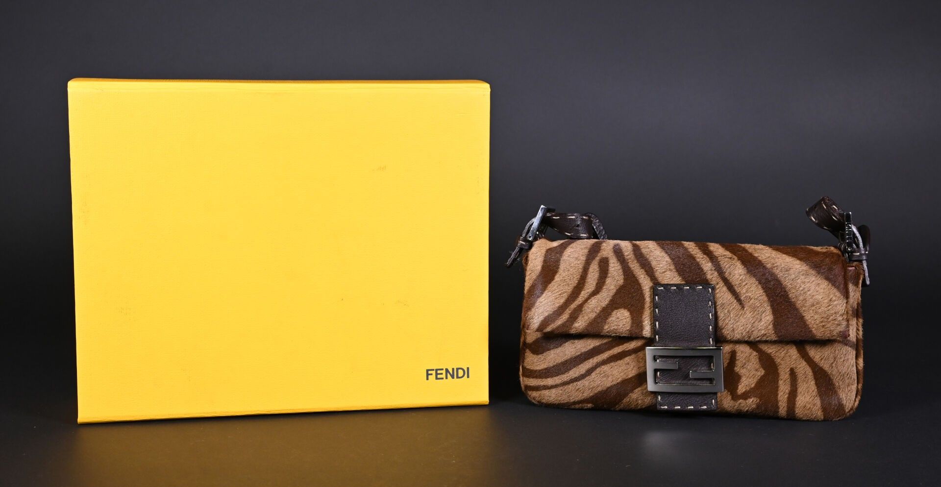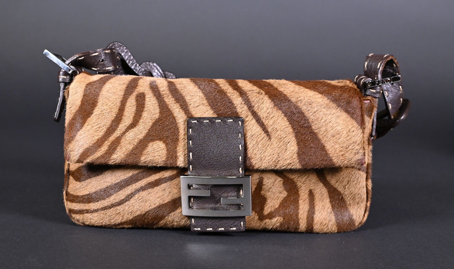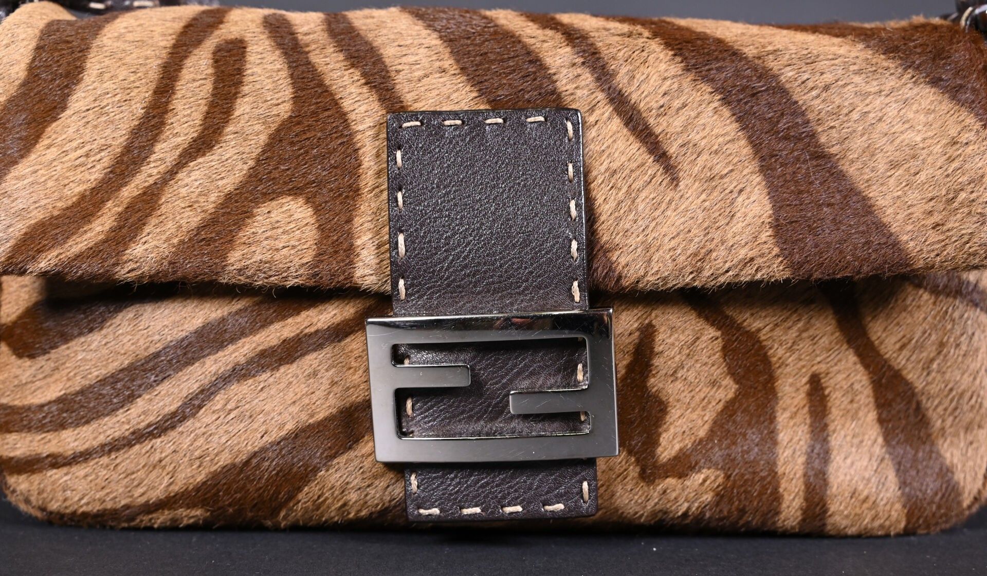 Premium FENDI. Baguette handbag in tiger-stained printed cowhide, Ta…